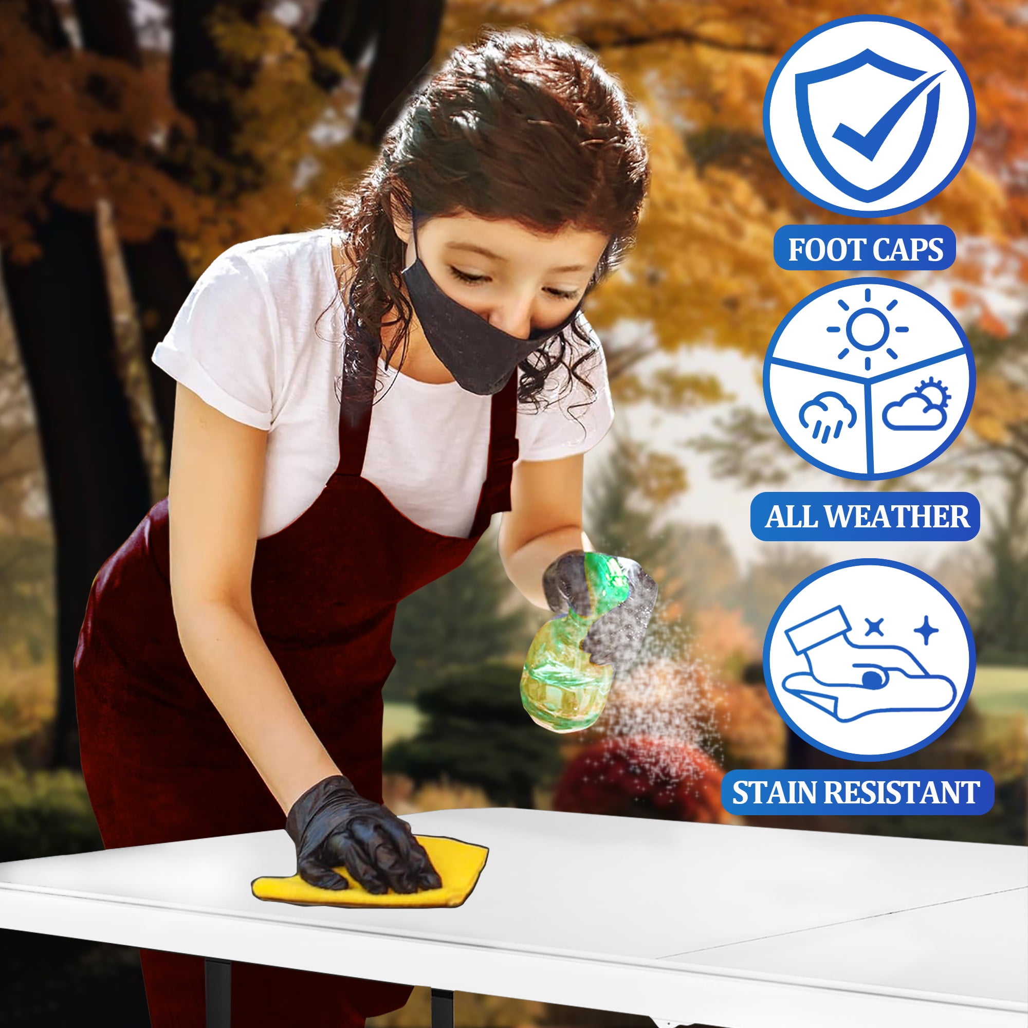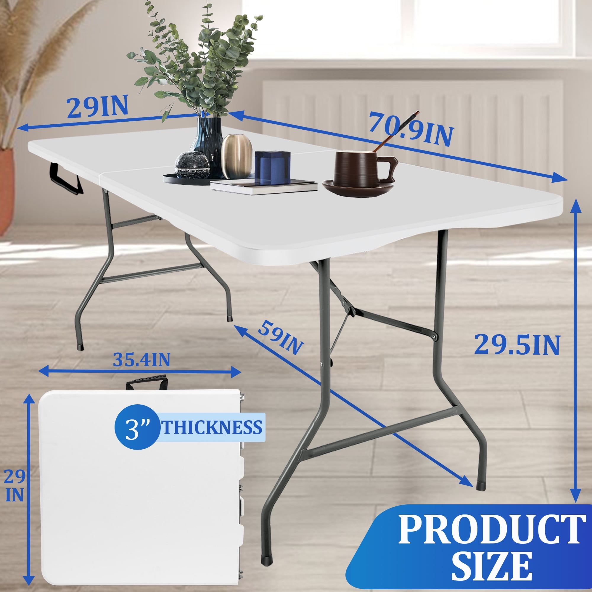 Effortless Portability: Weighing only 24.7 lbs, our 6FT Folding Table with a convenient carry handle ensures easy transport. The foldable design and sturdy construction make it perfect for indoor/outdoor activities. Frame tubing diameter: 25mm for enhanced stability. Space-Saving Design: Maximize your space with our 6FT Plastic Folding Table. With a folded dimension of L 35.43in * W 30 in * H 3.14 in, it’s easy to store behind furniture. Unfold to L 72in * W 30in * H 29in, accommodating 8-10 adults comfortably. Versatile Indoor/Outdoor Use: Host weddings, holiday parties, or family gatherings effortlessly with our 6FT Folding Table. The white design adds elegance, while the foldable feature makes it suitable for various activities like barbecues and home office workstations. Instant Setup, No Hassle: Our Folding Table requires no assembly. The foldable design allows you to open and close it within seconds, making it a hassle-free choice for picnics, parties, camping, and office events. Enjoy the convenience without the need for assembling. Sturdy and Durable Construction: With a heavy-duty top and powder-coated steel legs, our Folding Table guarantees stability and durability. The uniform load-bearing capacity of 500 lbs ensures a reliable surface for various activities, providing a safe and secure tabletop experience.