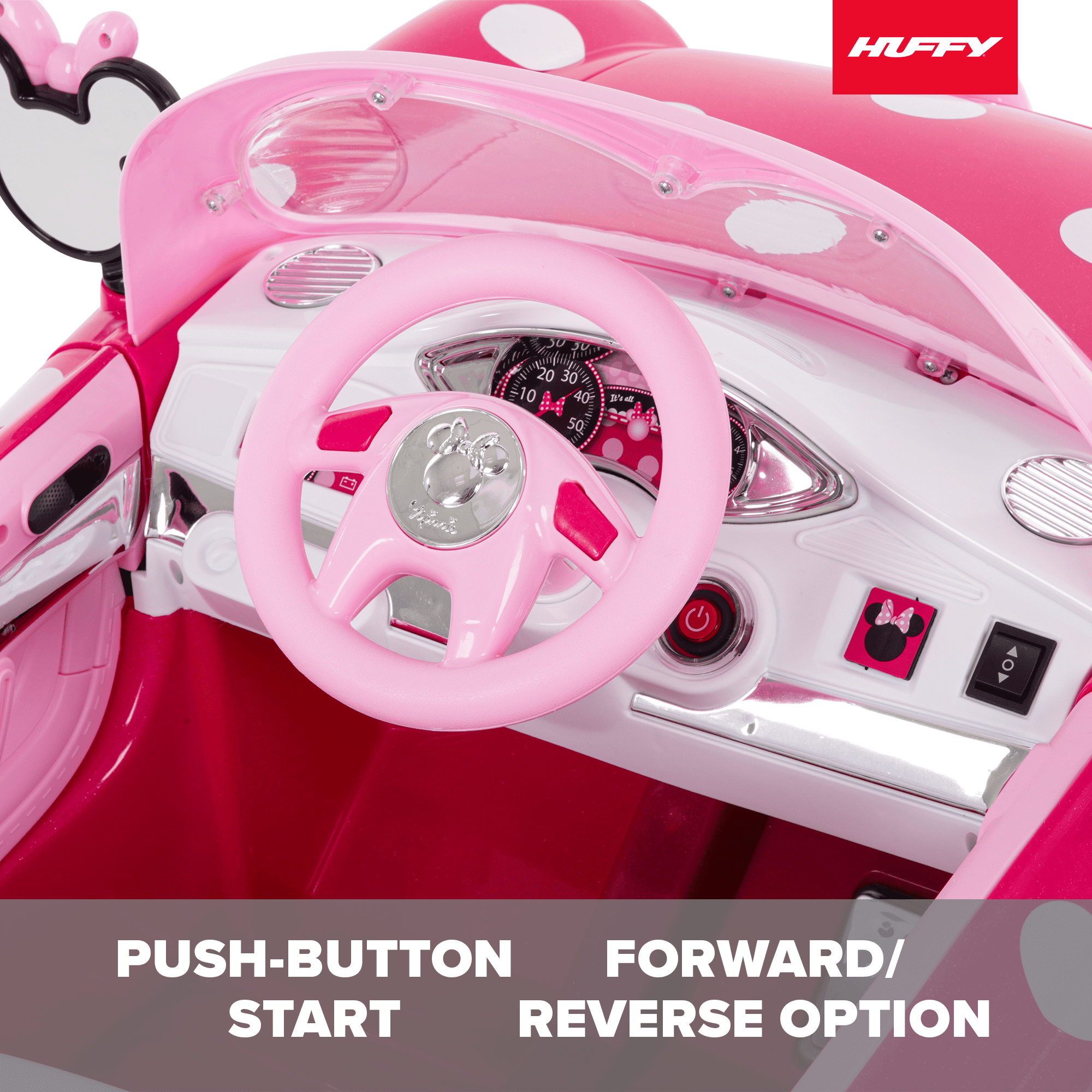 Huffy Disney Minnie Mouse Battery-Powered Ride-On Car, 6V, Kids Ages 3+ This ride-on is easy to assemble and ready for fun in no time! Your little girl will love the big bow on the Minnie Mouse convertible, complete with fun lights and sounds for a realistic ride. Huffy has made assembly simple: snap in the wheels, connect the battery, add the seat and windshield, and then snap in the mirrors. The durable ride-on features a realistic dashboard and is easy to drive forward and reverse at up to 2.5 mph. A convenient battery-charging port ensures the fun never stops. This ride-on provides hours of entertainment and sparks your child’s imagination. The comfortable steering wheel and durable resin tires ensure a smooth and safe ride, perfect for outdoor play. With a maximum weight capacity of 65 lbs, this ride-on is built to last and grow with your child. Let the imaginative fun start now! From Huffy, We Make Fun!