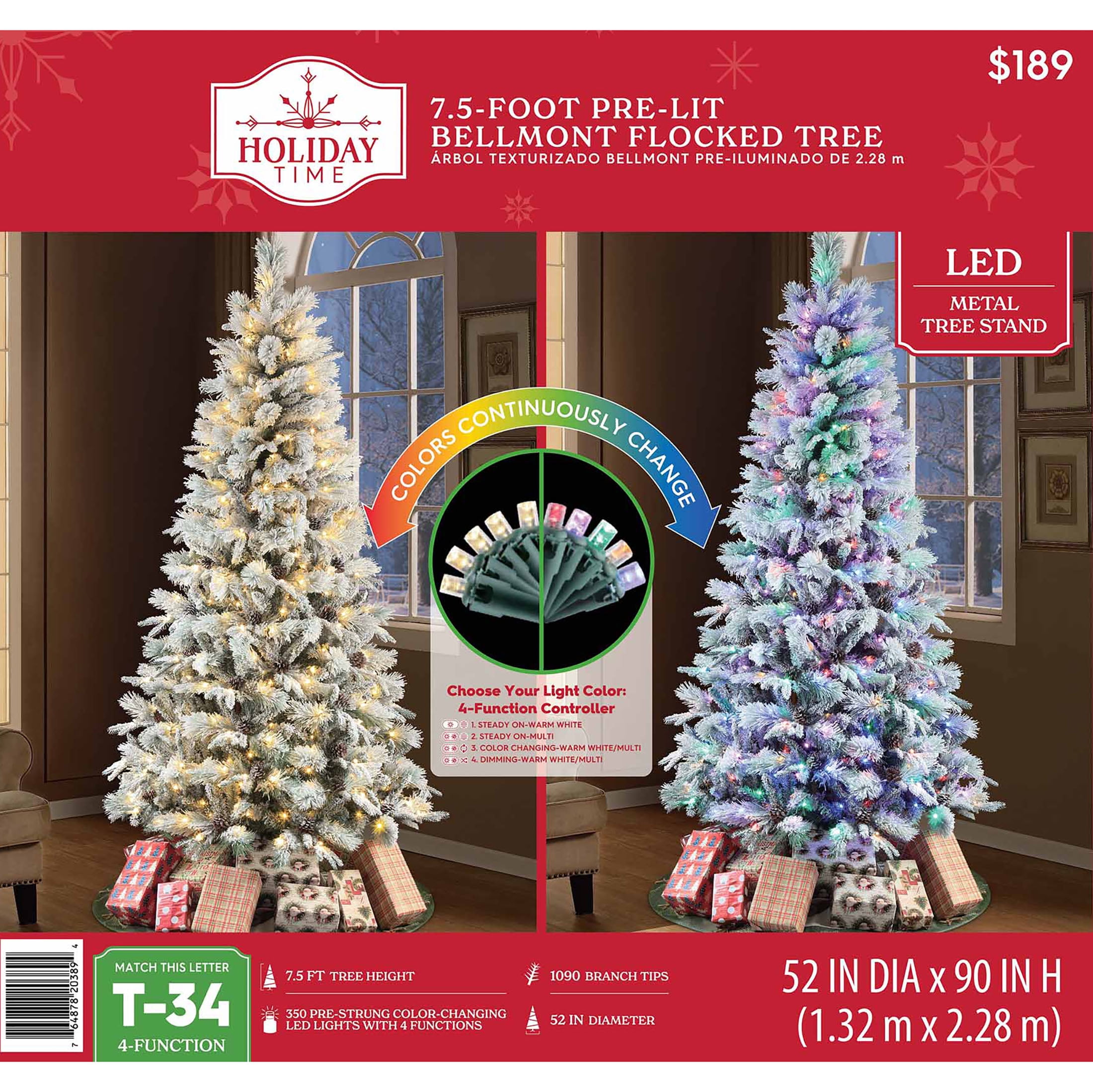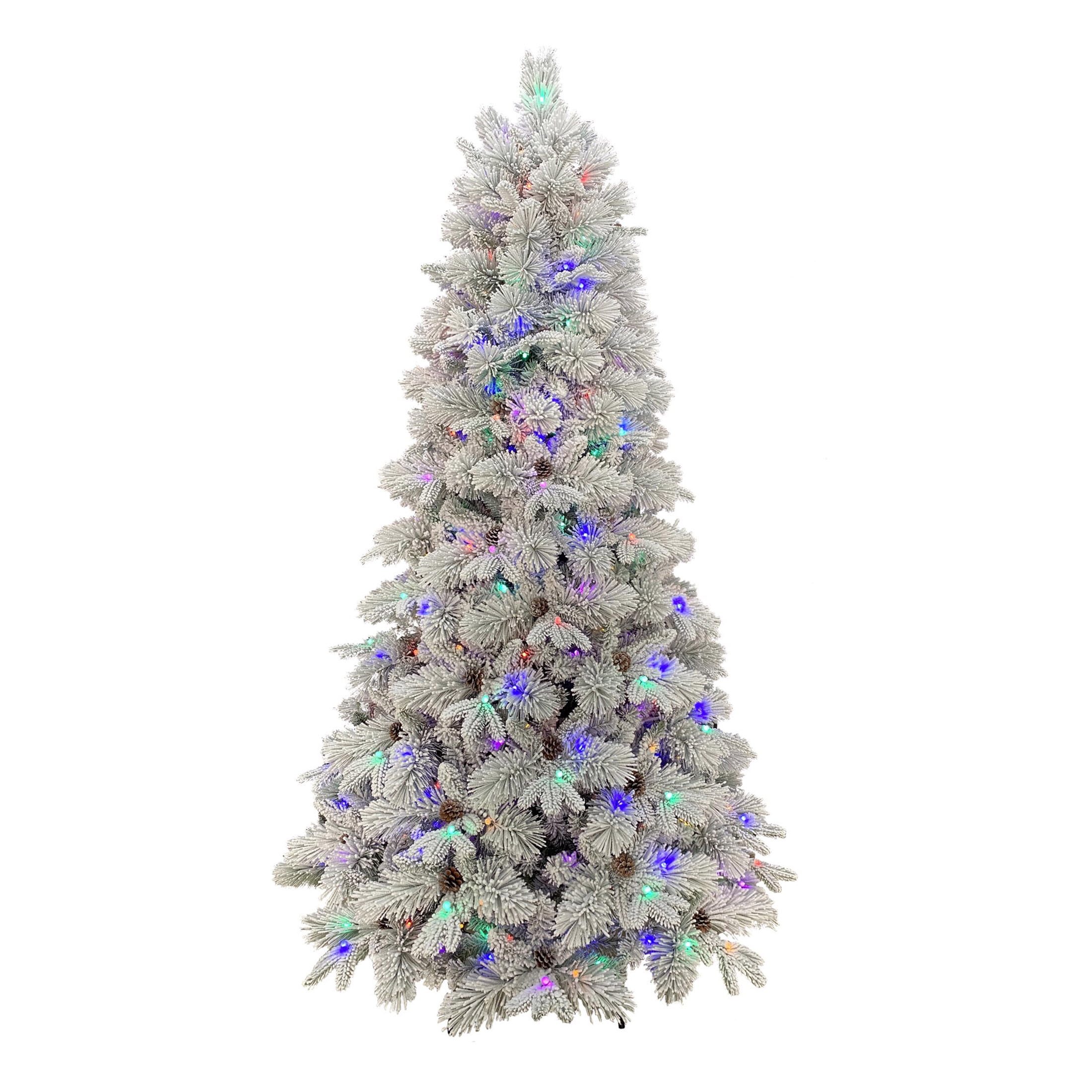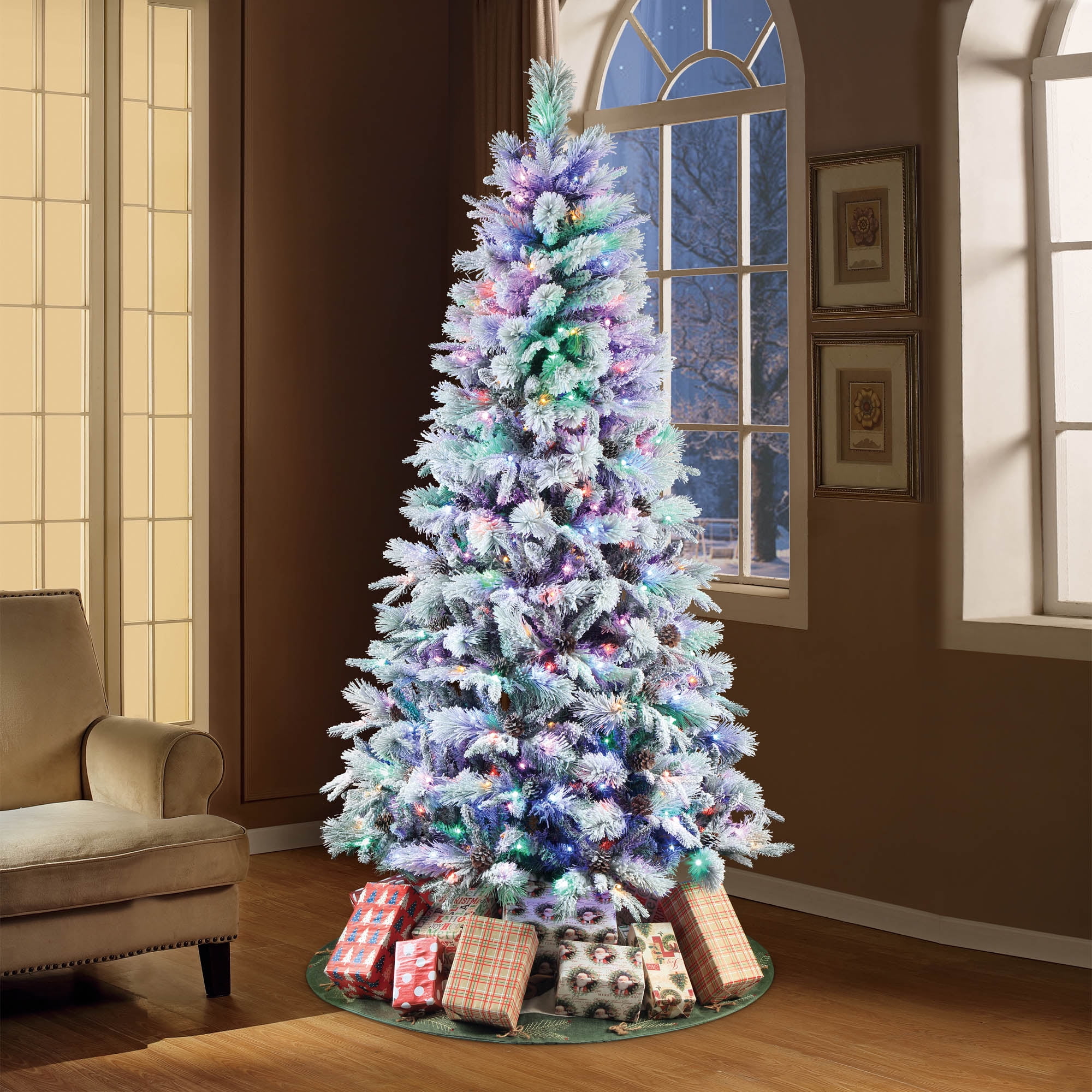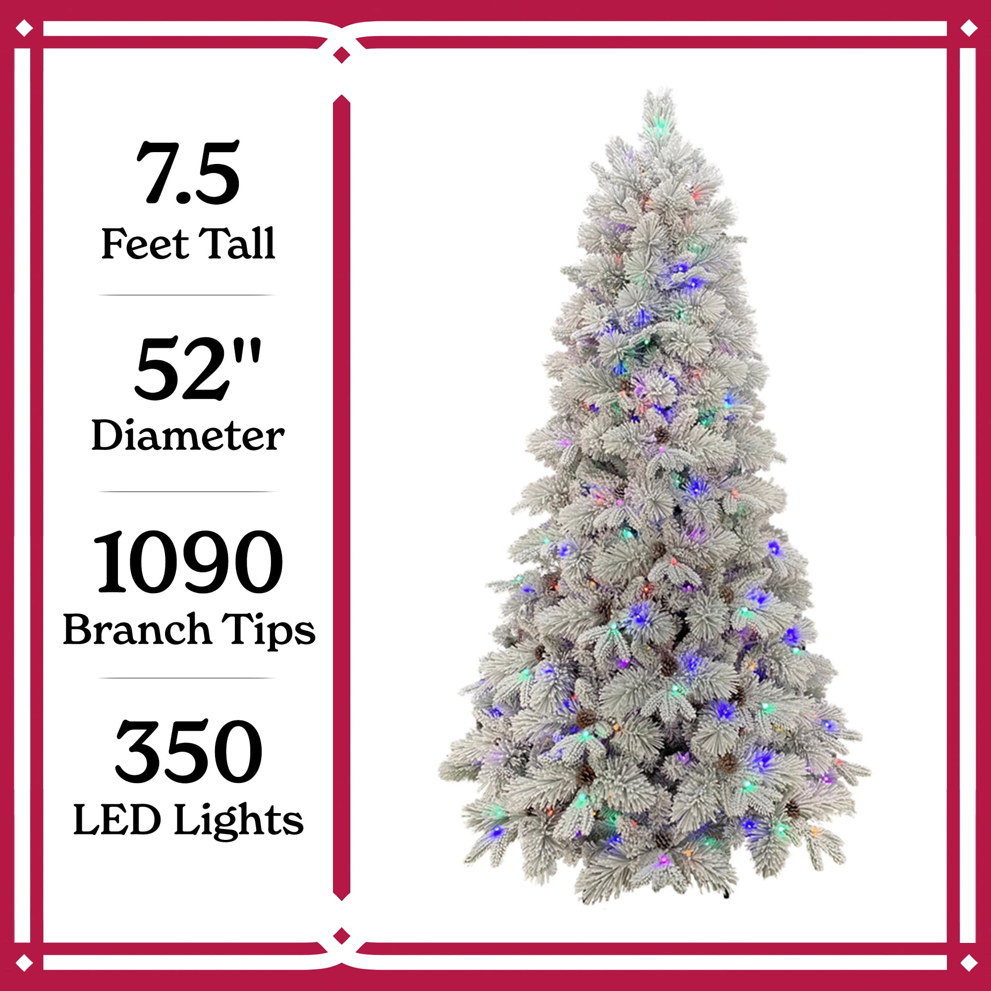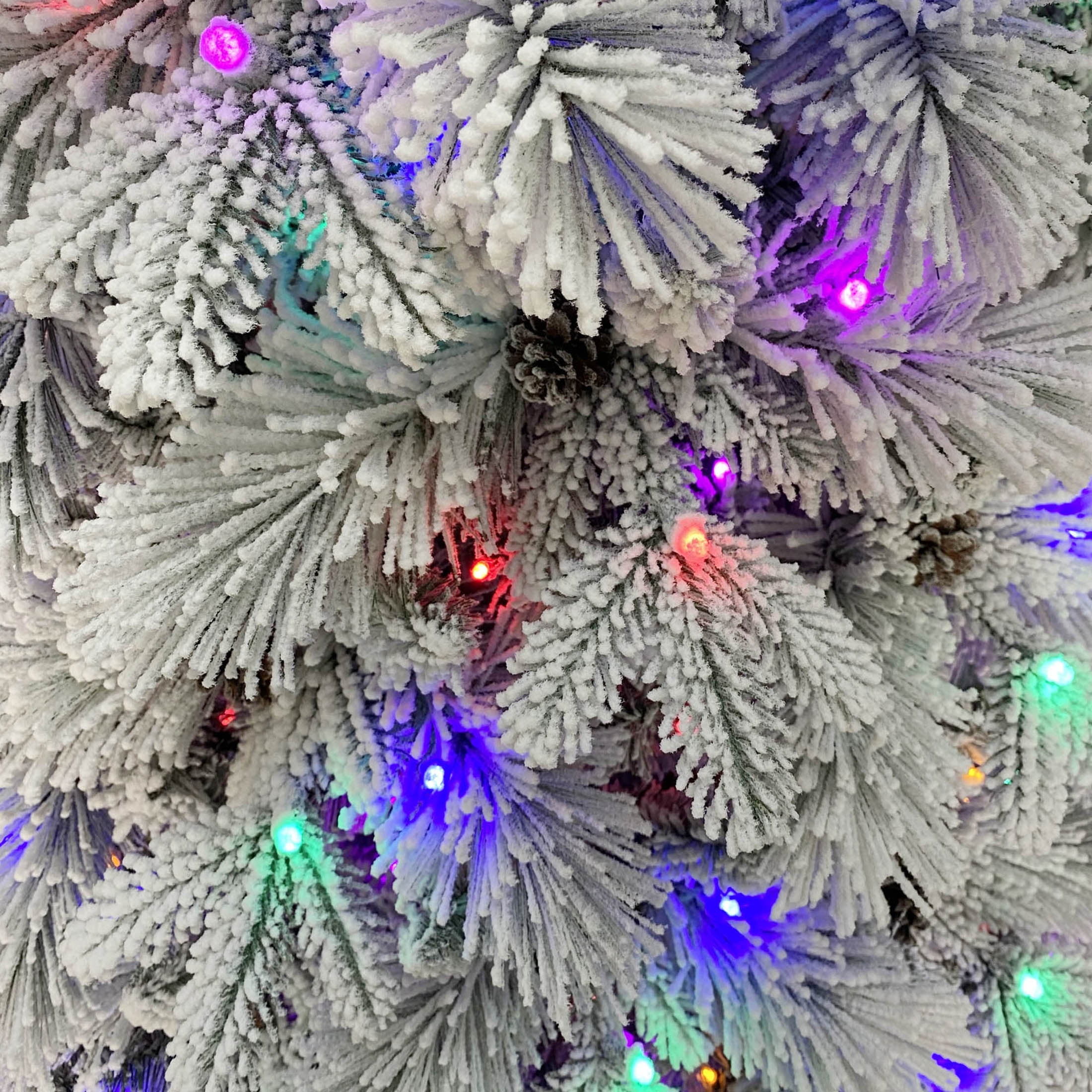 Holiday Time 7.5 ft Flocked Pre-Lit Bellmont Christmas Tree with Color-Changing LED Lights and Stand Color-changing LED lights change from warm white to multicolor 4 lighting functions: Steady on Warm White, Steady on Multicolor, Color changing- Warm White/Multicolor, Dimming – Warm White/Multicolor Gorgeous flocked tree Easy to set up Diameter: 52-inches 1090 branch tips and 64 pinecones Ideal for indoor use only Tree stand included Flame retardant