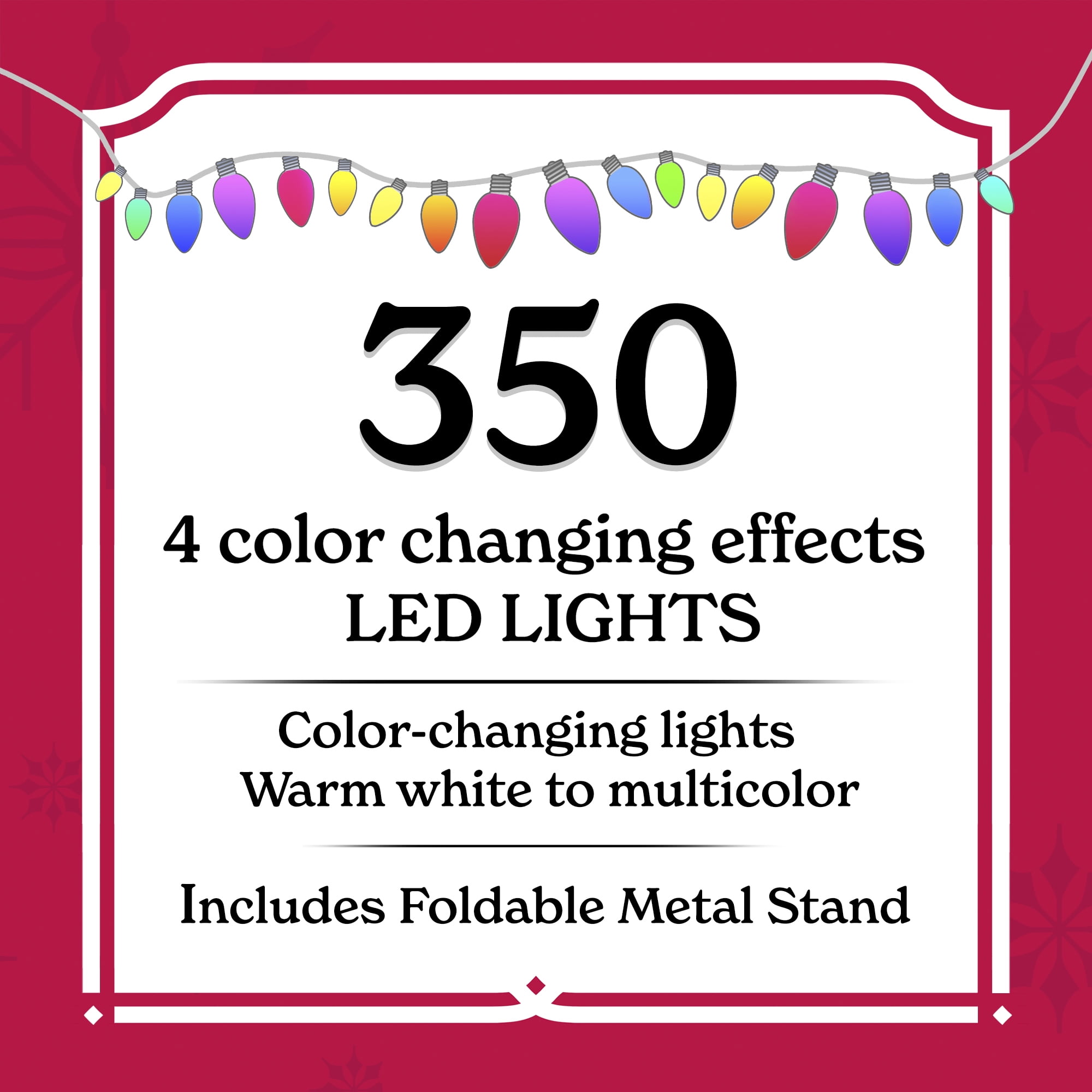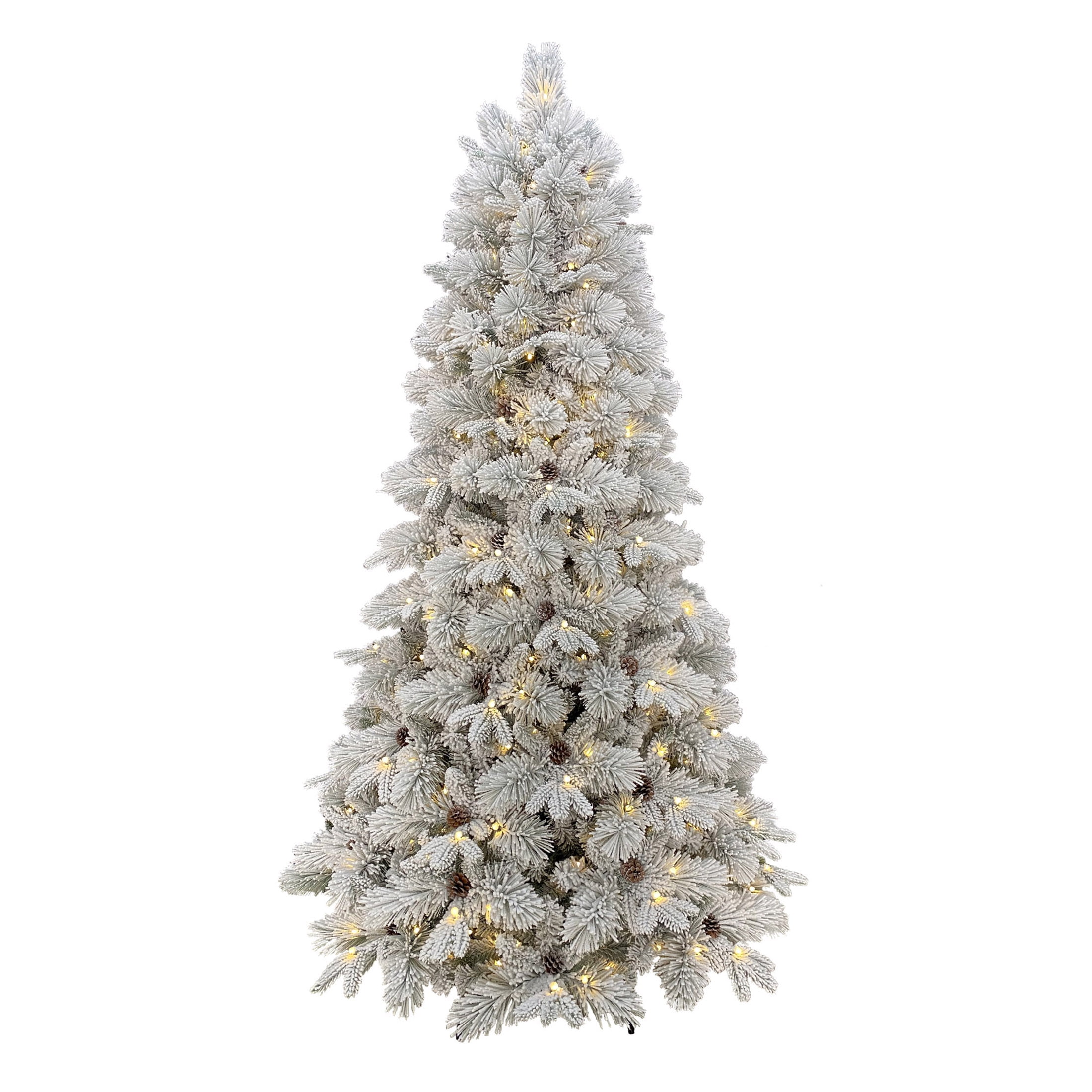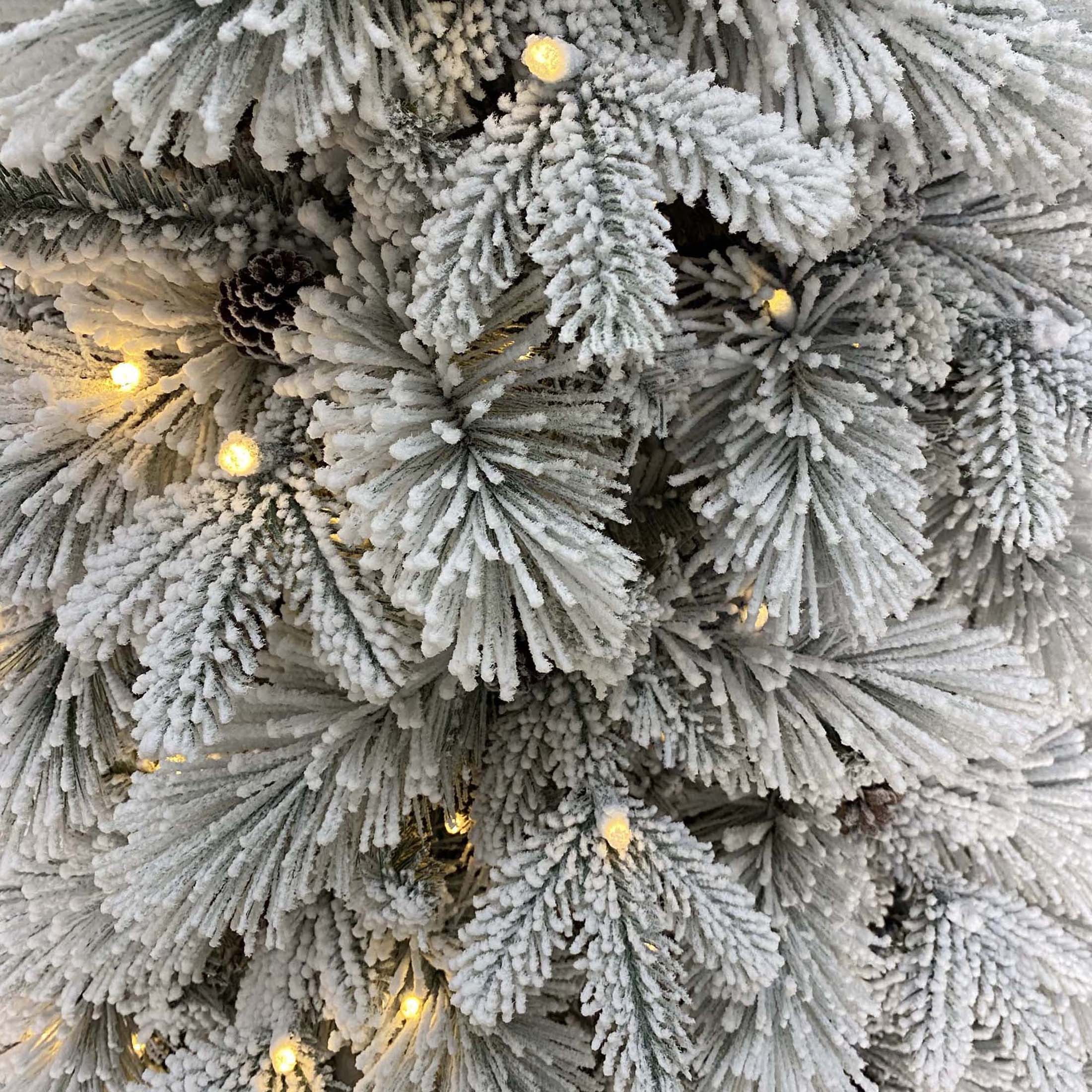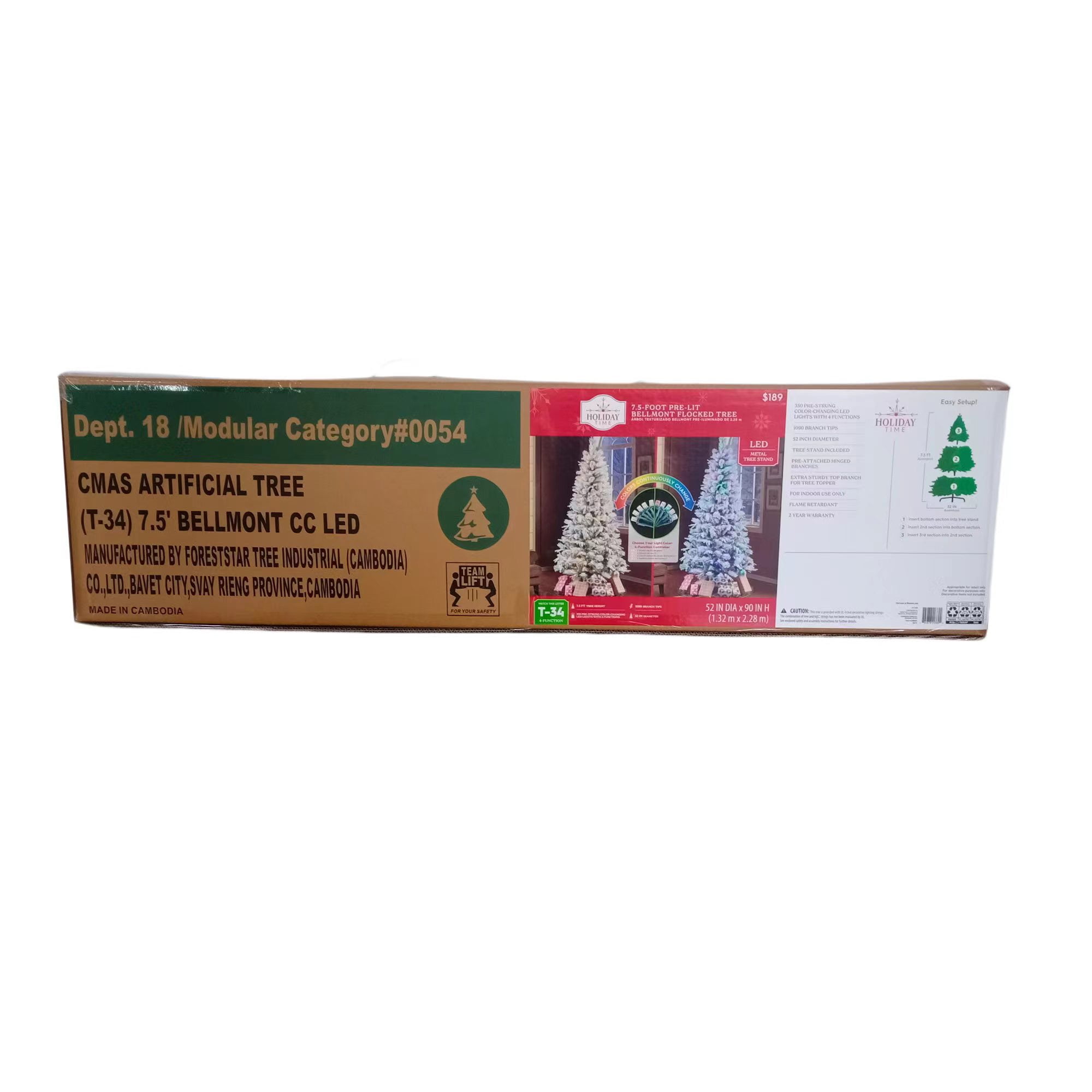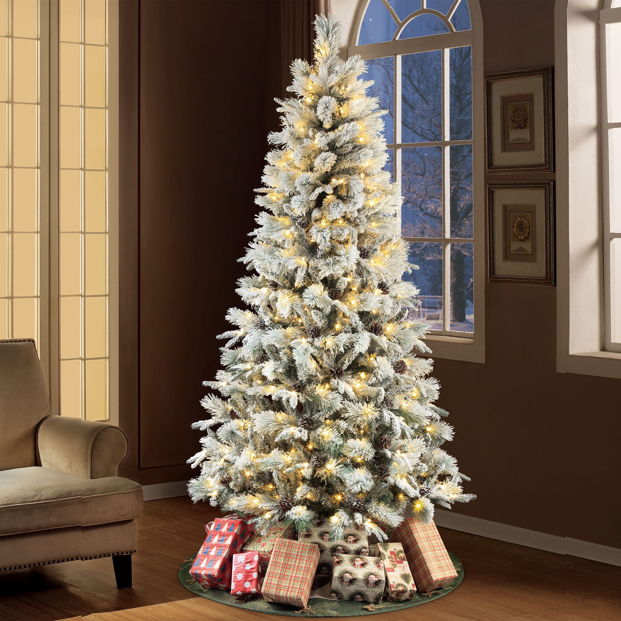 Holiday Time 7.5 ft Flocked Pre-Lit Bellmont Christmas Tree with Color-Changing LED Lights and Stand Color-changing LED lights change from warm white to multicolor 4 lighting functions: Steady on Warm White, Steady on Multicolor, Color changing- Warm White/Multicolor, Dimming – Warm White/Multicolor Gorgeous flocked tree Easy to set up Diameter: 52-inches 1090 branch tips and 64 pinecones Ideal for indoor use only Tree stand included Flame retardant
