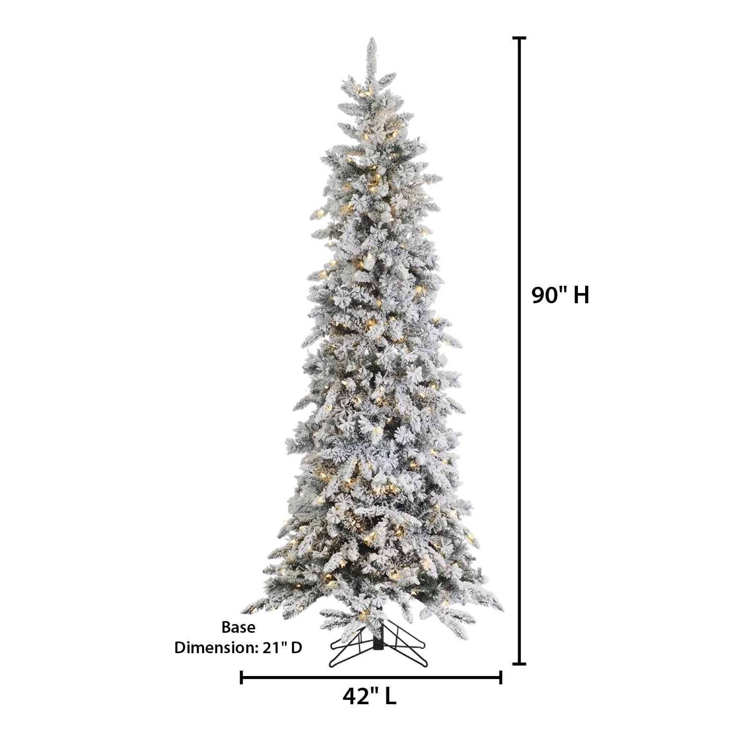Assembled Tree Dimensions: 42InL by 42InW by 90InH Pre-Strung with 450 Clear Incandescent lights; Replacement Bulbs Included Equipped with 830 branch tips to show off your favorite ornaments and decorations Includes 21-Inch Diameter Metal Four Prong Stand for Stability in any Environment Operates by Green 72″ Lead Cord Allowing Versatility in Placement Tree is UL-Listed and Fire Resistant for Safety.