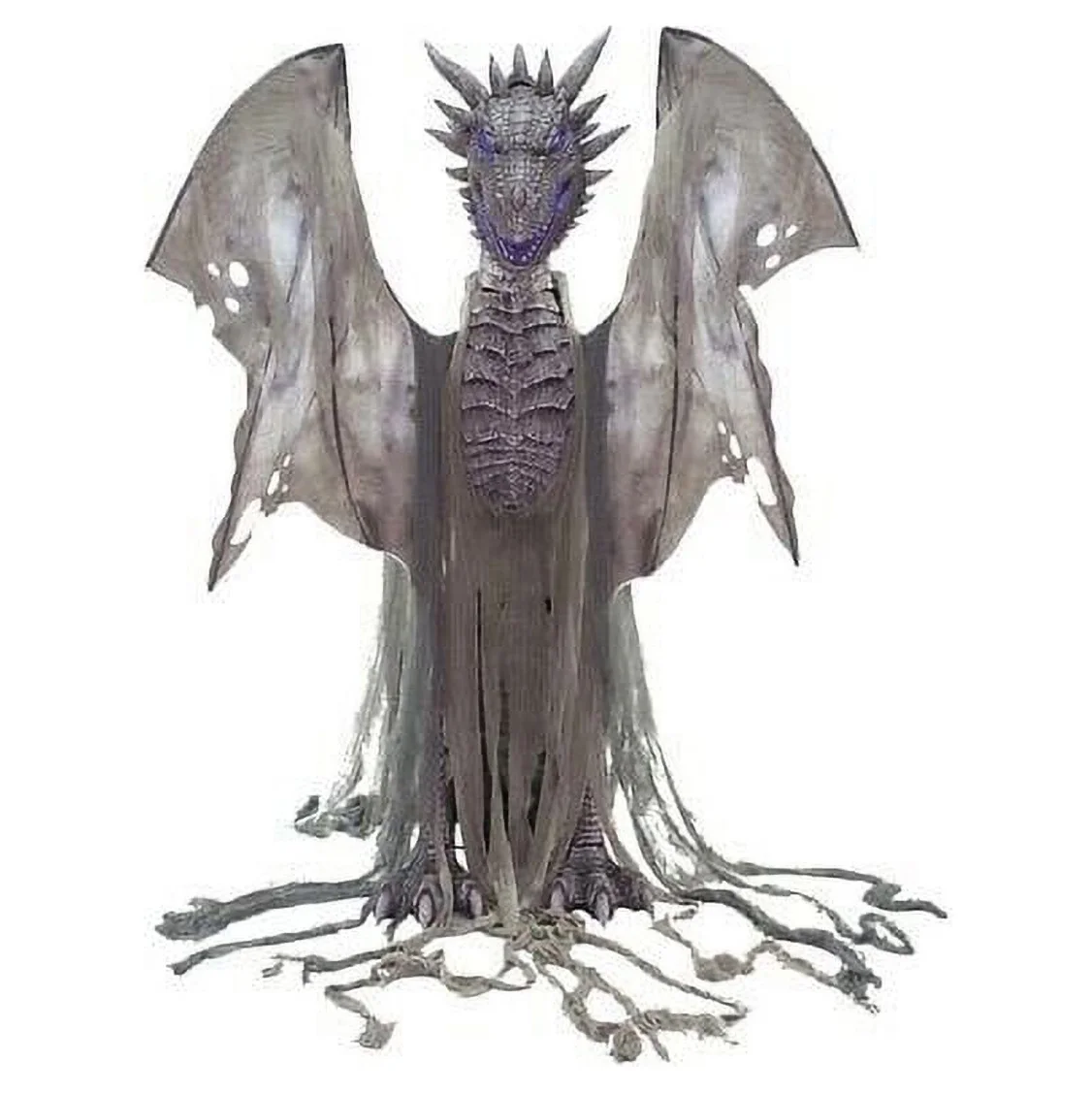 Break The Ice If you’re trying to create some seriously impressive scenery, this is a dragon worth chasing. This massive 7′ Winter Forest Dragon Animated Prop features a looming wingspan that flaps back and forth, light up icy blue eyes, and a head that turns side to side to spit fog and roar at those who dare to get close! Perfect for professional haunts, fantasy themed events, conventions, and Halloween displays! A Fearsome Winter Dragon Animatronic Beware, Winter has arrived – and it looks hungry! The 7′ Winter Forest Dragon Animated Prop is a magnificent animated figure featuring molded-plastic head, neck, chest, and legs with matching draped-fabric wings. His wings flap back and forth, head turns from side-to-side, chilling blue eyes light up, and when connected to your fog machine, fog sprays out of his mouth as he roars! Plug the Dragon’s UL power adapter into any standard outlet and choose from Steady-On, Infra-Red Sensor or Step-Here Pad (included) activation options. The infra-red sensor works up to 6.5 feet away and works in all lighting conditions, from bright light to no light! Item includes volume control and easy-to-assemble quick-connect metal frame. Assembly is required. Measures approximately 84″ tall, 90″ wingspan, and 24″ deep. Made with polyester, PE, metal, PVC, and electronics parts.