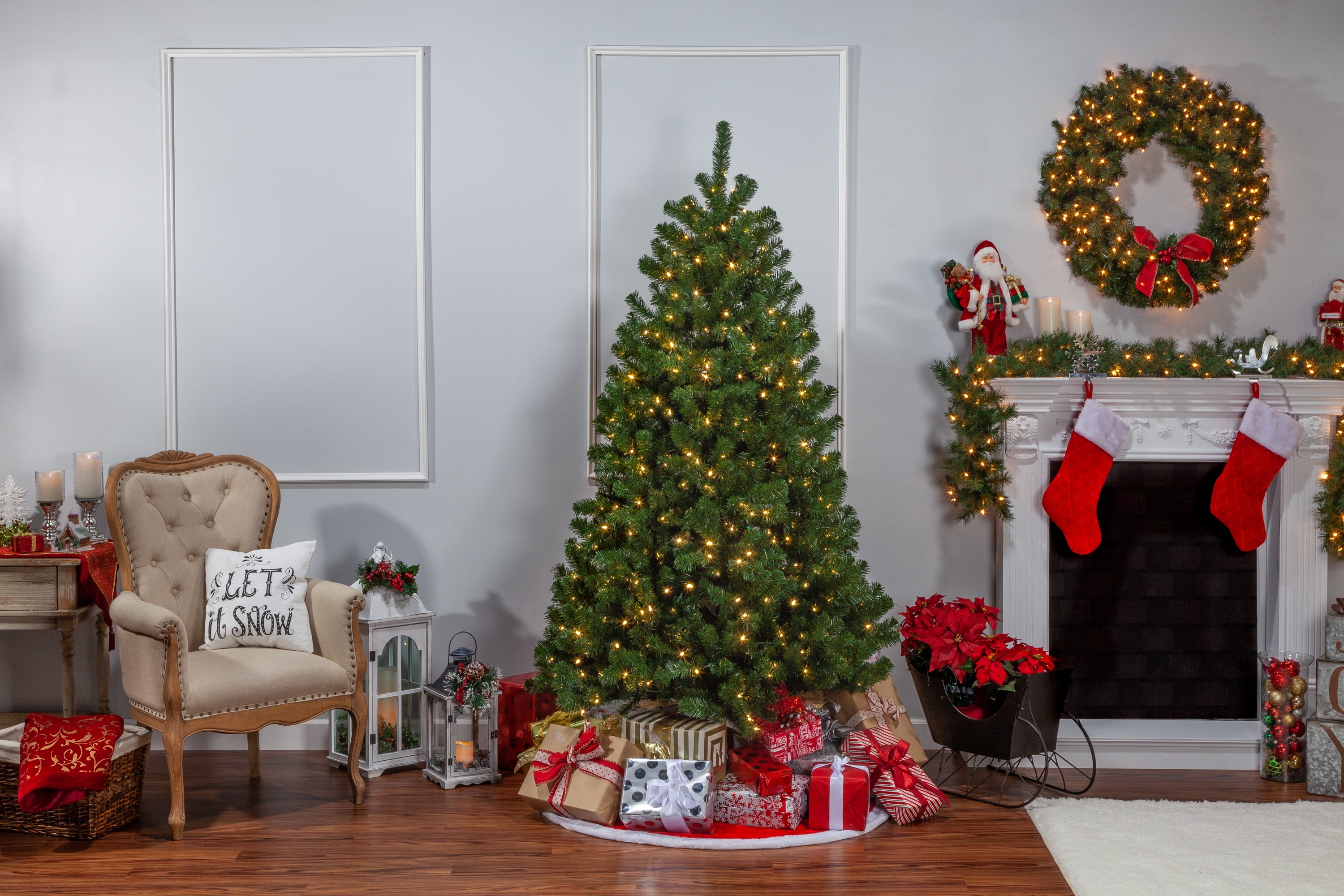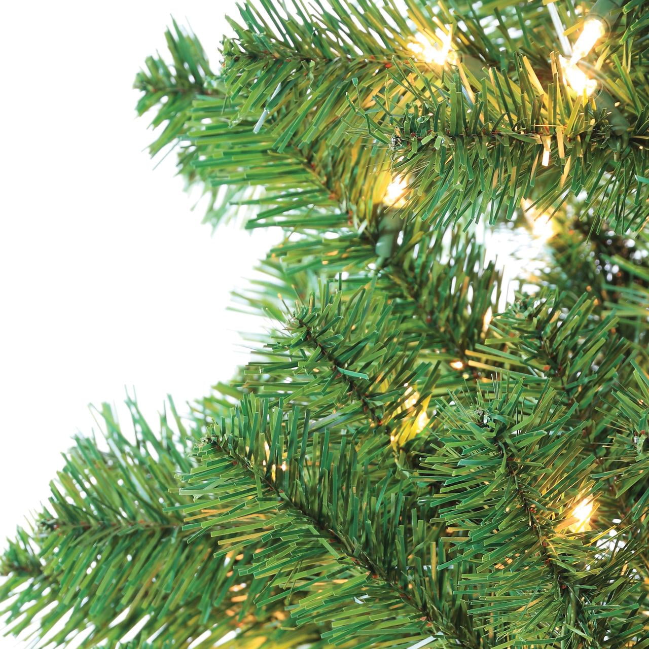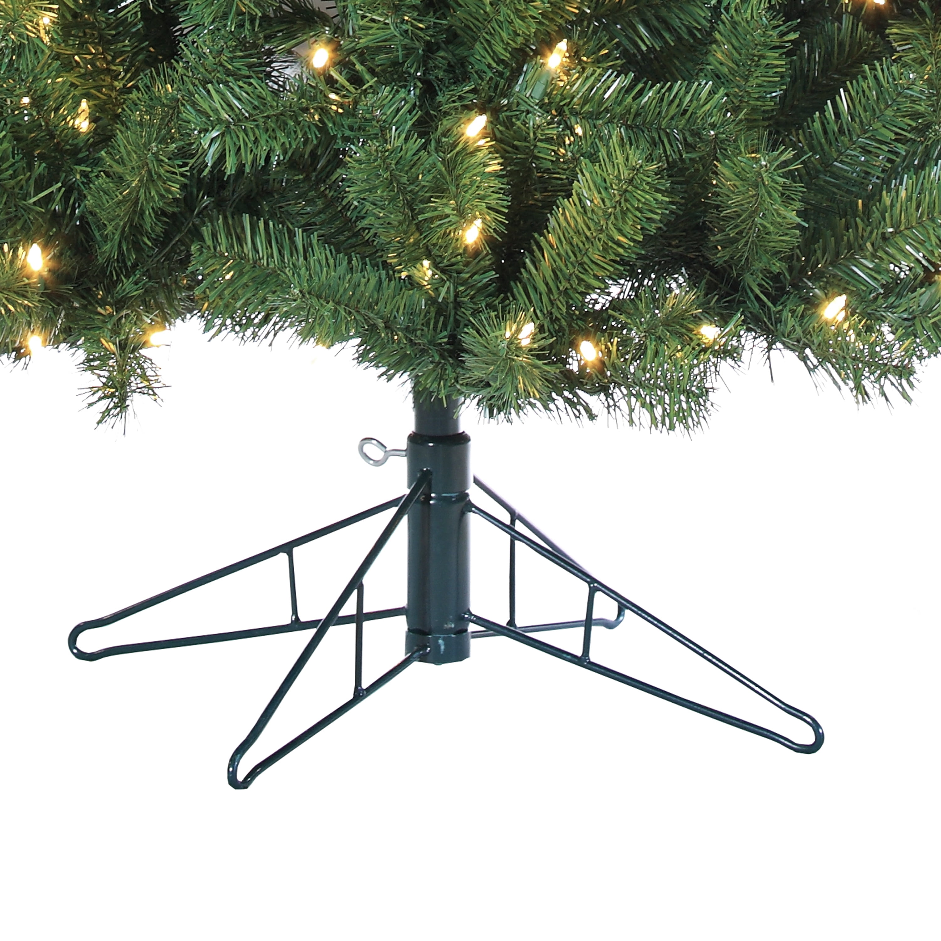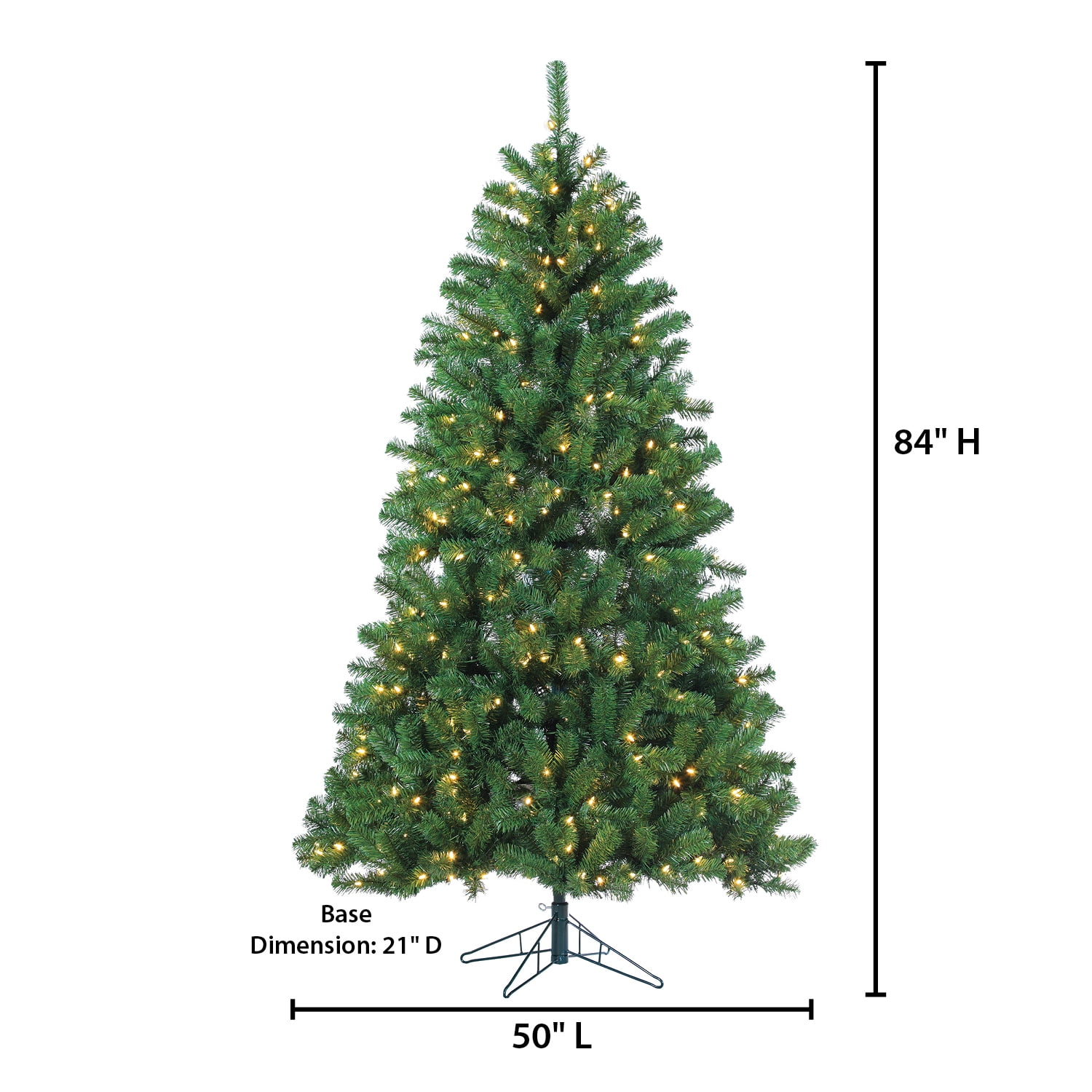 Assembled Tree Dimensions: 50InL by 50InW by 84InH Pre-Strung with 400 Warm White LED lights; Replacement Bulbs Included Equipped with 1026 branch tips to show off your favorite ornaments and decorations Includes 21-Inch Diameter Metal Four Prong Stand for Stability in any Environment Operates by Green 72″ Lead Cord Allowing Versatility in Placement Tree is UL-Listed and Fire Resistant for Safety.