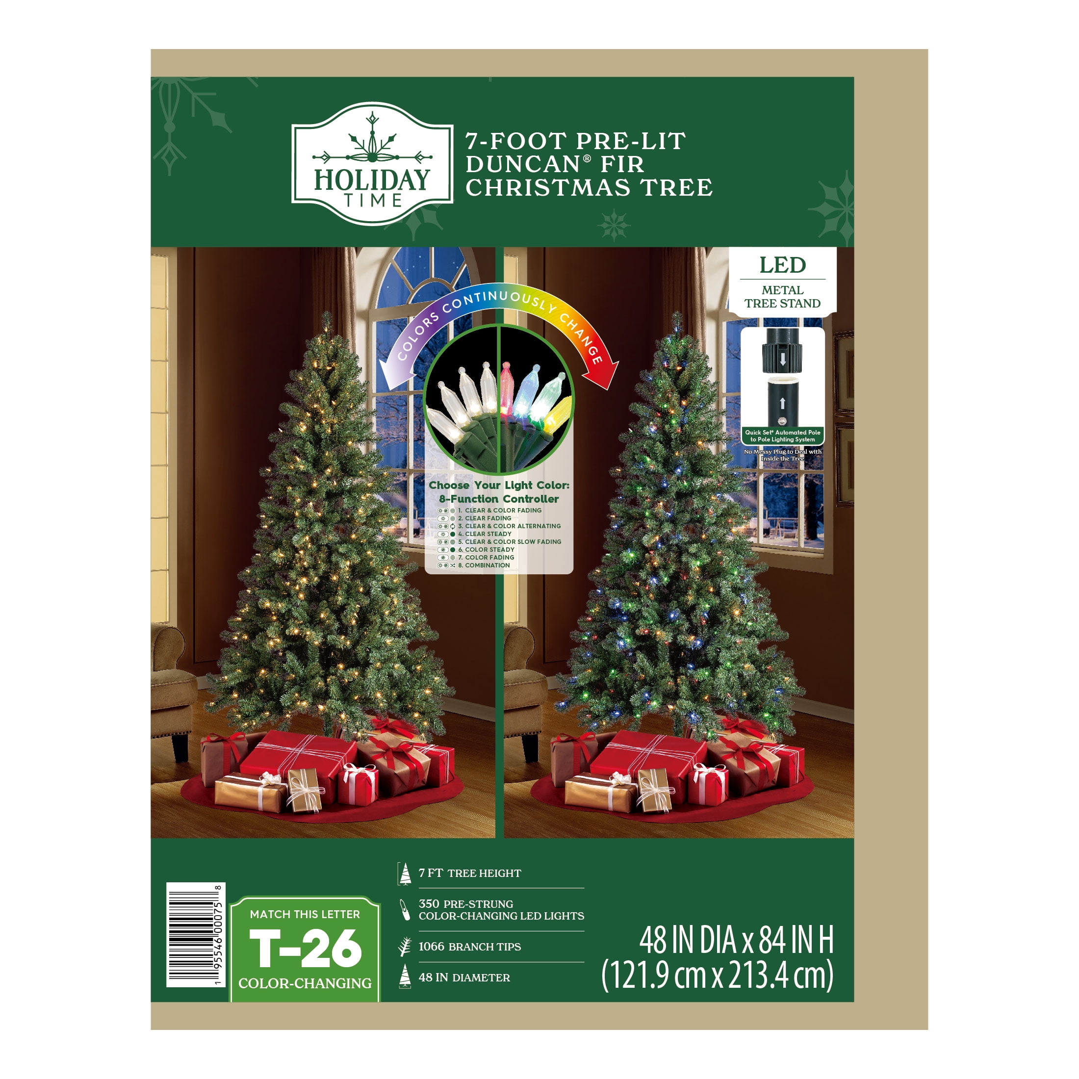 Holiday Time 7’ Pre-Lit Duncan Fir Artificial Christmas Tree, Color-Changing LED Lights with Quick Set 1,066 branch tips 350 pre-strung color-changing LED lights Quick Set feature: automated pole-to-pole lighting system SureBright lights stay lit if one burns out 8-function light controller Metal tree stand included Easy setup – slide the tree sections together for quick display Pre-attached hinged branches Extra sturdy top branch for your tree topper For indoor use only Flame-retardant Color: Green 4 ft diameter Product Dimensions: 48″ DIA x 84″ H Model #: TG70M2BJGD01