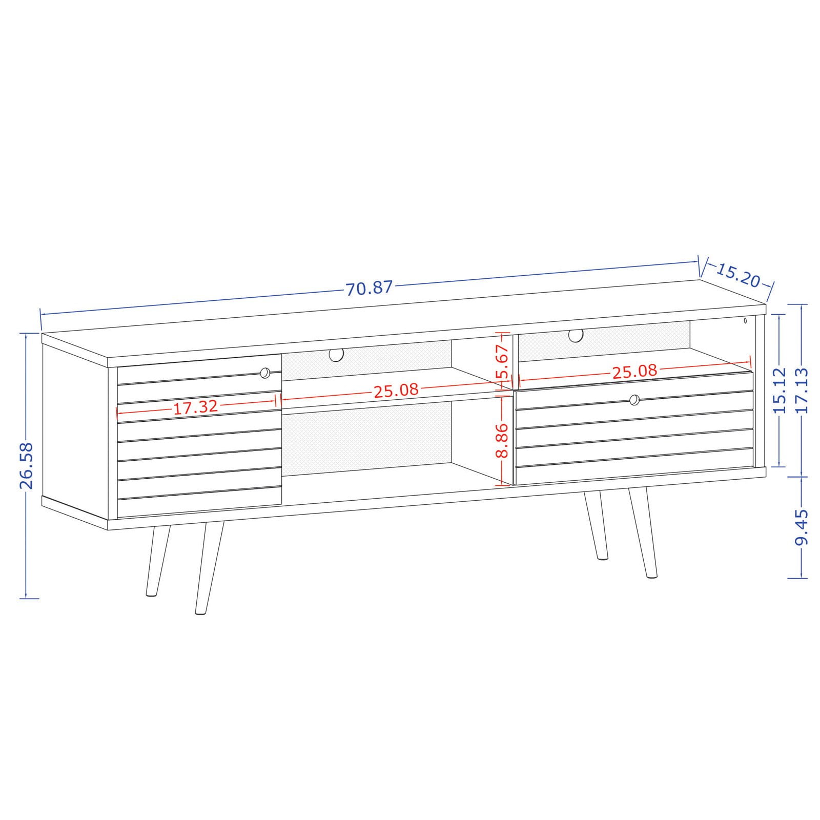 Free Standing TV Stand for Living Room and Bedroom use. Upon Assembly, Measures: 70.86 in. Length, 26.57 in. Height, 15.19in. Depth. Recommended for a 50″ -65″ TV. Includes 2 Media Holes for Wire Management. Fashionable Splayed Legs made from Solid Wood for Extra Durability. Includes 3 Open Shelves, 1 Concealed Large Cubby, and 1 Drawer. 90° Open Door Style with Ring Handles and Sleek Line Indent Design. Home Assembly Required. All Hardware Included.