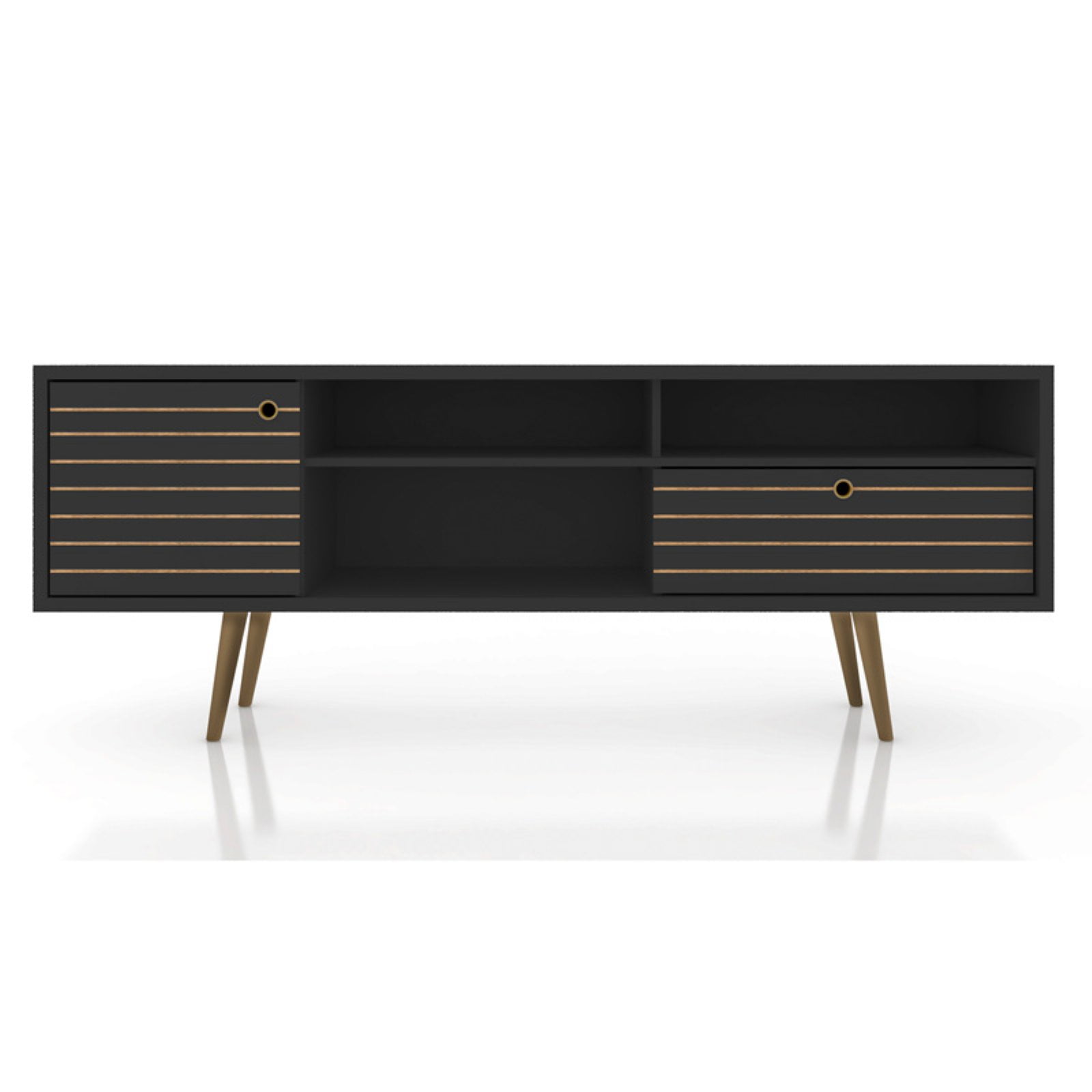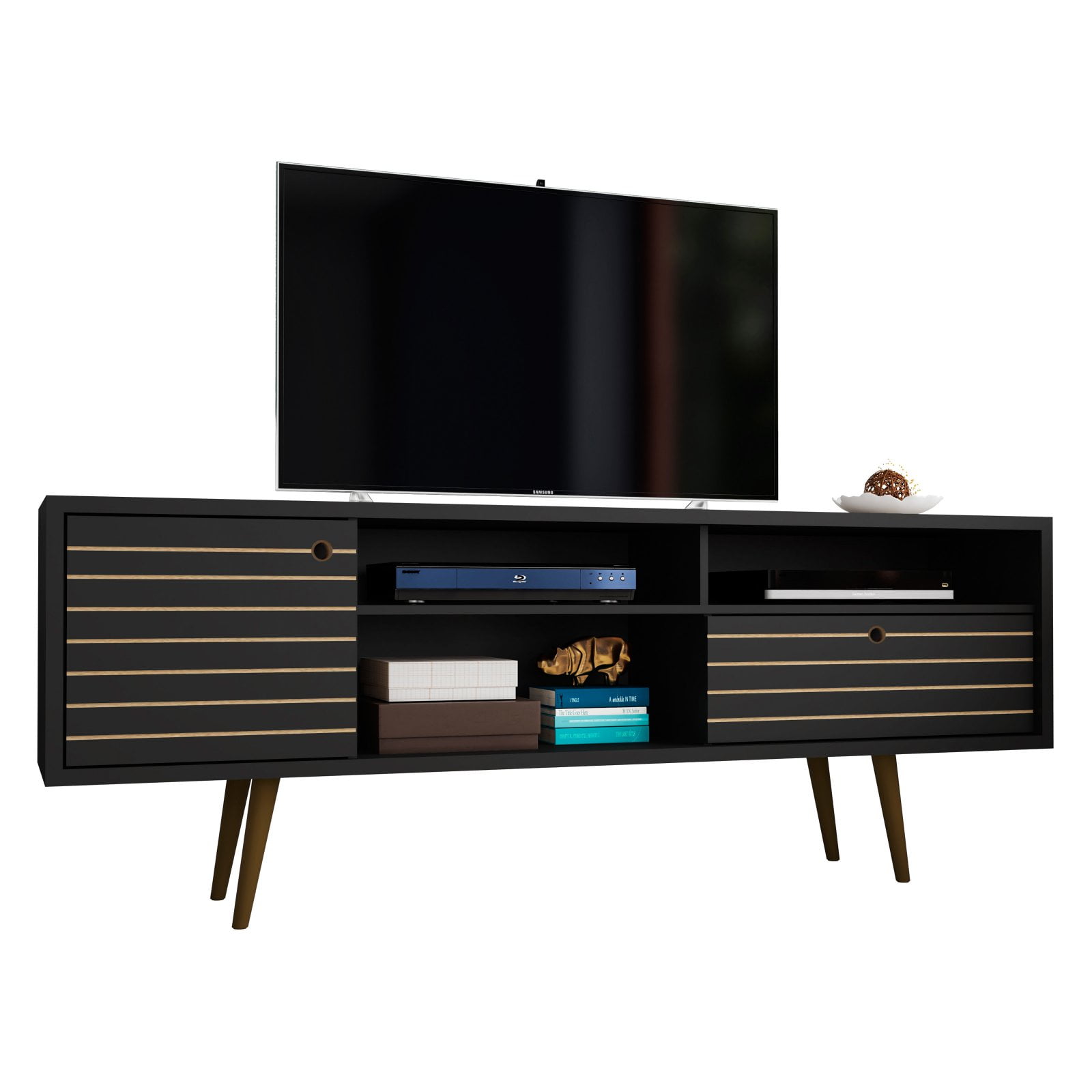 70.86″ Mid Century – Modern TV Stand with 4 Shelving Spaces and 1 Drawer, Black Feature:- Free Standing TV Stand for Living Room and Bedroom use. Upon Assembly, Measures: 70.86 in. Length, 26.57 in. Height, 15.19in. Depth. Recommended for a 50″ -65″ TV. Includes 2 Media Holes for Wire Management. Fashionable Splayed Legs made from Solid Wood for Extra Durability. Includes 3 Open Shelves, 1 Concealed Large Cubby, and 1 Full Extension Drawer. 90? Open Door Style with Ring Handles and Sleek Line Indent Design. Home Assembly Required. All Hardware Included. Frame Material:- MDP and MDF Feet Material:- Solid Wood Back Finish:- No Shelves:- 2 Drawers:- 1 Doors:- 1 Shelf Type:- Fixed Shelves Drawer Type:- Full Extension Drawers Door Type:- 90? Open Door Style Weight Capacity:- Top Base Shelf: 44 Lbs., Lower Base Shelf: 33 Lbs., Internal Shelves: 11 lbs. each; Drawer: 22 Lbs. Description: The Liberty 70.86 Mid-Century Modern TV Stand is mid-century modern at its best. Quality craftsmanship and careful detailing create the ultimate blend of style, functionality, and brilliant design. A sophisticated entertainment center, the piece features open shelving, as well as two hidden compartments perfect for stashing DVDs, board games, electronics, and media accessories. Free standing and easily moved, this stand will mix well with any decor and its artful grooves will create a statement in any space. Specifications: Free Standing TV Stand for Living Room and Bedroom use. Upon Assembly, Measures: 70.86 in. Length, 26.57 in. Height, 15.19in. Depth. Recommended for a 50″ -65″ TV.