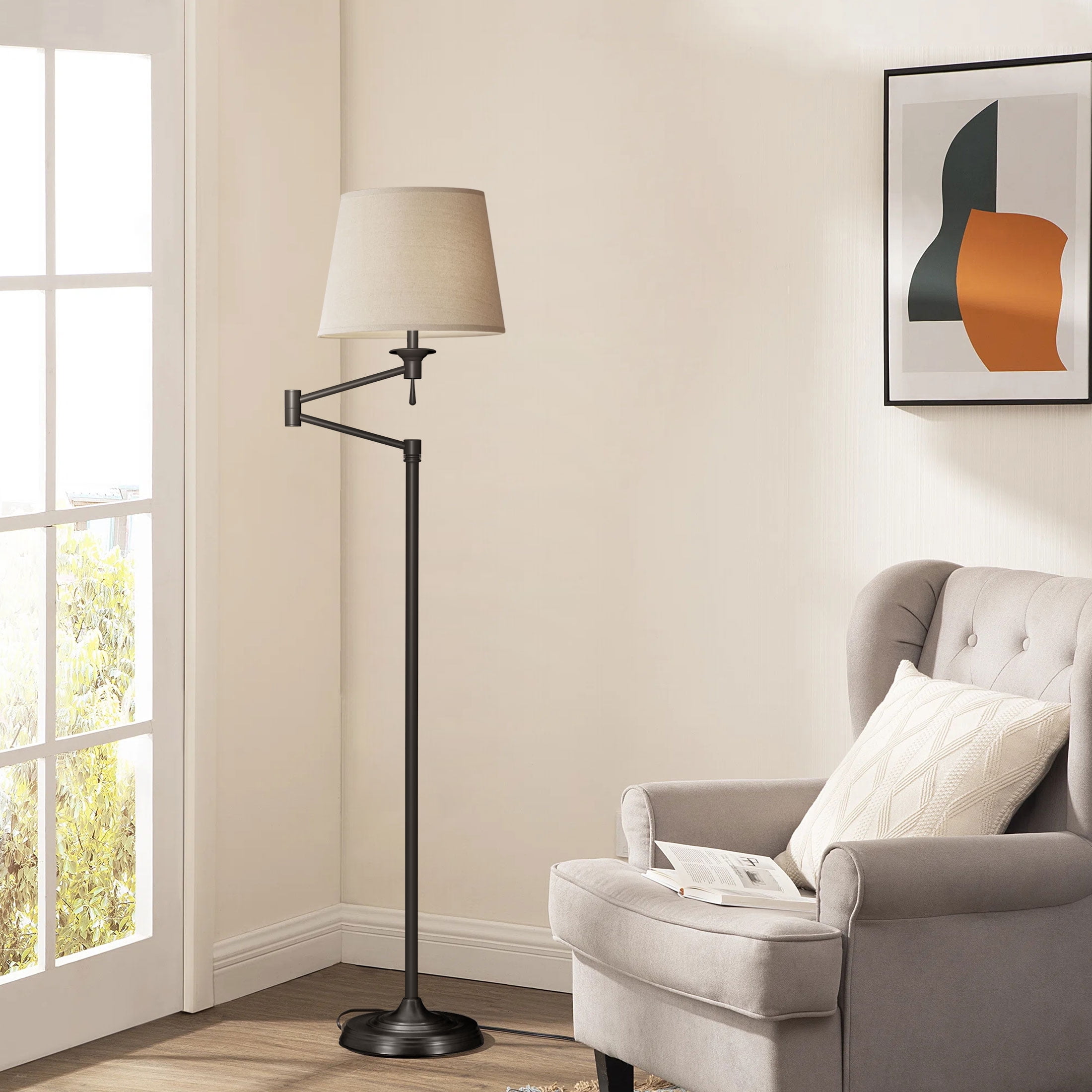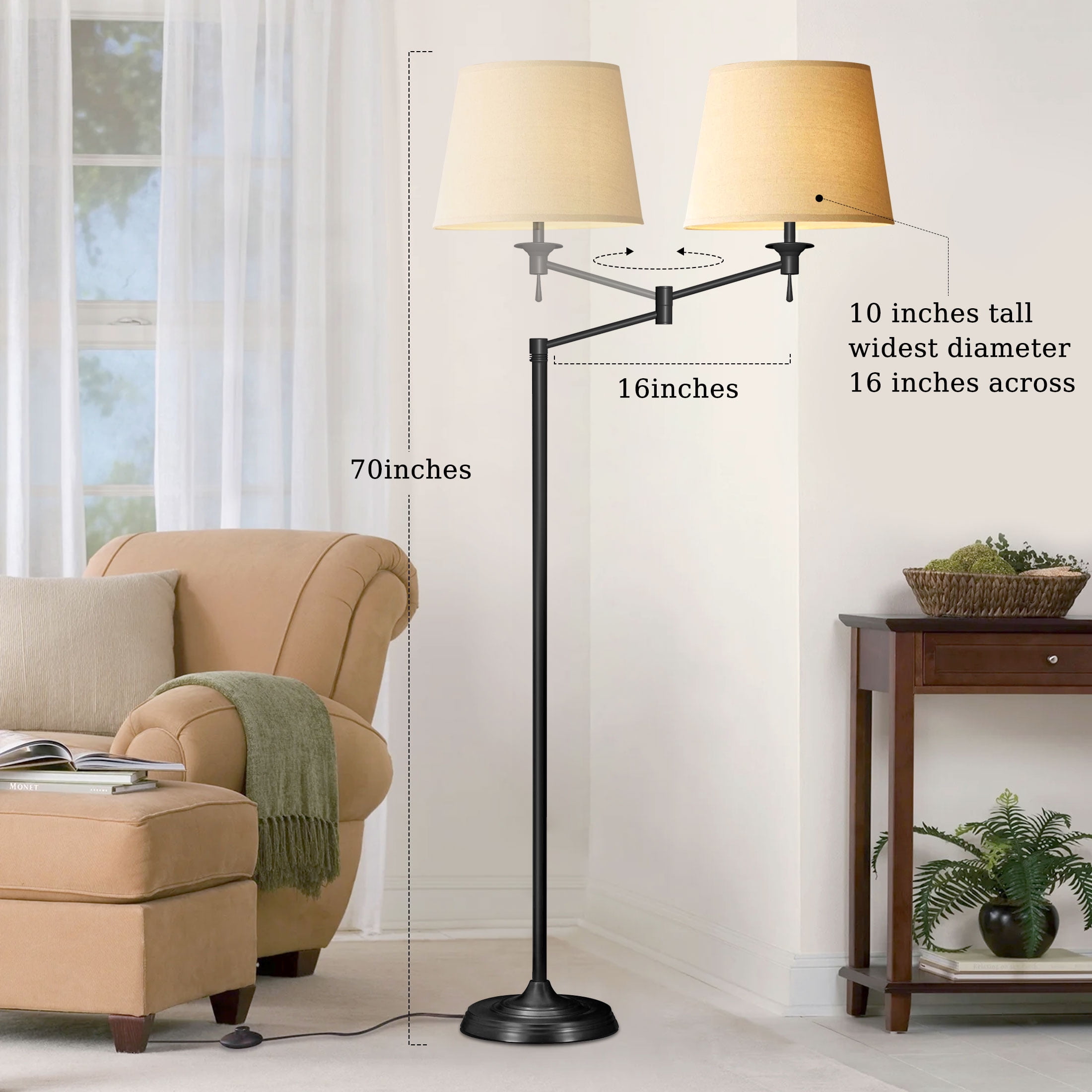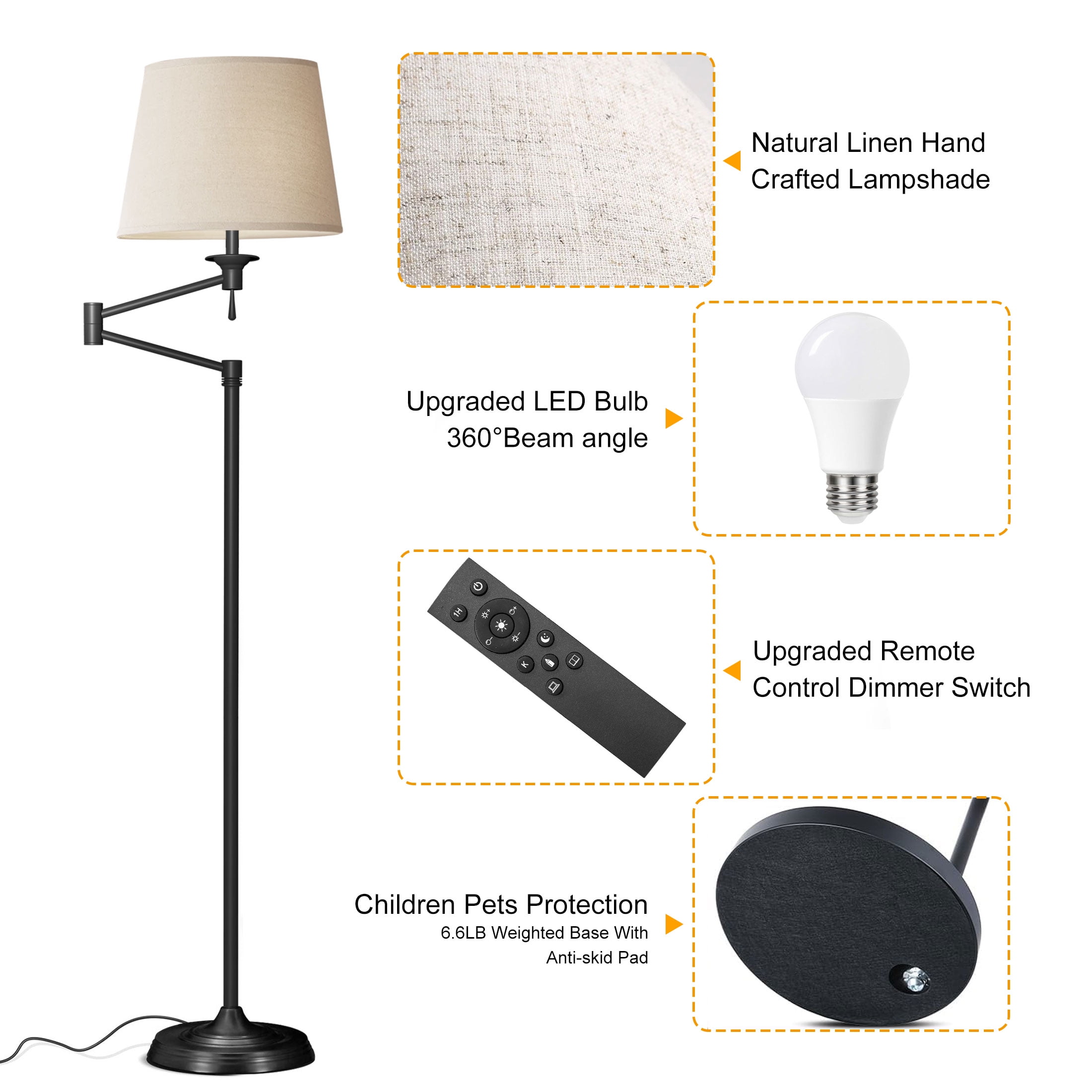 Size: 70″ * 12.6″ * 12.6″ Base Type: E26 / E27 Base Input Voltage: 110-120 V/AC Frequency: 50/60 Hz Wattage: 9 W Luminous Flux: 1050 lm Color Temperature: 3000 K – 6500K Beam angle: 220° Color Rendering Index(CRI): ≥80 Lifespan:>25,000 Hours” Memory Function Compatible with wall switch Lamp head with 270° rotation High-Quality Linen Lampshade Long-lasting and Energy-saving Light is softer and protects your eyes. Color: Black Finish: Painted Home decor style: Modern Suitable for the crowd: Adults Model: CP014777 Cautions: Cut off power before installing or cleaning the floor lamp. The floor lamp supports up to 60 watts maximum. Do not put the floor lamp in an overheating working condition or cast it into the fire. Package Included: 1 x floor lamp 1 x 9w led bulb 1 x lamp shade 1 x remote 1 x user manual