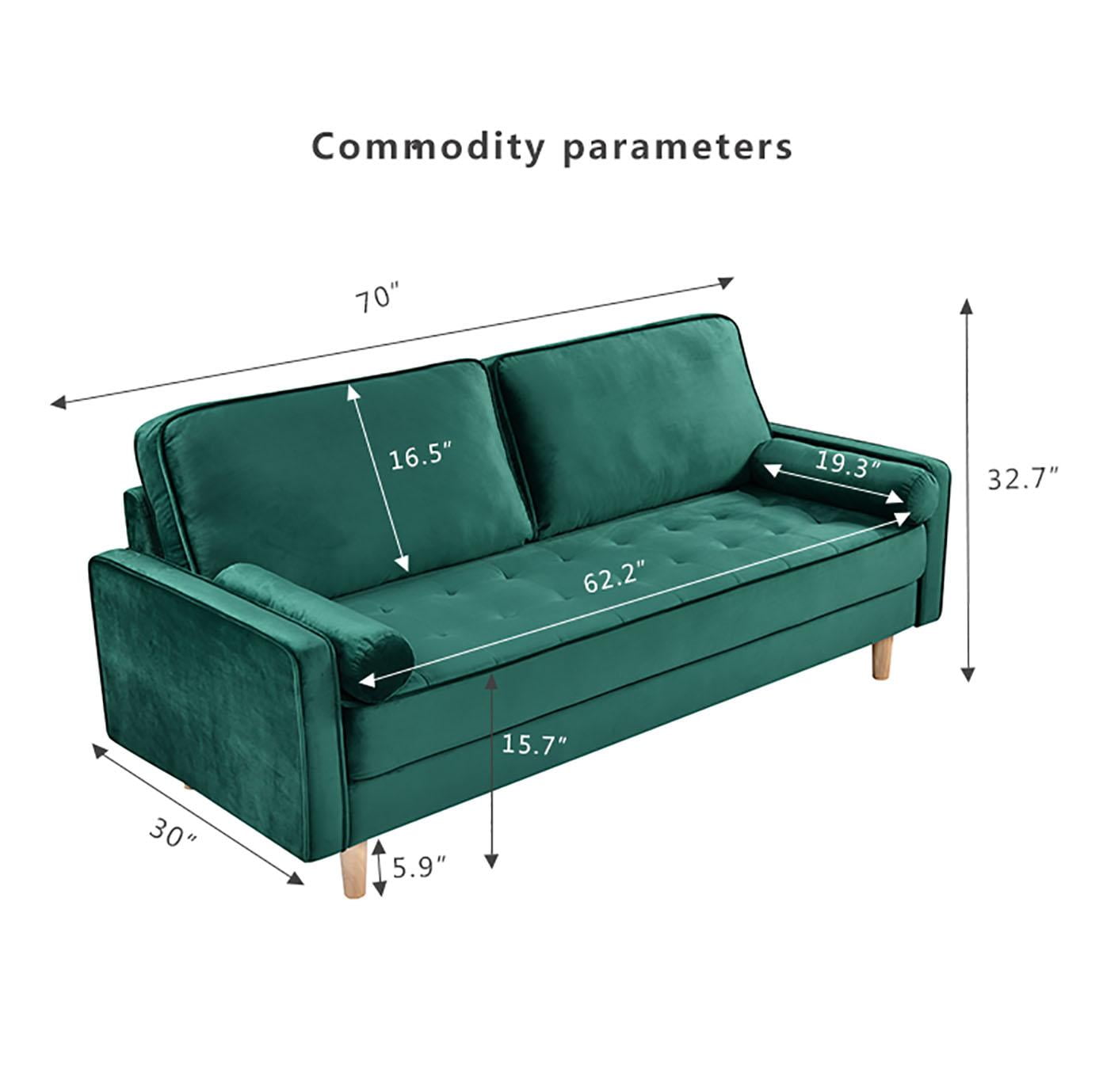 Classic,timeless,minimalist design that won’t go wrong no matter how you match it. No matter how long you sit,it won’t collapse Using high rebound sponge filling,with moderate softness and hardness,not easy to collapse,and able to withstand the test of time We use imported Russian pine wood that has been dried and polished,along with thick springs and high-quality rubber bands,to support both the facade and the interior,which is open and transparent Assembly Required:Yes Product Dimensions:70″D x 30.5″W x 32.7″H Type:Standard Special Feature: to Assemble Upholstery Fabric Type:Velvet Room Type:Living Room Pattern:Solid Material:Wood Classic never goes out of style Healing life with it is enough for a cloud like velvet sofa.Thoughtful design,carefully selected materials.Discovering the Secret of Happiness Skin feel frosted velvet fabric is soft and smooth Choose a soft matte velvet fabric with a smooth and soft touch,covered with short and fine fluff on the surface. The texture is rich and not stuffy,and the touch is smooth and soft Stable sofa legs Thick,durable,and strong load-bearing capacity.Real and sufficient materials give the sofa high stability and a sense of weight,making it less likely to slide during daily use