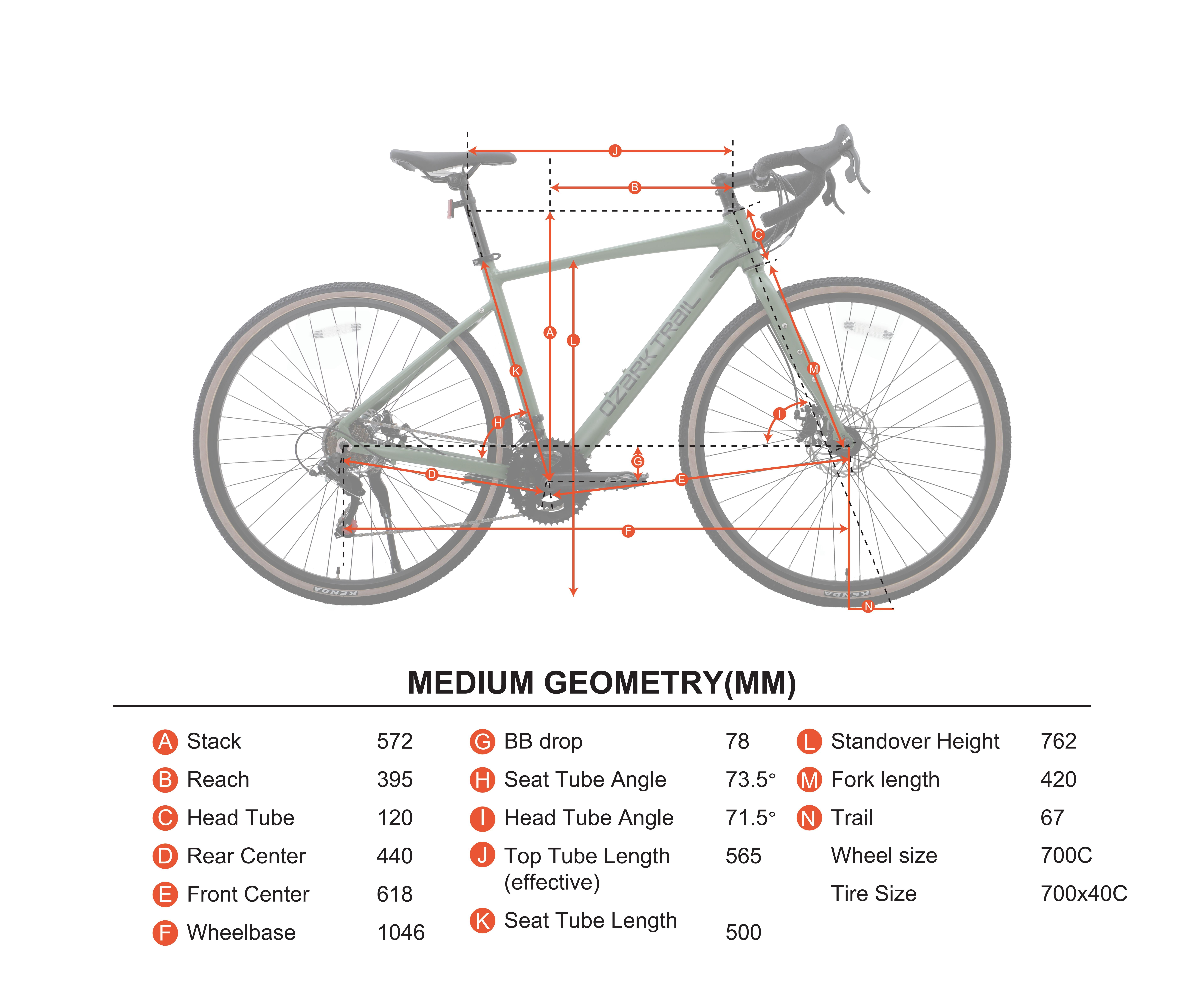 Ozark Trail 700C G.1 Explorer Gravel Bike, Medium Frame, Green, Adult, Unisex Internal cable routing protects cables and gives the bike a clean, sleek look Frame: 6061 Aluminum Gravel bike, Integrated Frame Mounts Fork: Steel front fork with nutserts, Quick Release Weight: 30.4 lbs Shifter: L-TWOO 2*7 speed brake and shifter dual lever Front Derailleur: L-TWOO 2 speed R5007 Rear Derailleur: Shimano Tourney 7 speed TZ500 Crank: 170mm length Bottom Bracket: Neco BC35, 122.5mm, One-piece cartridge Freewheel: 14-28T, 7 Speed Chain: 7 Speed Pedal: Plastic, Wide Platform Saddle: Gravel Saddle, steel rails, 150mm width