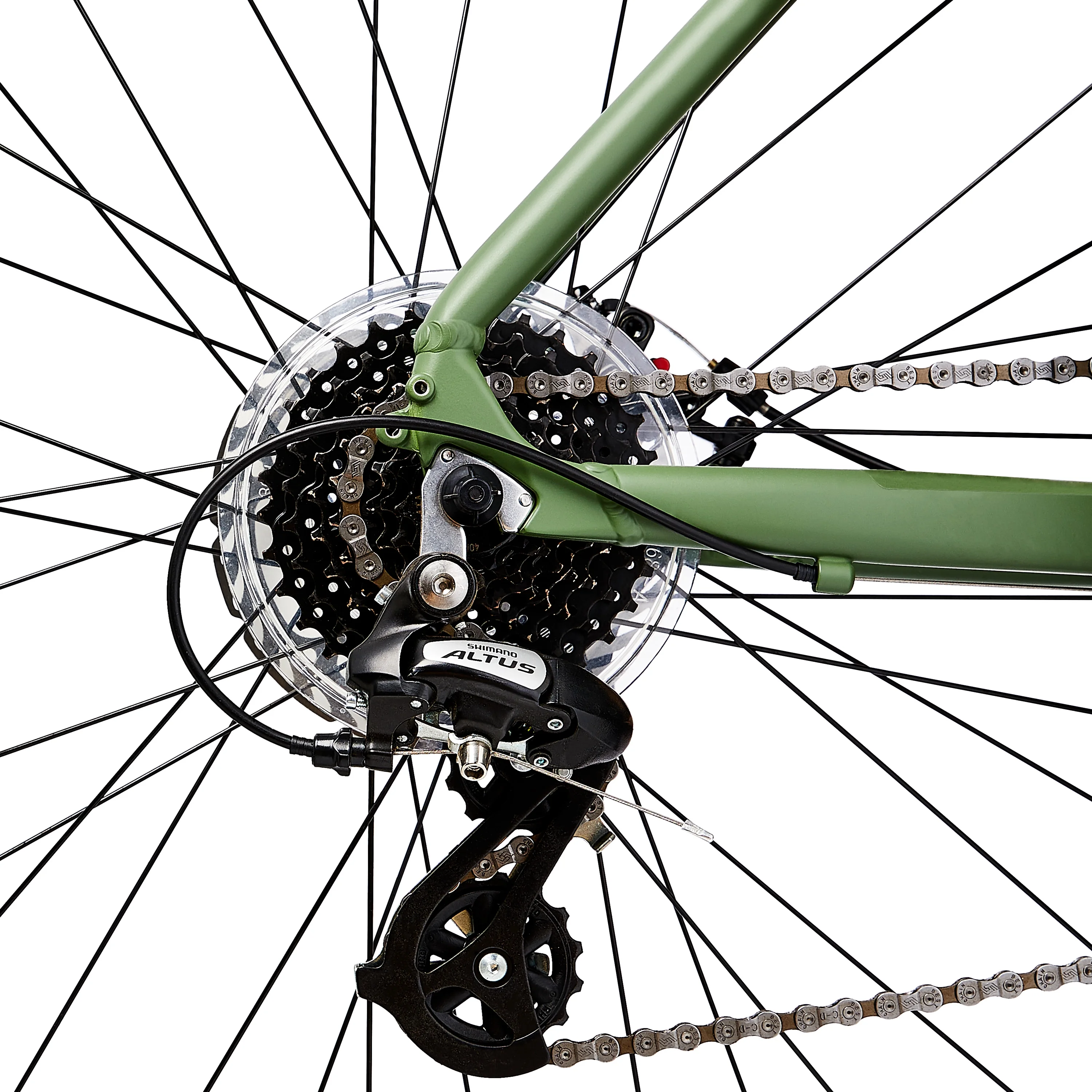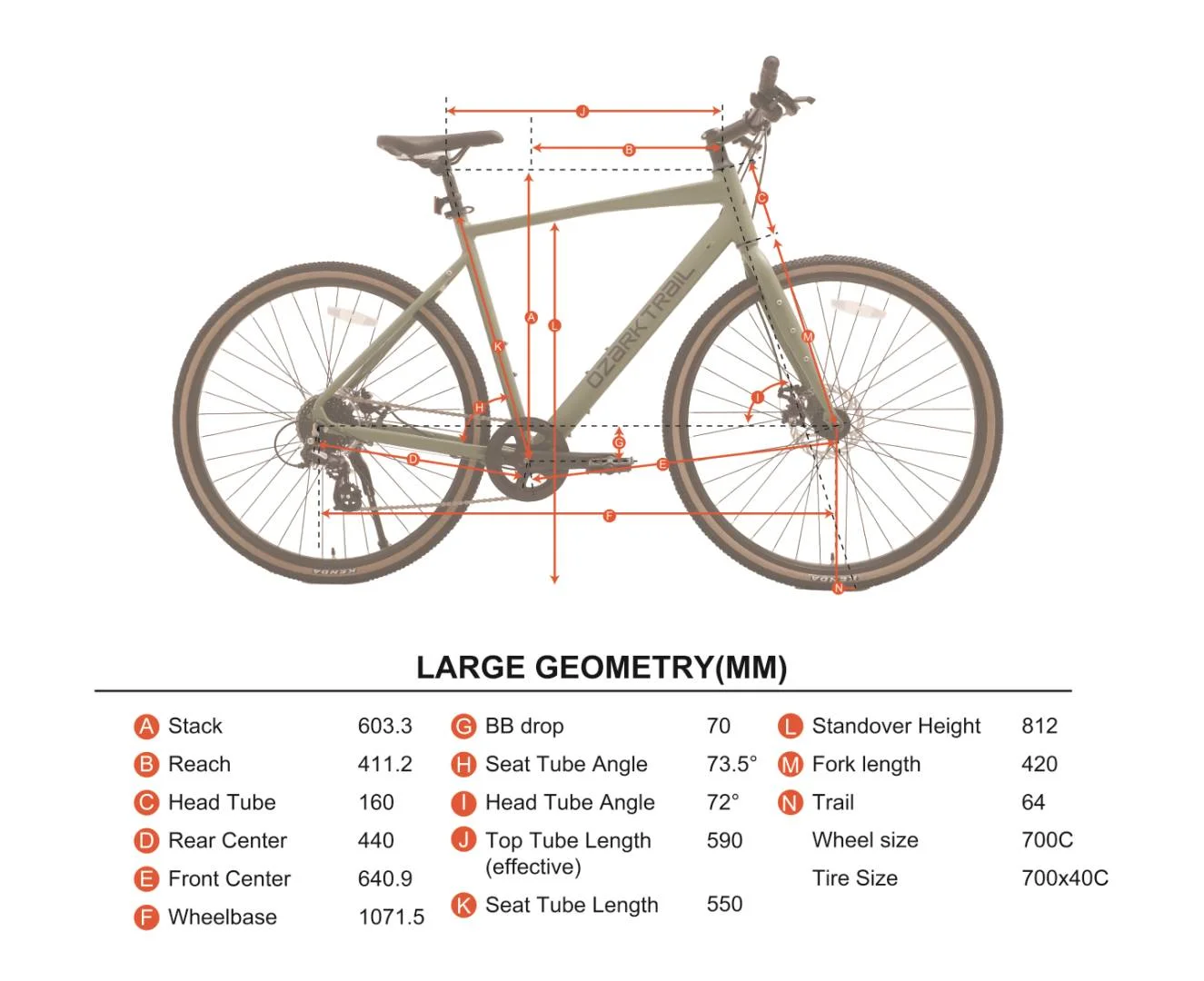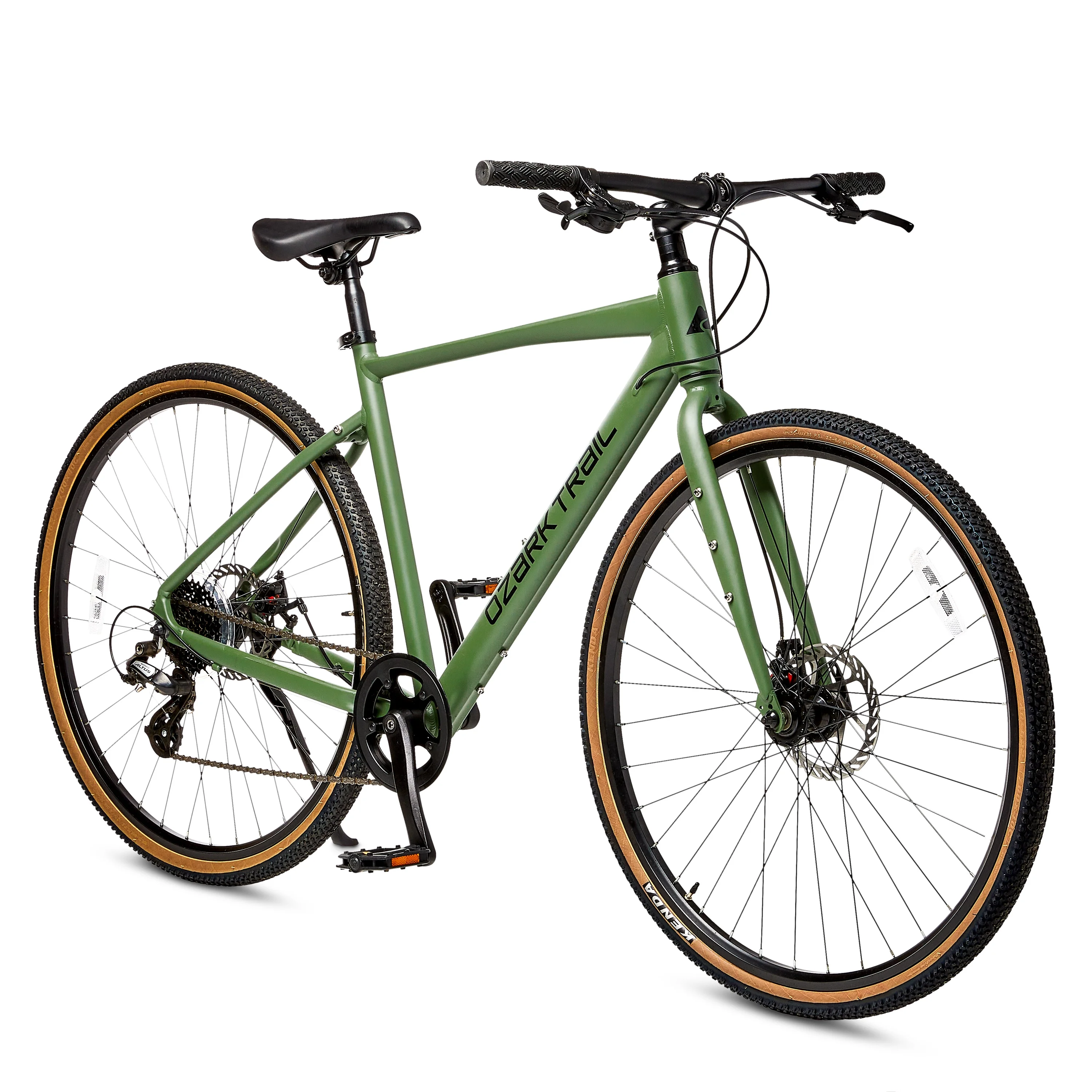 Ozark Trail 700C G.1 Explorer Flat Bar Gravel Bike, Large Frame, Green, Adult, Unisex Internal cable routing protects cables and gives the bike a clean, sleek look Specifications: Frame: 6061 Aluminum Gravel bike with nutserts, Integrated Frame Mounts Fork: Steel front fork with nutserts, Quick Release Shifter: Shimano Altus 1*8 speed trigger Rear Derailleur: Shimano Altus 8 speed SL-M315-8R Cassette: 11-32T, 8 speed Crank: 175mm length Bottom Bracket: Neco 122.5mm, One-piece cartridge Pedal: Plastic Saddle: steel rails, 150mm width Seatpost: 27.2mm, steel, 350mm length Stem: Threadless alloy, 7 degree, 50mm length Headset: EC, caged bearings Brakes: Logan mechanical disc, 160mm front and rear rotors Front Hub: Alloy 6-bolt, 100mm, 108mm QR Rear Hub: Alloy 6-bolt, 135mm, 145mm QR Rims: Double-wall alloy, 36 spokes, 19mm width, presta valves Tires: Kenda 700*40C Assembled Weight: 30.4 lbs