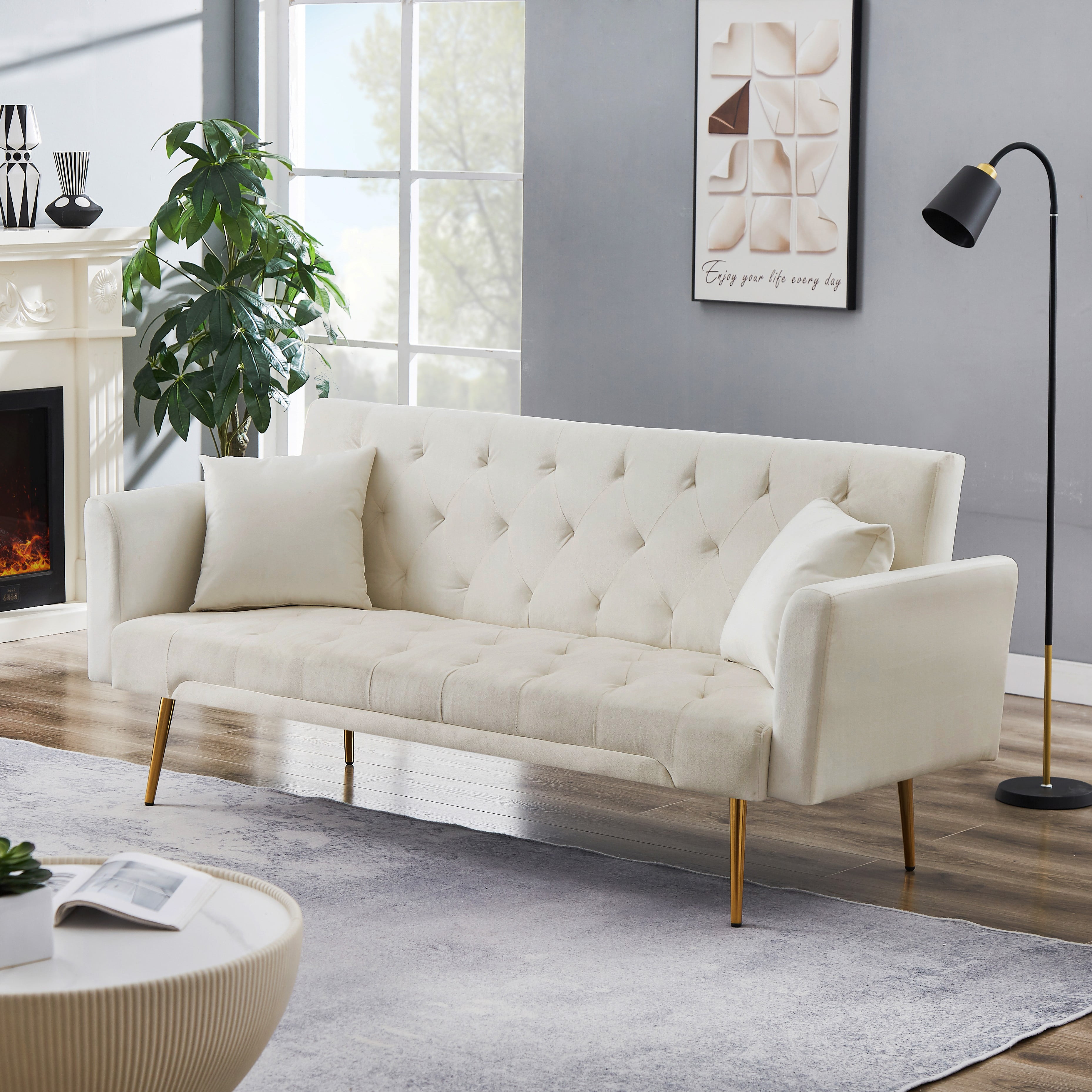 71 Inches Velvet Futon Sofa Bed with 2 Pillows,Modern Convertible Futon Couch with Adjustable Backrest,Beige
