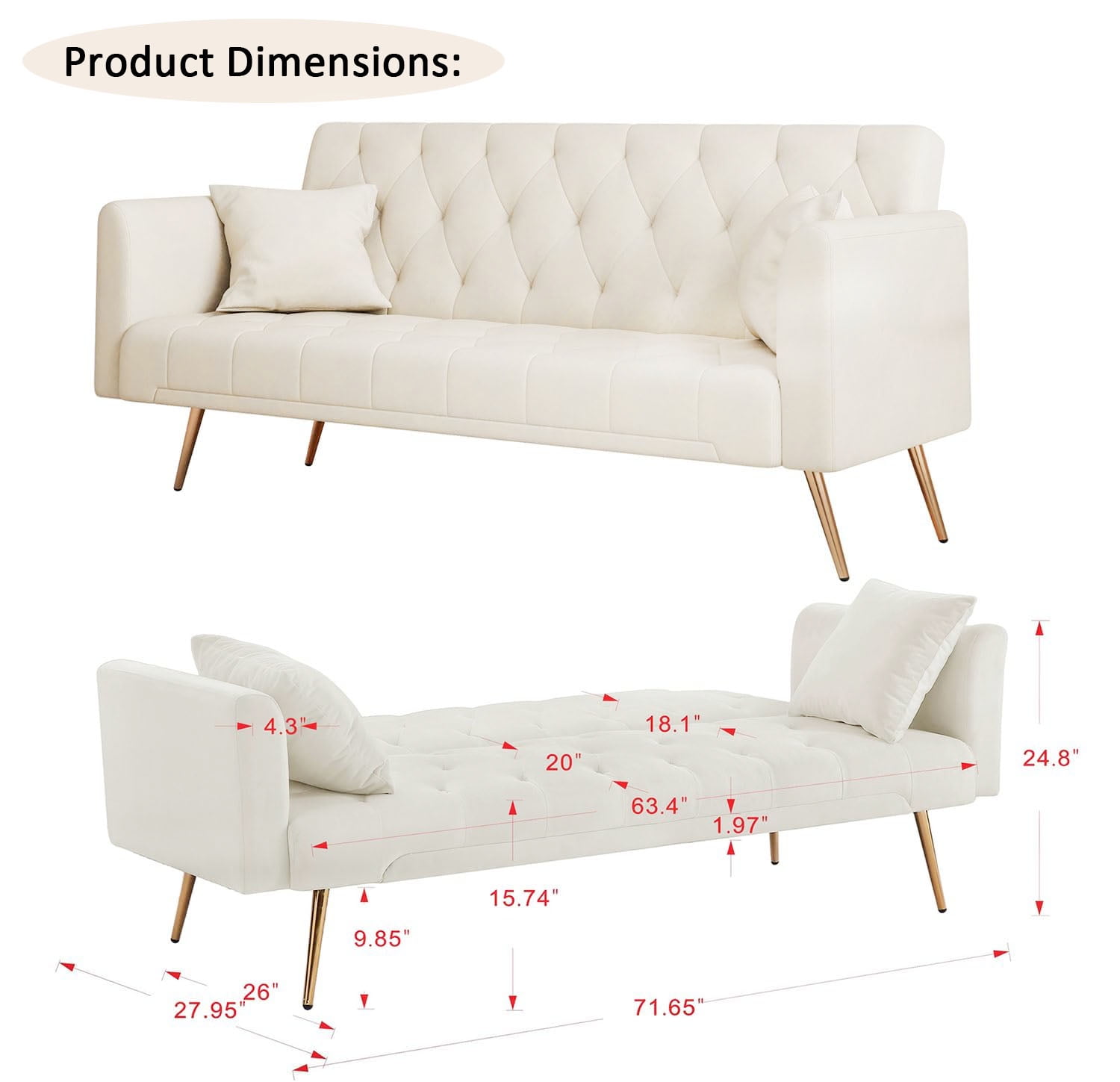 71″ Velvet Convertible Futon Sofa Bed with Golden Metal Legs,3 Angles Adjustable,Contemporary Design for Compact Living Spaces Modern minimalist style with clever features meet harmoniously in this folding sofa,blends into a variety of decor styles. When you are adding new friends to your family,apartment or offfice,our modern velvet sofa bed will always be perfect for you! Sofa:72″(L)x26″(W)x24.8″(H), Futon bed:72″(L)x28″(W)x24.8″(H)Seat Perfect Construction The spacious backrest and tight square armrests,soft sleeping pillow can support your body well. Adjustable Backrest 3 convertible modes,quickly convert to bed, small living space is no problem at all. Comfort Materials The soft velvet surface and the thickened cushion with 4 inch thick high density foam and it will not become out of shape easily. High Quality The futon frame is made of solid plywood and it will not crack easily,weight capacity is better. Easy Assemble Maintain We store the metal legs and assembly hardware in hidden compartments of the sofa base,and you only need to assemble the metal legs on the loveseat to complete the assembly,which only takes you about 15 minutes.