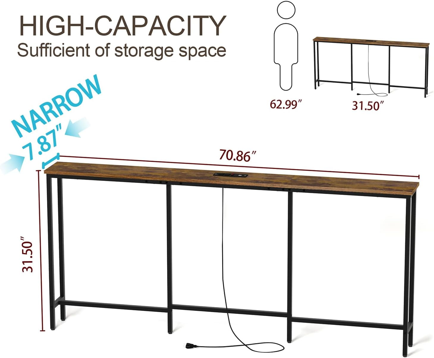71″ Skinny Console Table with Power Outlets, Narrow Sofa Table with USB Ports, Extra Long Entryway Table, Metal Frame, Behind Couch Table for Hallway, Living Room, Brown