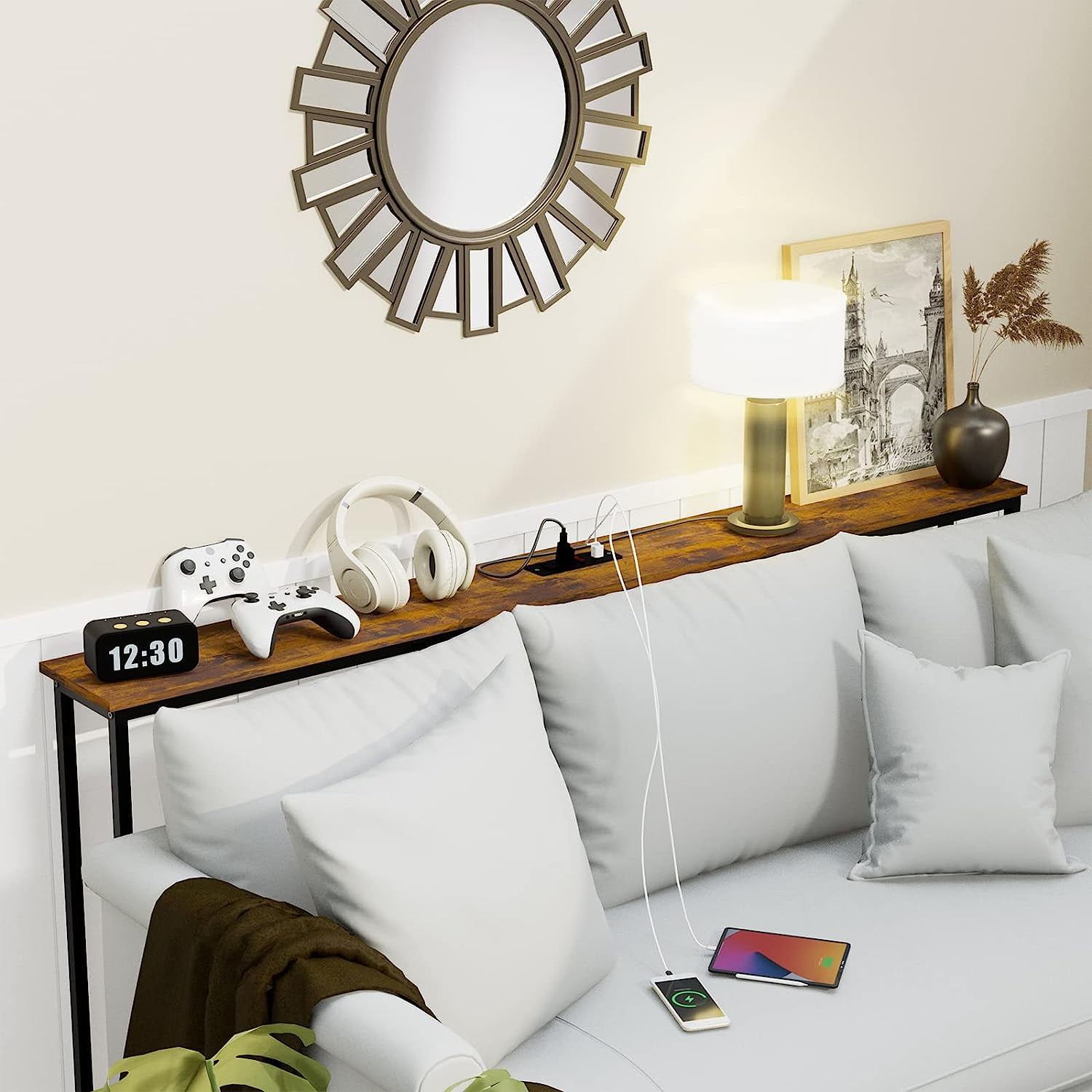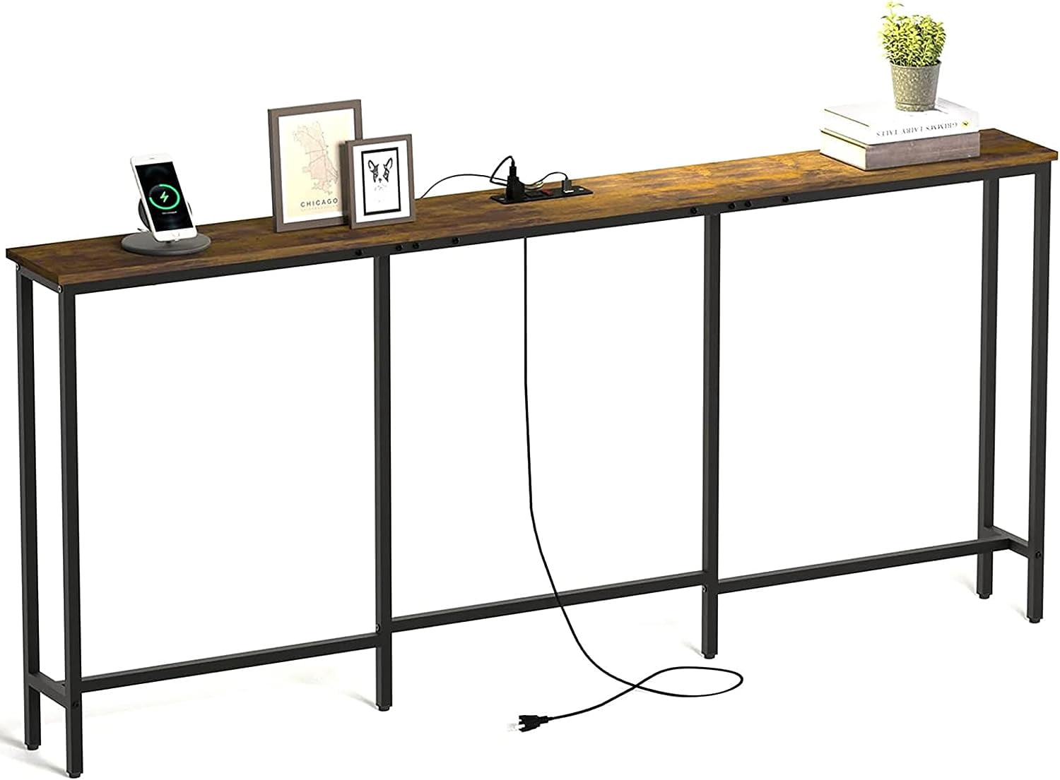 Narrow Sofa Table Behind Couch Table Console Table With Charging Station Extra Long & Narrow Small Size Big Benefits The sofa table with 2 standard 120VAC outlets, 2 USB ports, and 4.9 feet long power cord to rescue the socket behind the sofa or other narrow places and provide storage space to place items, and charging the lamp/computer/laptop/mobile phone. Outlets with USB Ports The sofa table with 2 standard 120VAC outlets, 2 USB ports and 4.9 feet long power cord to rescue the socket behind the sofa or other narrow places and provide storage space to meet the needs of placing items, and charging the lamp/computer/laptop/mobile phone. Reliable Construction Stable & Sturdy Sturdy metal frame, reinforced tubes and 4 adjustable feet pegs to stop it from wobbling, quality particleboard and sturdy iron structure come together to make it work perfectly. The perfect combination of raw materials that meet EPA TSCA Title VI and a sturdy metal frame. Package Contents: 1 x Extra Long Narrow Console Table 1 x Charging Station 2 x Angle Bracket 1 x Assembly Kit 1 x Instructions Specifications Product Size: 70.9″L x 7.9″W x 31.5″H (180 x 20 x 80 cm) Color: Rustic Dark Brown Material: MDF & Steel Frame