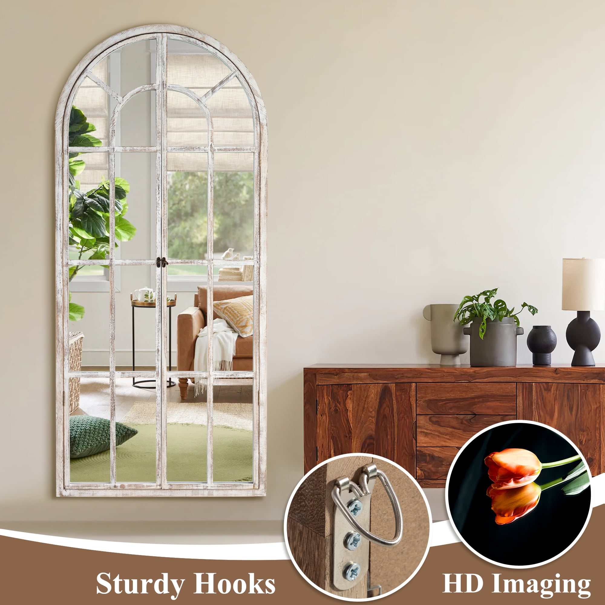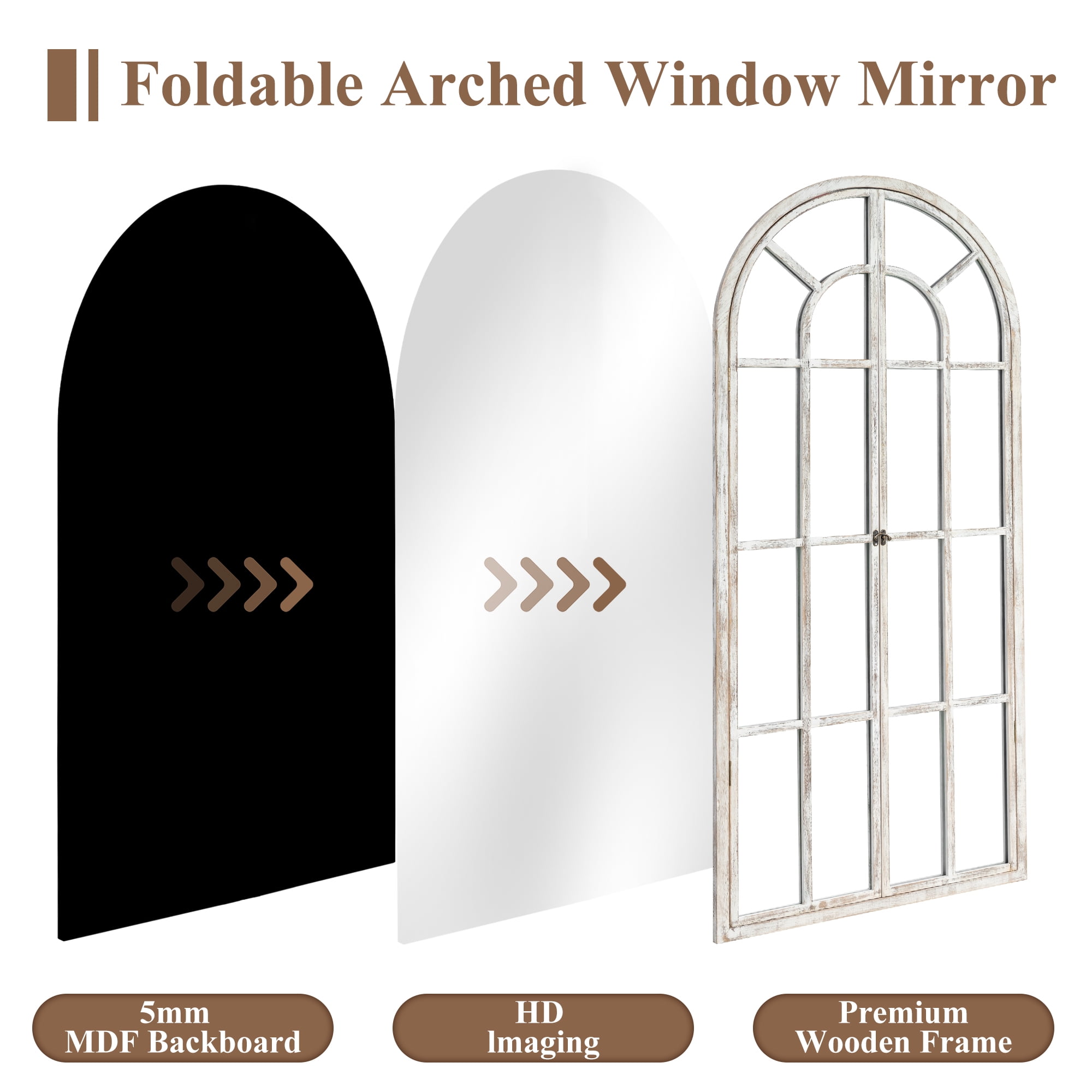 ????This modern full length mirror brings arched window style to any room. ????The 71-inch by 32-inch frame features a premium wooden design to blend seamlessly with your decor while providing years of reliable use. ????Behind the frame is an HD imaging 5mm MDF backboard for a distortion-free reflection so you can check your outfit from head to toe. ????Whether you’re getting ready for the day,styling your hair,or simply admiring your outfit,this floor mirror helps you see yourself in a whole new light. ????The arched top and stately wooden frame give it a touch of elegance that lifts your spirits,while the full length view helps you spot any missed details. ????So step into the frame,stand tall,and let this window mirror help you find your perfect look.