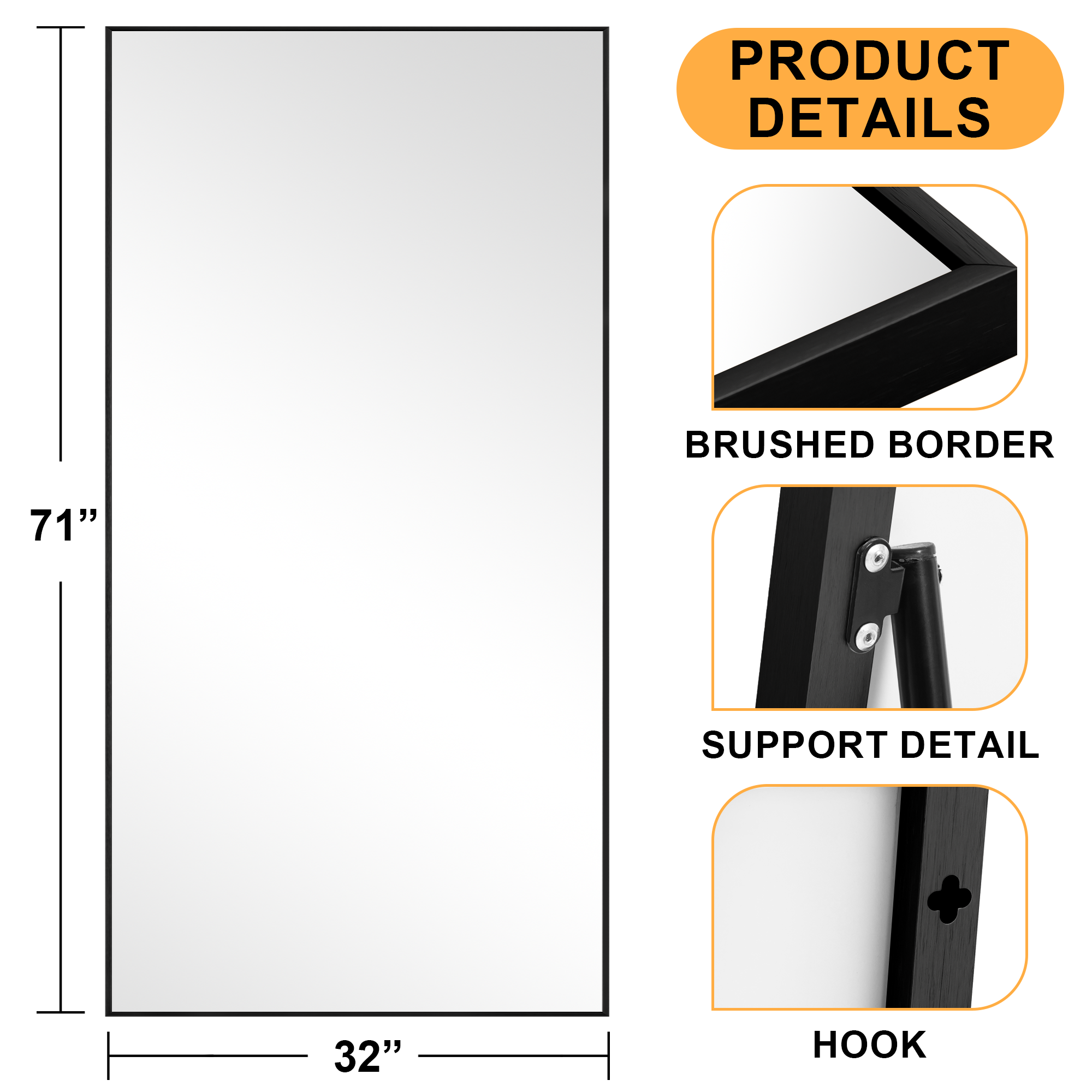 Exquisite Workmanship:Our full Body Mirror is made of high-quality aluminum alloy frame,which is durable and has a shiny appearance.Add shatterproof film on the back of the mirror,you don’t have to worry about sputtering damage caused by breakage. HD Imaging:The full length mirror uses high definition imaging to truly restore and reflect the real world.High transparency glass and quality silver coating will also give you a good image on top. Show Your Beauty From All Angles:The oversized 71×32 inch large dressing mirror will suit your needs!Large enough for you to see your entire figure in a single glance,whether you’re commuting,dating,or having an important interview,you can use it to see if you’re dressed appropriately. Easy Installing & Saving Space:Very easy to move,whether it’s standing on the floor,hanging on the wall or even Leaning.Easy to operate,no need to worry about taking too much time and effort.