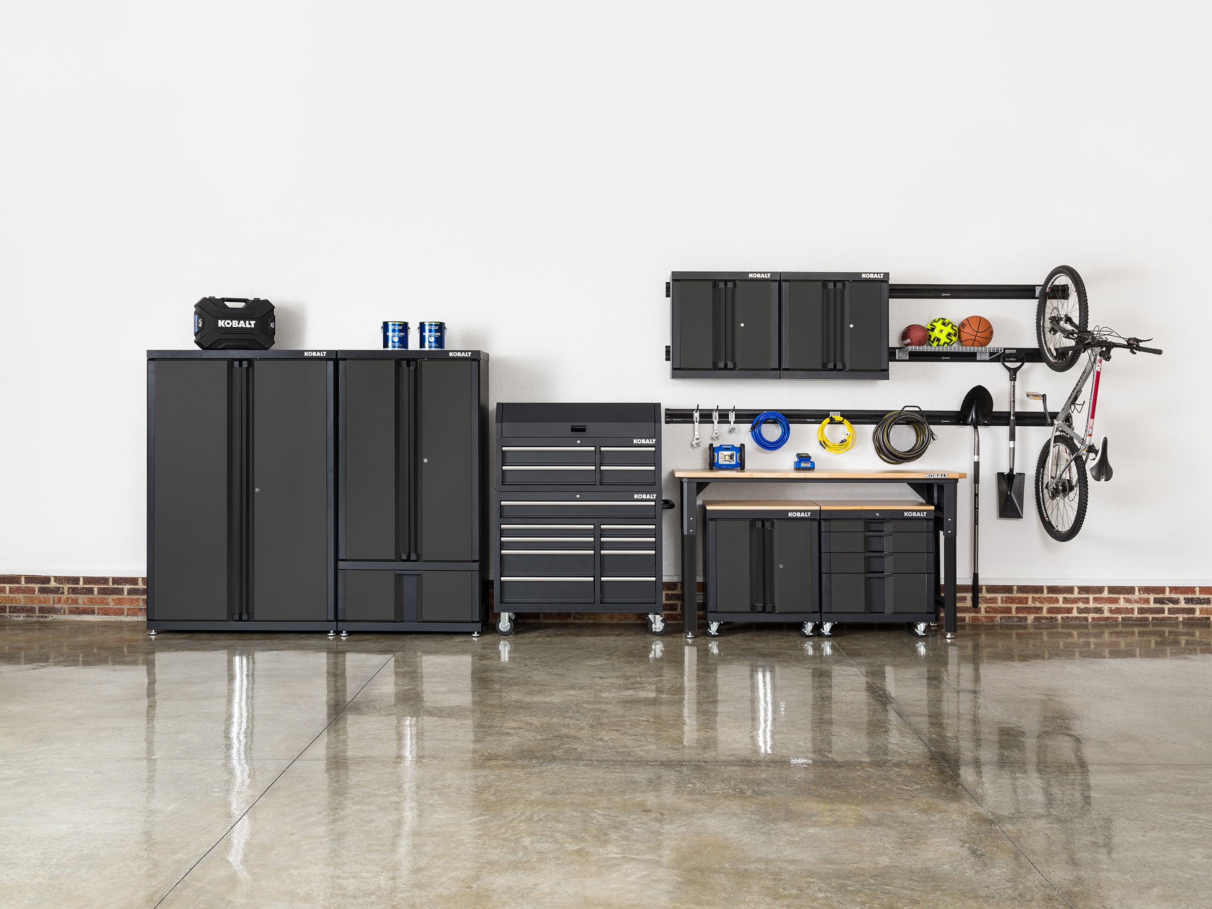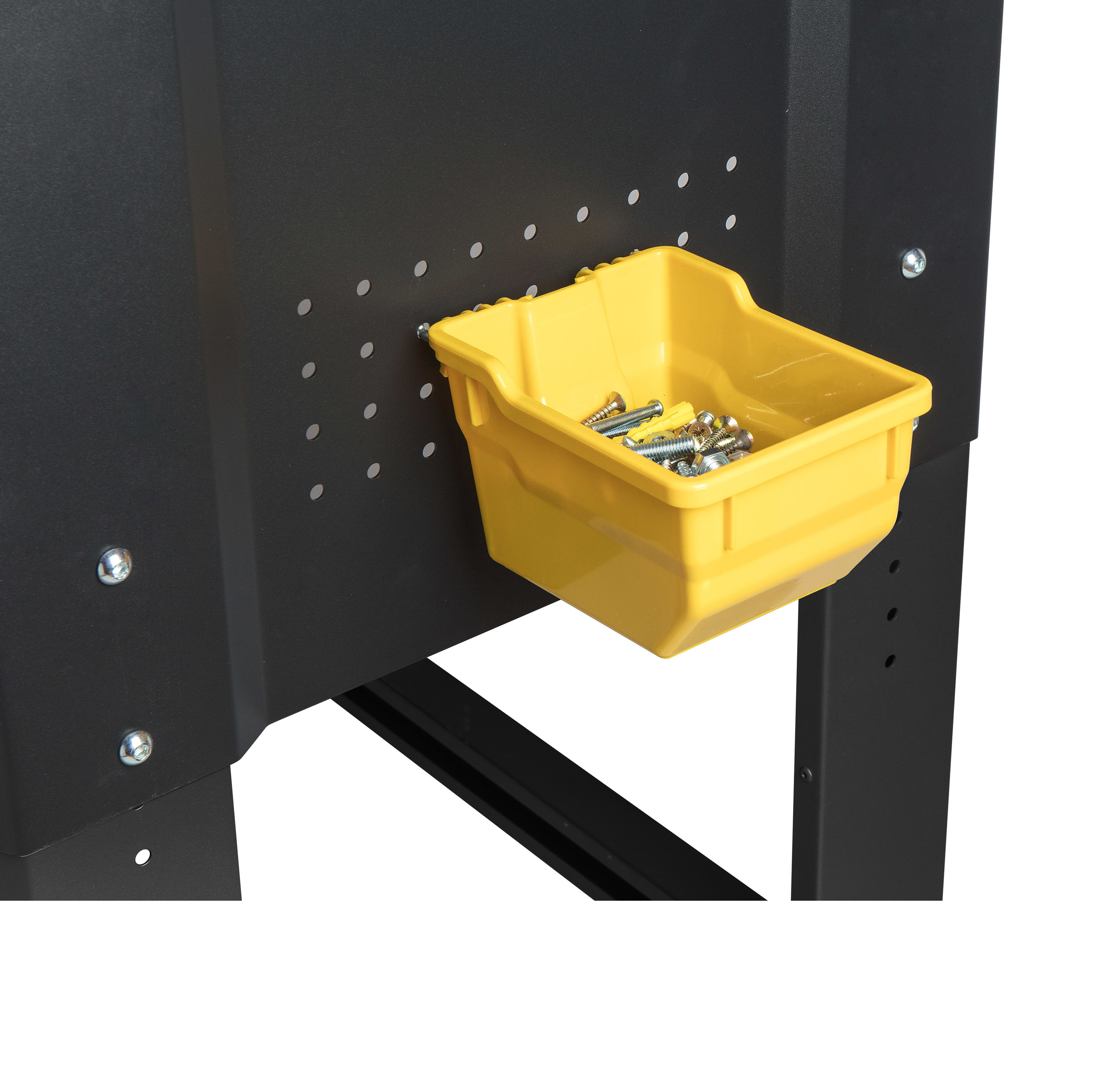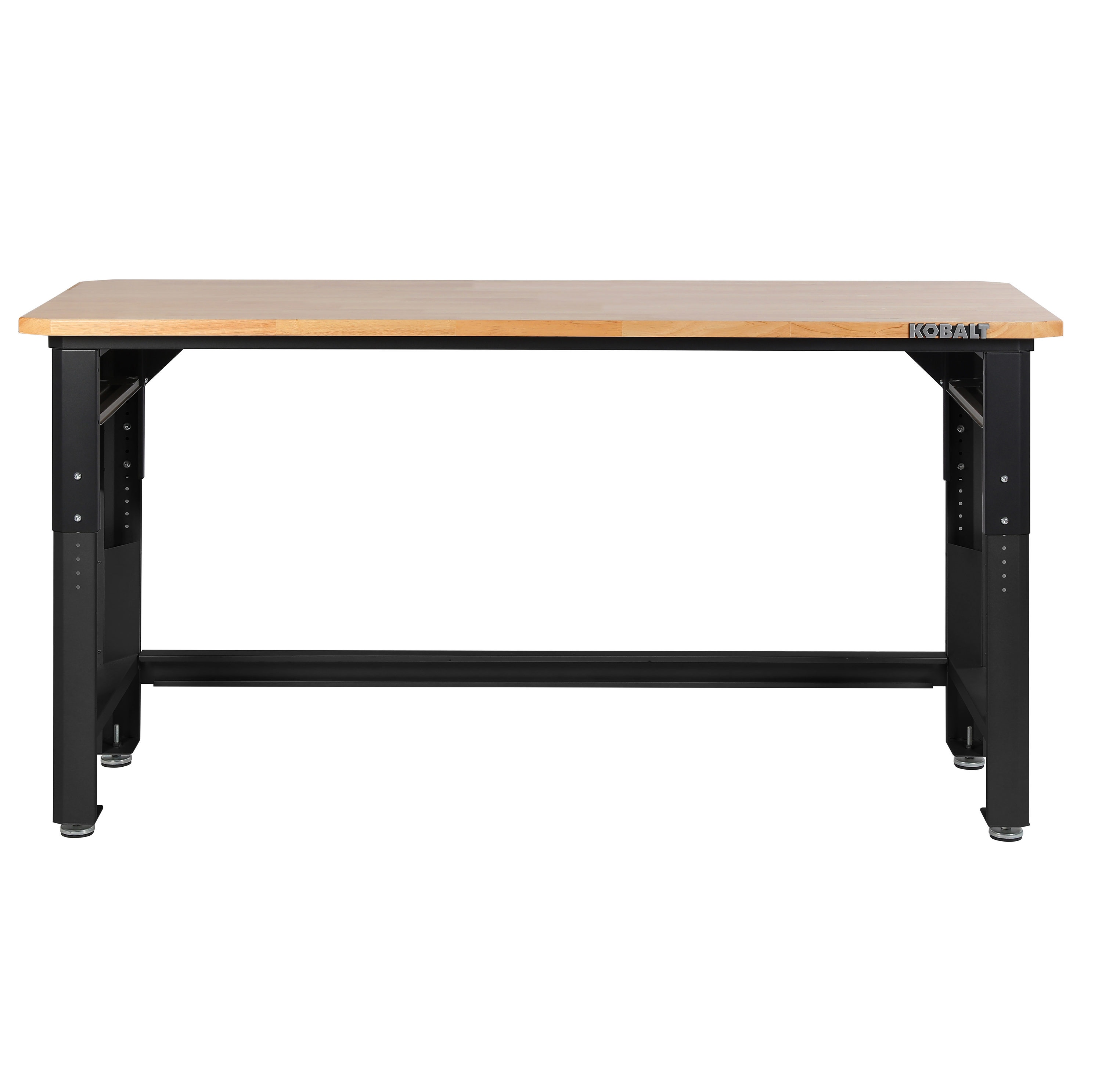 With heavy-duty construction and a powder-coated finish, this work table provides a durable and versatile solution for your garage or office. Built to support up to 2,000 lbs, it features an adjustable height ranging from 32.8″ to 40.8″ in 1-inch increments. At its maximum height, it can accommodate a base cabinet (5193459) and a 4-drawer cabinet (5193460) underneath (sold separately).The 1.18-inch wood top offers a sturdy workspace for projects, crafts, or working-from-home, while the included perforated side panels provide convenient storage for bins, pegs, and small tools (sold separately). Uneven floor? No problem…the adjustable feet can compensate. All assembly hardware is included for easy setup. Assembled dimensions: 32.8″–40.8″ H × 72″ W × 24″ D.