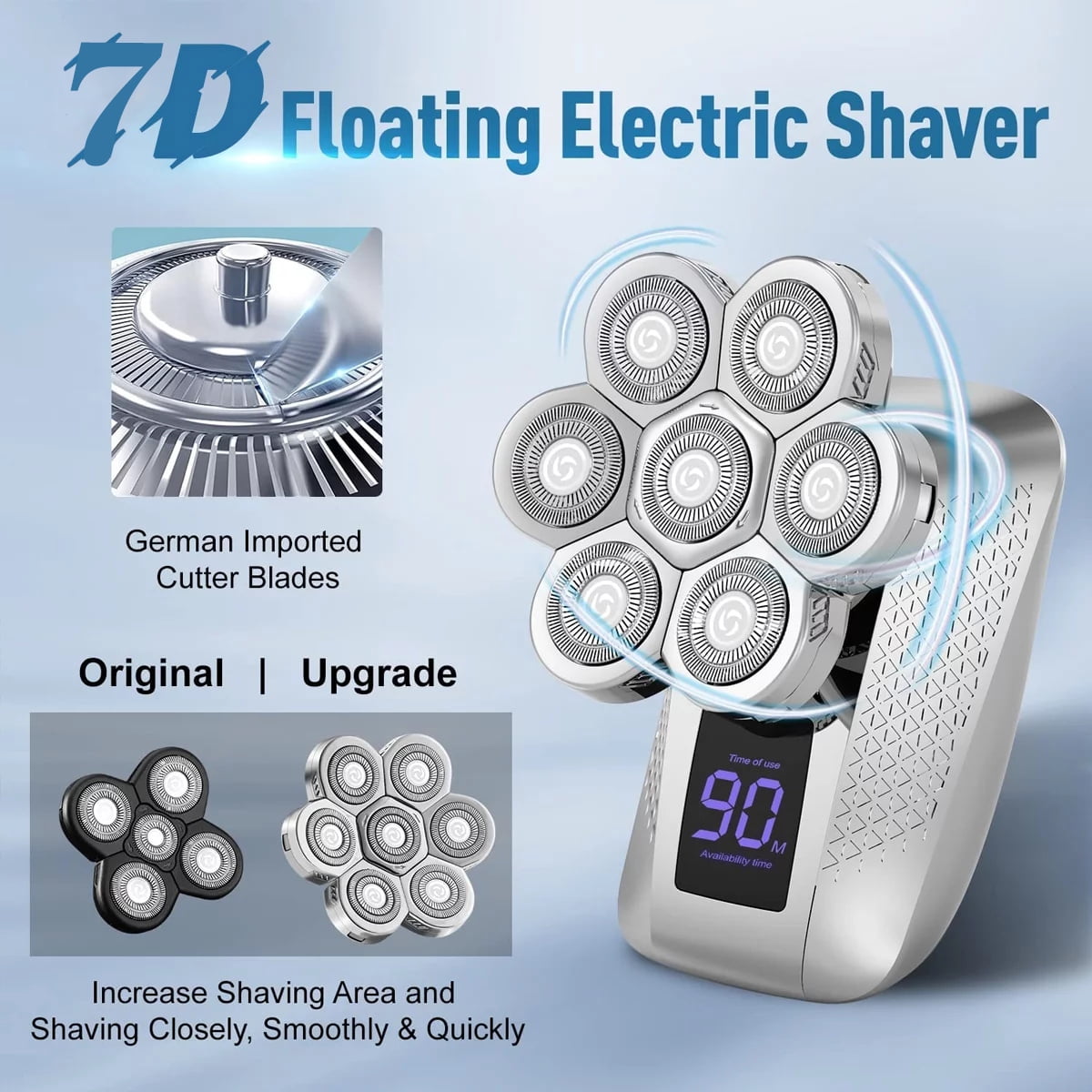 Say goodbye to uneven shaves and hello to a clean, fresh look with VANELC Head Shaver. Trust us to provide you with the ultimate grooming experience. HIGHLIGTHS: MAGNETIC ATTACHMENT DESIGN: The magnetic attachment design with 7 blade heads allows for easy removal and cleaning. With just a simple step, you can effortlessly detach the blade heads, making cleaning a breeze. This design ensures hygiene and cleanliness, providing you with a sanitary shaving experience every time. FLOATING BLADE DESIGN: We have incorporated a floating blade design to better conform to the contours of your skin. Unlike traditional products, our floating blade technology adapts to the facial contours and curves, delivering a comfortable and precise shaving experience. This means smoother movements, reduced discomfort, and minimized friction, resulting in a closer and more accurate shave. DOUBLE BLADE & PROTECTIVE NET – Bald head shaver for men uses double-layer durable blade to accurately capture long and short hairs, which are precise, sharp and safe. The double net provides protection and reduces irritation. The intelligent induction system effectively prevents hair pinching. WET & DRY SHAVER – Our head and face electric razor shaver uses water resistance technology, allowing you to shave in the shower under running water. Wet shave with cream, gel, or foam or dry shave. No matter what, it allows you a comfortable dry shave or a refreshing wet shave. Detachable and washable head makes you easy to clean it. USB CHARGING & LED DISPLAY – 7D head shaver supports various USB devices for charging, 2 hours of fast charging can provide 90 minutes of working time. The bald head shaver for men with LED Display which you could easily check the power percentage. Low battery reminder, water washing reminder more intelligent. 100% SATISFACTION GUARANTEE – Professional 5 in 1 Grooming Kit, Different types of head razor shaver accessories meet all your personal facial shaving needs for beard and hair. At VANELC, we provide 1 year warranty and 24/7 Service. If you encounter any problems during use 7D electric head shaver, please feel free to contact us. Including a Variety of Accessories: Hair clipper Hair clipper comb (3/5/7mm) Nose hair trimmer Facial cleaning brush and massager Cleaning brush USB charging cable