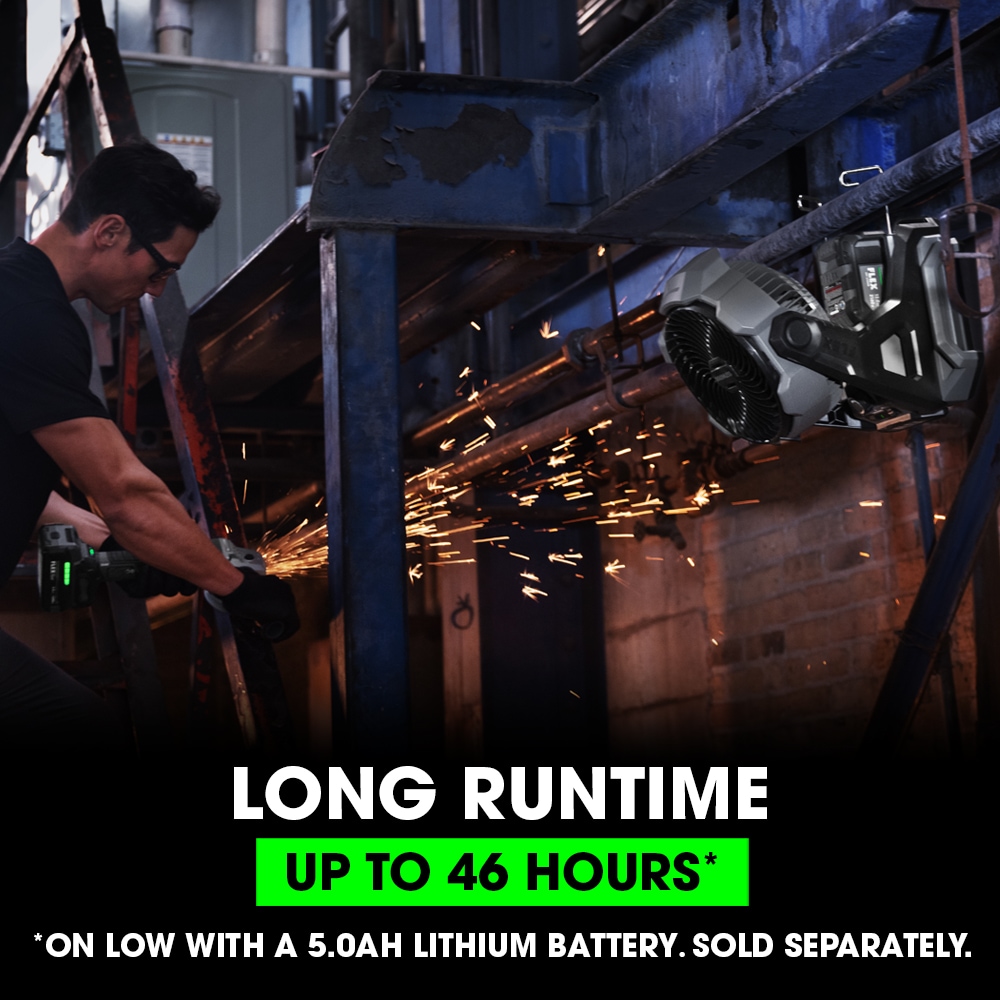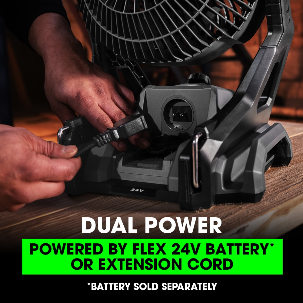 The FLEX 24V Jobsite Fan provides up to 46 hours of portable air flow on a single charge with a 5.0Ah lithium battery (sold separately) on low. Dust and fumes don’t stand a chance against the force of 1100 CFM. Ideal for improved circulation in close quarters, freshly painted areas, and any place you need to clear the air. Designed to seamlessly attach to the FLEX Stack Pack™ storage case for optimized organization and accessibility. Variable speed settings and an oscillation selector puts you in control, and its innovative Stack Pack™ connection means it won’t tip over. Includes the FLEX Advantage for ultimate cross-compatibility—ensuring unmatched battery power, runtime, and faster charging (battery and charger sold separately). Protected by the FLEX Limited Lifetime Warranty when registered within 30 days of purchase at registermyFLEX.com through December 31, 2025.