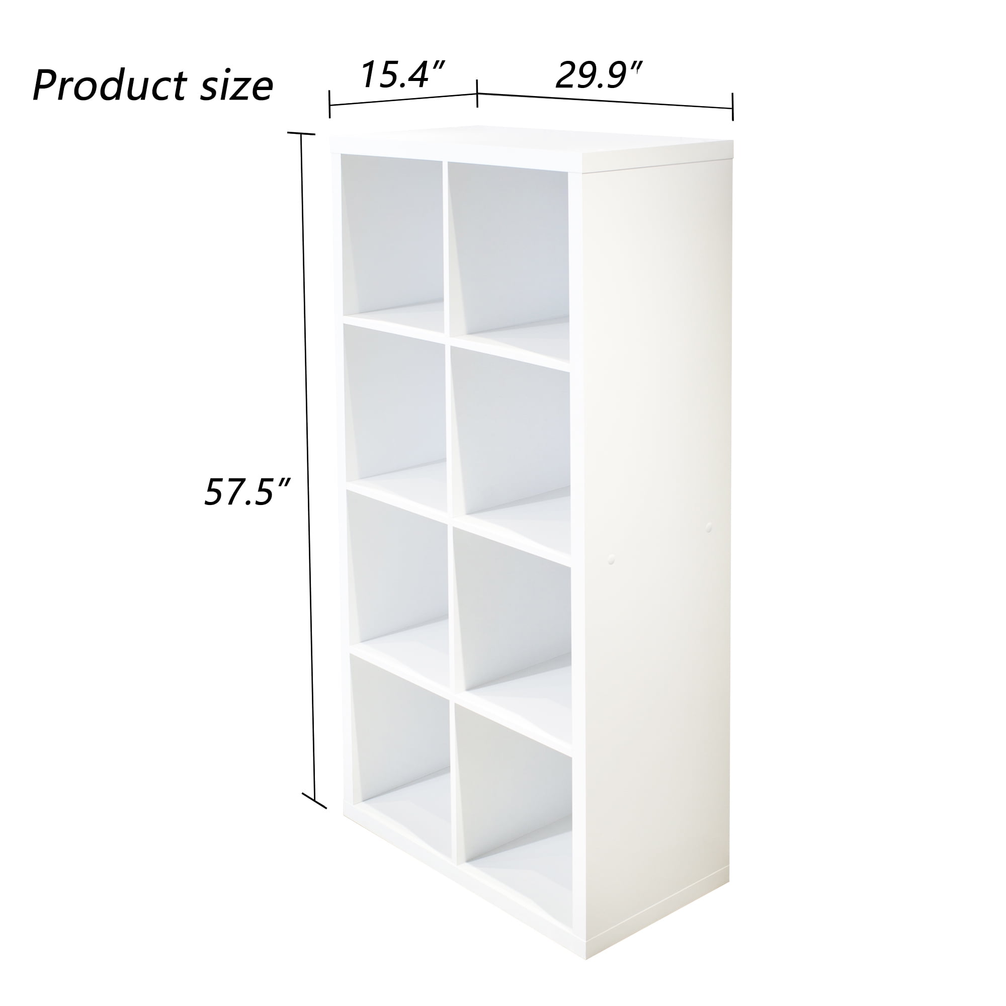 Modern and simple design; 8-Cube design with eight square;Open back storage cube organizer ; It is easy matching with any type of furniture and perfect for office,study,bedroom,living room. Large storage and display for any living area in your home for books,toys,garments,picture frames,decorative items,hobbies,office supplies or keepsakes ; Making your living,studying or working area tidy. Measure 29.92″W*15.35″D*57.52″H,57.33 LBS.; Made of high quality MDF and particleboard,which is durable and easy to clean. White or walnut color can be selected according to your needs.