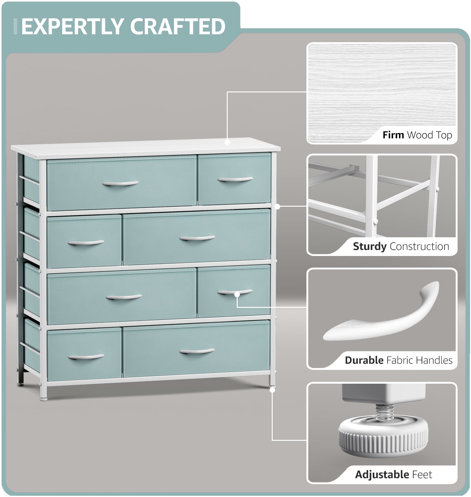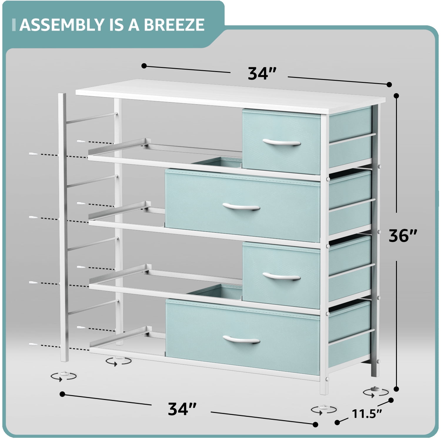 8-DRAWER DRESSER (AQUA) — Style meets function with this dresser chest, complete with a wood surface and colorful storage drawers — Pairs beautifully with the Sorbus Foldable Furniture Collection DISPLAY & DE-CLUTTER — Wood top provides hard surface for displaying books, lamps, alarm clocks, electronics, and more — Drawers great for storing baby and kid clothes, blankets, linens, toys, plushies, accessories, knitting supplies, and household clutter KID FRIENDLY DESIGN — Sleek wide storage — Made with strong steel frame and durable MDF wood top with smooth white finish — Drawers made of breathable, non-woven fabric — Pastel colors in teal, yellow, peach, pink, aqua, purple — Wipe clean — Minimal assembly required — Hardware and instructions INCLUDED — Measures approximately 34” L x 11.5” W x 36” H