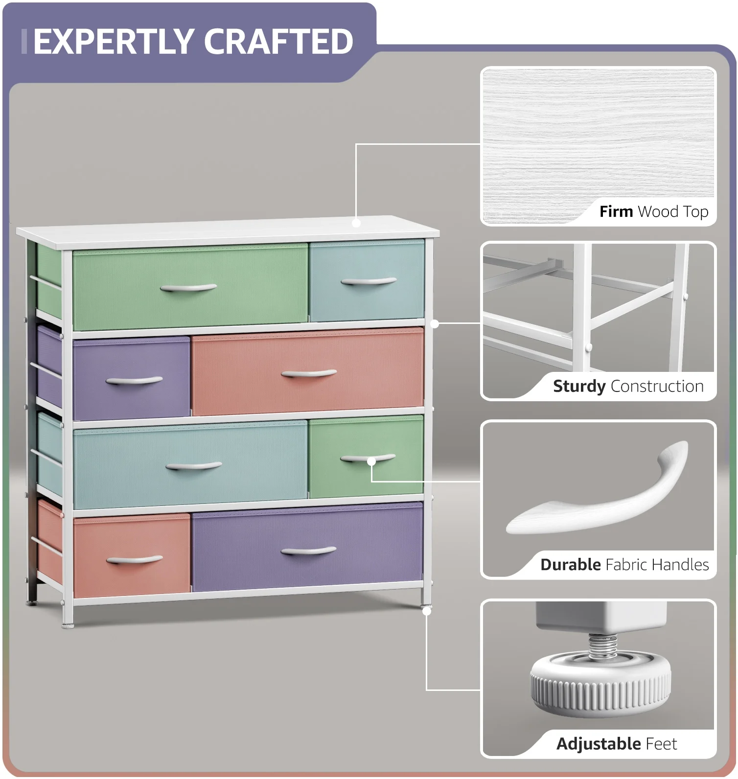 8-DRAWER DRESSER (Pastel) — Style meets function with this dresser chest, complete with a wood surface and colorful storage drawers — Pairs beautifully with the Sorbus Foldable Furniture Collection DISPLAY & DE-CLUTTER — Wood top provides hard surface for displaying books, lamps, alarm clocks, electronics, and more — Drawers great for storing baby and kid clothes, blankets, linens, toys, plushies, accessories, knitting supplies, and household clutter KID FRIENDLY DESIGN — Sleek wide storage — Made with strong steel frame and durable MDF wood top with smooth white finish — Drawers made of breathable, non-woven fabric — Pastel colors in teal, yellow, peach, pink, aqua, purple — Wipe clean — Minimal assembly required — Hardware and instructions INCLUDED — Measures approximately 34” L x 11.5” W x 36” H