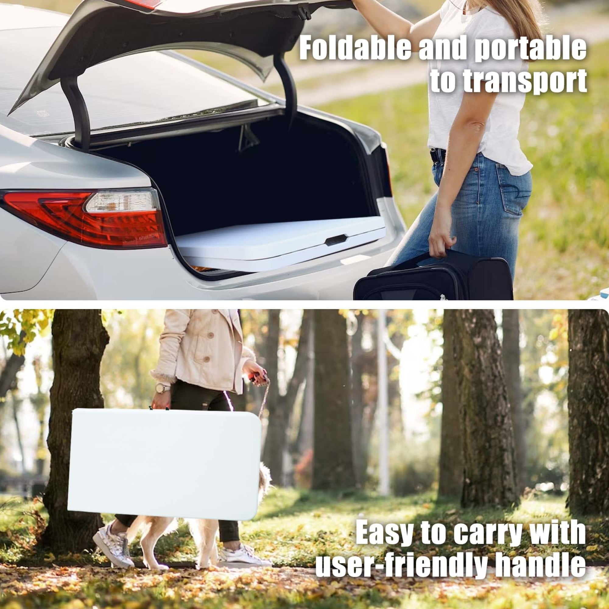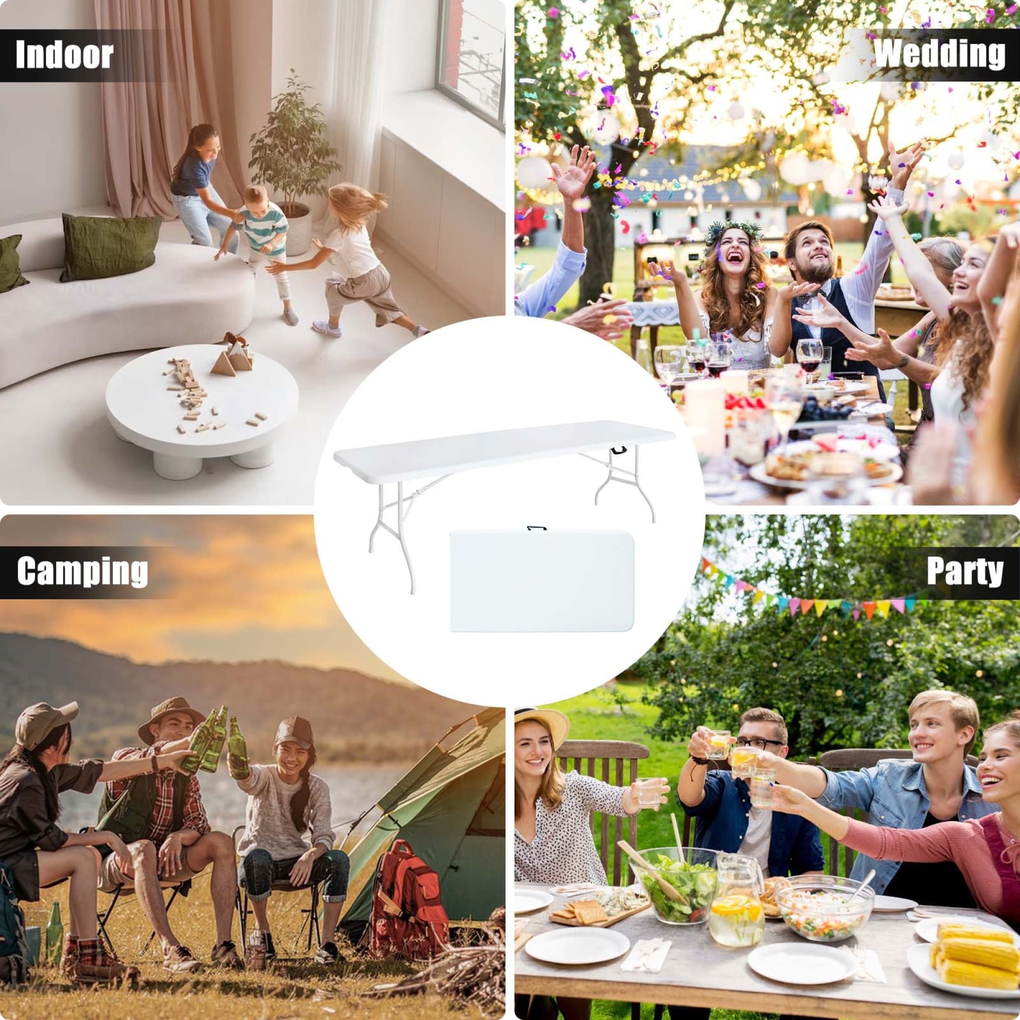 HEAVY-DUTY TABLE TOP: Place food. drinks, and much more on the strong, easy-to-clean table top with high-quality plastic. INDOOR/OUTDOOR USE: Versatile use makes it perfect as a dining or game table for outdoor cookouts or birthday parties, or as a servino or display table for indoor events. STURDY SUPPORT: Powder-coated steel legs, frame joint locks.and non-slip rubber feet help to keep the table in place during every event . PORTABLE: Foldable design includes a side lock and handle.making it easy to take on the ao or store away a compact space when not in use. OVERALL DIMENSIONS:243.8(L)x 76.2(W) x 72.3cm (H); Weight Capacity:135kgs Package dimensions:127 X82.8 X10.6 cm N.W./G.W.: weight: 18kg/20kg 8FT camping table