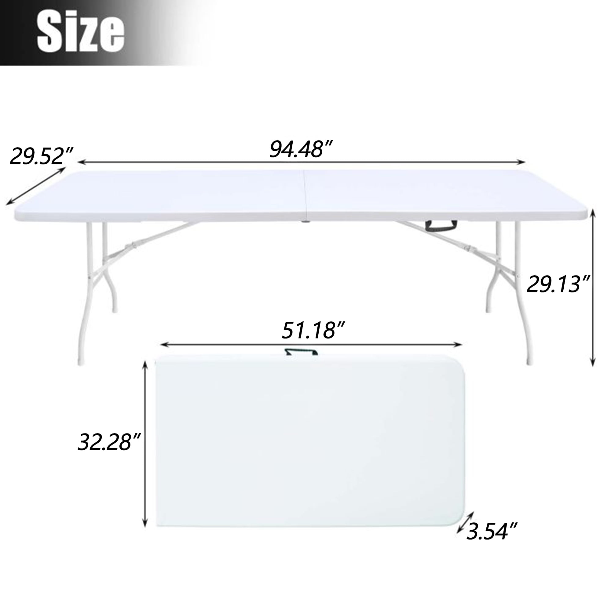 HEAVY-DUTY TABLE TOP: Place food. drinks, and much more on the strong, easy-to-clean table top with high-quality plastic. INDOOR/OUTDOOR USE: Versatile use makes it perfect as a dining or game table for outdoor cookouts or birthday parties, or as a servino or display table for indoor events. STURDY SUPPORT: Powder-coated steel legs, frame joint locks.and non-slip rubber feet help to keep the table in place during every event . PORTABLE: Foldable design includes a side lock and handle.making it easy to take on the ao or store away a compact space when not in use. OVERALL DIMENSIONS:243.8(L)x 76.2(W) x 72.3cm (H); Weight Capacity:135kgs Package dimensions:127 X82.8 X10.6 cm N.W./G.W.: weight: 18kg/20kg 8FT camping table