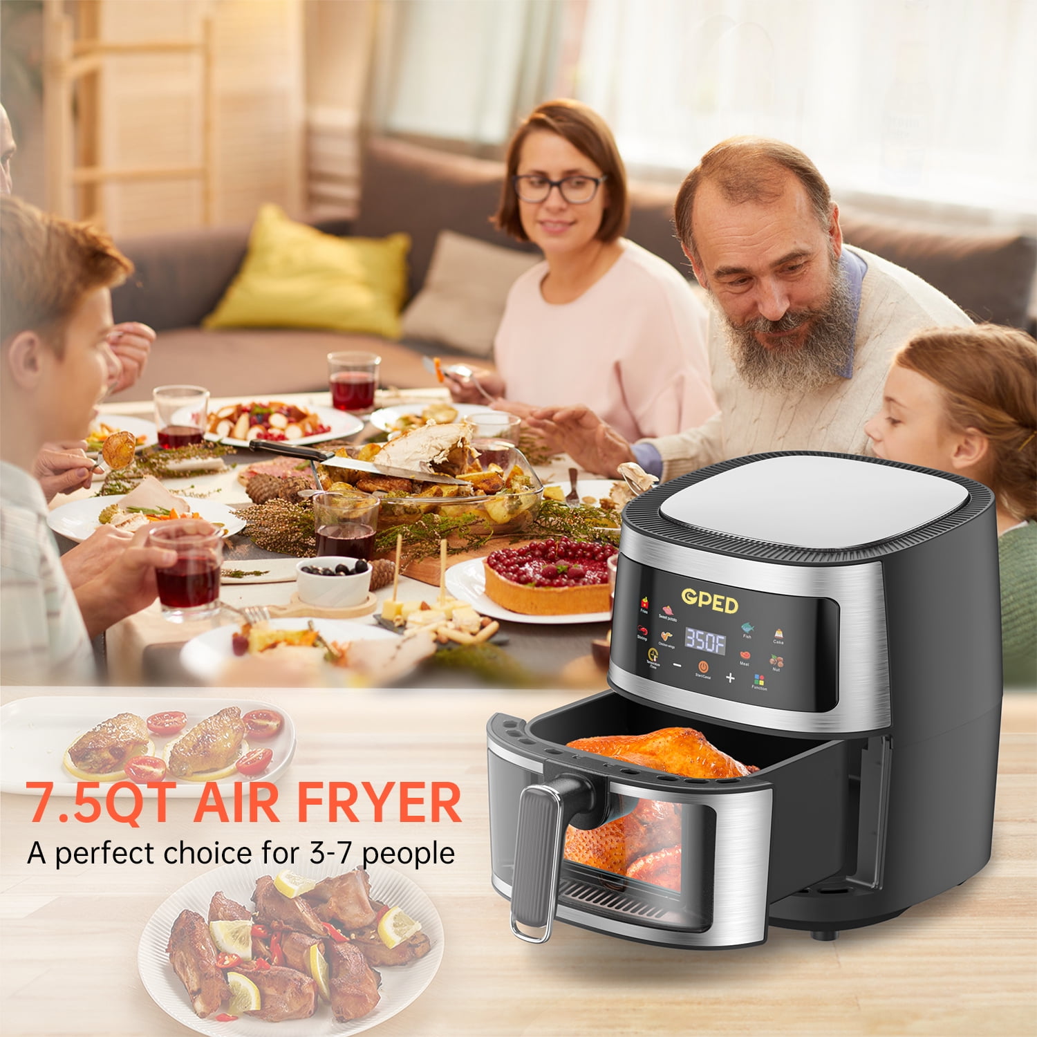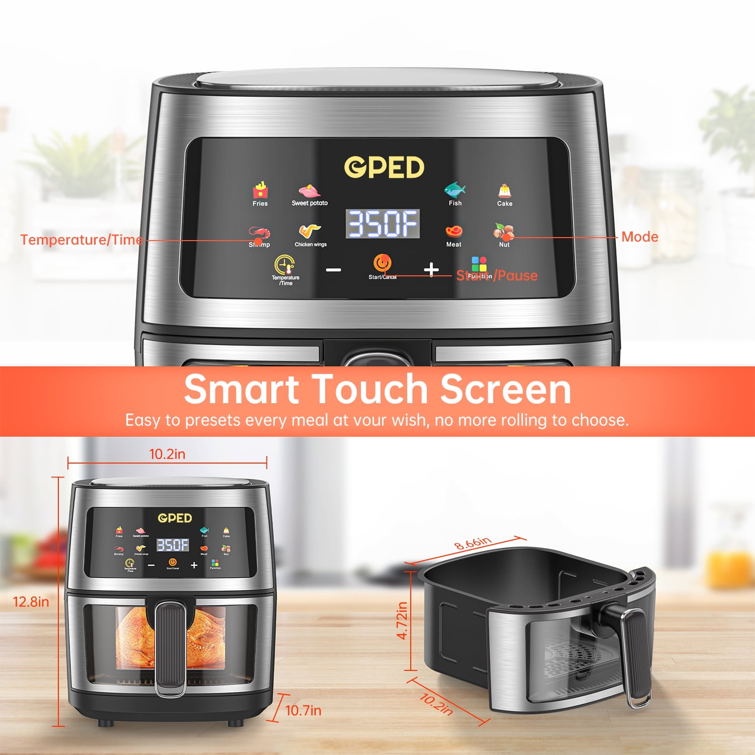 Healthy Cooking Made Easy GPED Air Fryer/Visible Cooking Window /One-Touch Screen with 8 Functions/Nonstick and Dishwasher-Safe Basket. Our air fryers makes it easy to cook your favorite foods without the added oils and fats, making it perfect for anyone who wants to live a healthier lifestyle. With its sleek design and user-friendly features, it’s a must-have appliance for any kitchen! Easily Monitor Your Cooking The GPED Air Fryer with a Clear View Window and internal light is the perfect choice for keeping an eye on your food while it cooks. 360�air circulation system deliver deliciously crispy and juicy results without excess oil. Enjoy golden brown meals with ease. 8 Preset Recipes Cooking Functions The GPED air fryer’s one-touch screen features 8 preset recipes (Fries, Sweet Potato, Fish, Cake, Shrimp, Chicken Wings, Meat, Nut) with precise temp & time settings. 7.5 QT Large Capacity Square basket design of 7.5 QT air fryer is sufficient for larger cooking capacity than round ones, which can fit a max 5~6 lbs whole chicken to serve 3~7 people in just one go! With 50PCS Air fryer paper liners Comes with 50PCS Air fryer paper liners keeps the basket clean. Also easy for you to remove and store. GPED air fryer cooks by 360�circulating hot air, offer you crunchy food with little to no oil. Specifications: Power: 1400 W Capacity: 7.5 Quart Timer: 0 – 30 Minutes Temperature: 150�F – 400�F Product Length: 10.7in Product Height: 12.8in Product Weight: 11lb Package Contents: 1 x 7.5QT Air Fryer 50 x Air Fryer Paper Liners 1 x User Manual 1 x Recipe Book