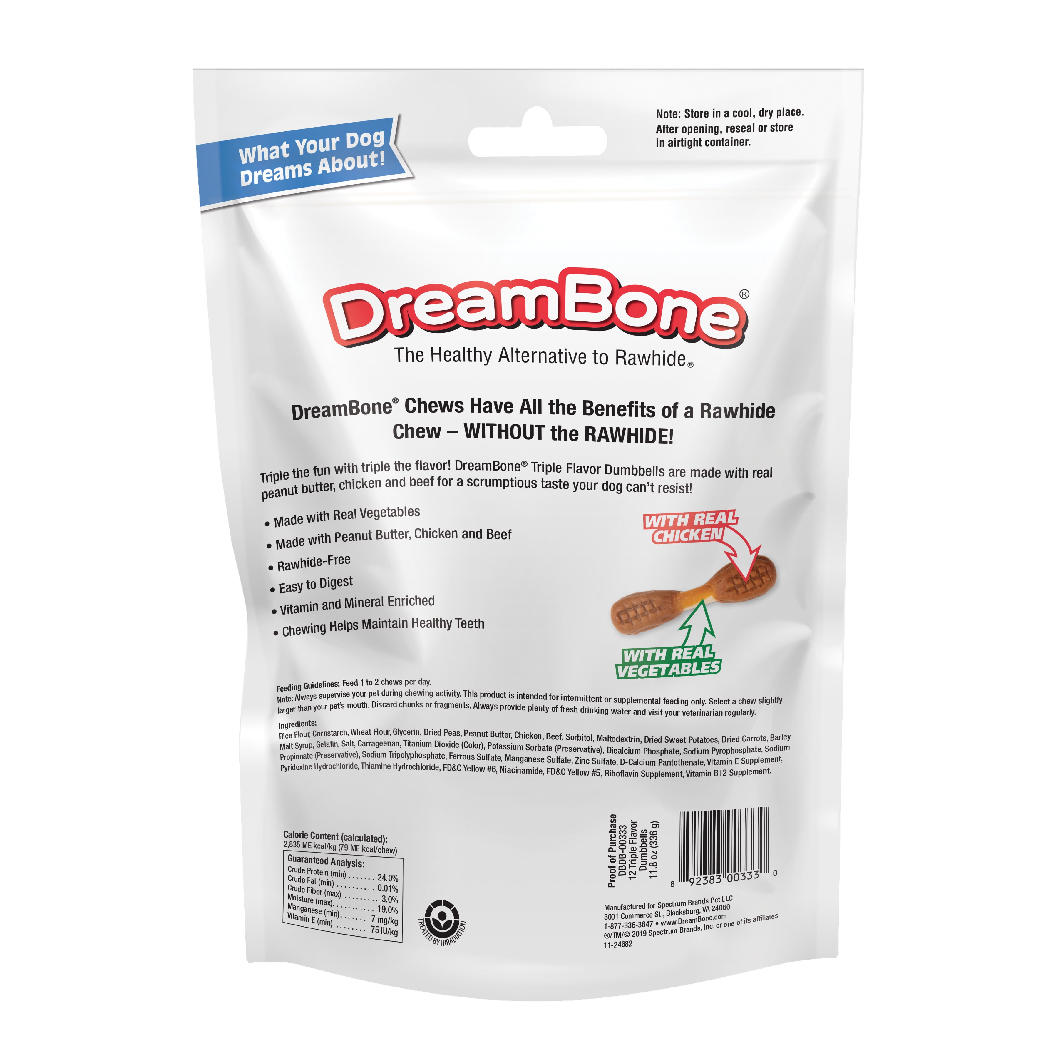 DreamBone® chews have all the benefits of a rawhide chew…without the rawhide. These no-rawhide DreamBone® Triple Flavor Dumbbells are made with real peanut butter, chicken and beef for a scrumptious taste your dog can’t resist! That’s triple the fun with triple the flavor! Made with real peanut butter, chicken and beef and vitamin and mineral enriched, DreamBone Triple Flavor Dumbbells are a healthy alternative to rawhide with an irresistible taste dogs dream about. Treat your pup to these easy-to-digest and 100 percent delicious chews. Chewing helps maintain healthy teeth. Contains 12 chews. Give your dog one to two DreamBone chews per day. Always supervise your pup during chewing activity. These chews are intended for intermittent or supplemental feeding only. Select a chew slightly larger than your pet’s mouth. Discard chunks or fragments. Always provide plenty of fresh drinking water and visit your veterinarian regularly. Store in a cool, dry place. After opening, reseal or store in an airtight container to preserve freshness.