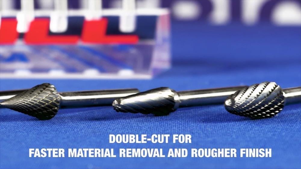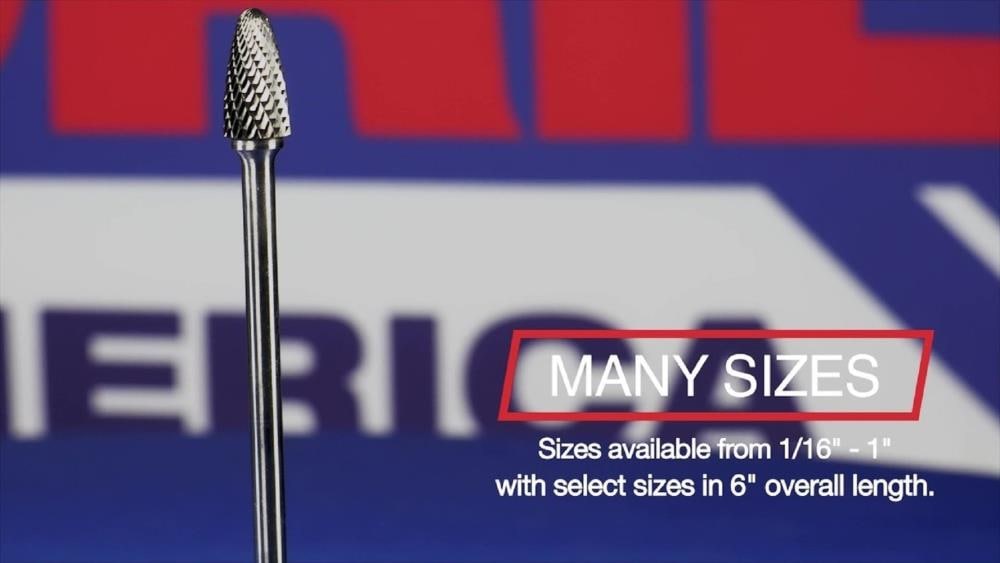 Drill America Solid Carbide Burs are designed for cleaning out material in a wide-range of products including wood, plastics, stainless steel and other metals. Solid Carbide Burs have a long tool life and faster cutting speeds than other substrates. They are double-cut style and have rows of cutting teeth in 2 intersecting directions for fast material removal and a rougher finish. Drill America Solid Carbide Burs come in many shapes and sizes. Shapes include ball, cone, flame, tree and cylindrical. Sizes range from 1/16 in. to 1 in. Dia with round shanks. 6 in. L burs available in select shapes and sizes.