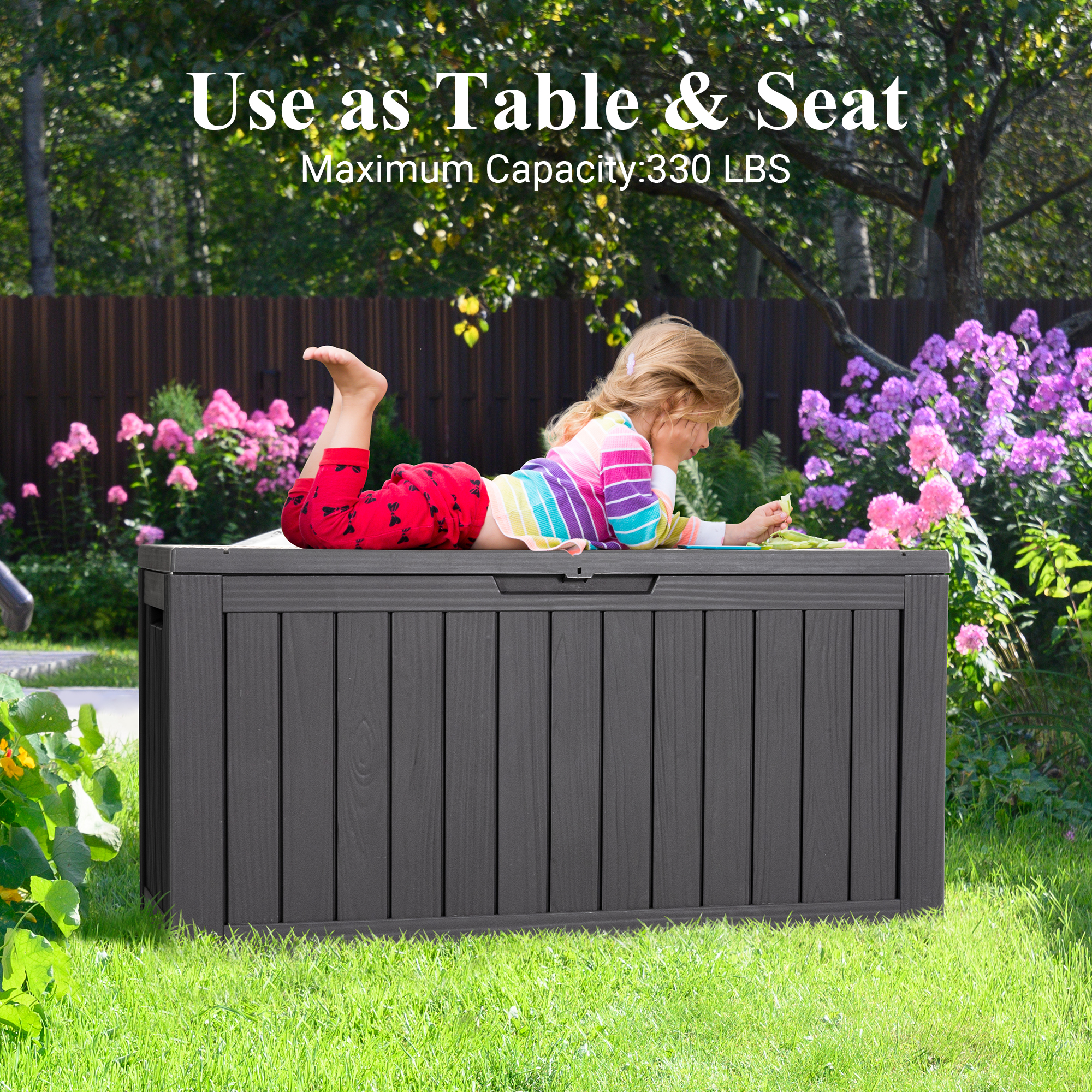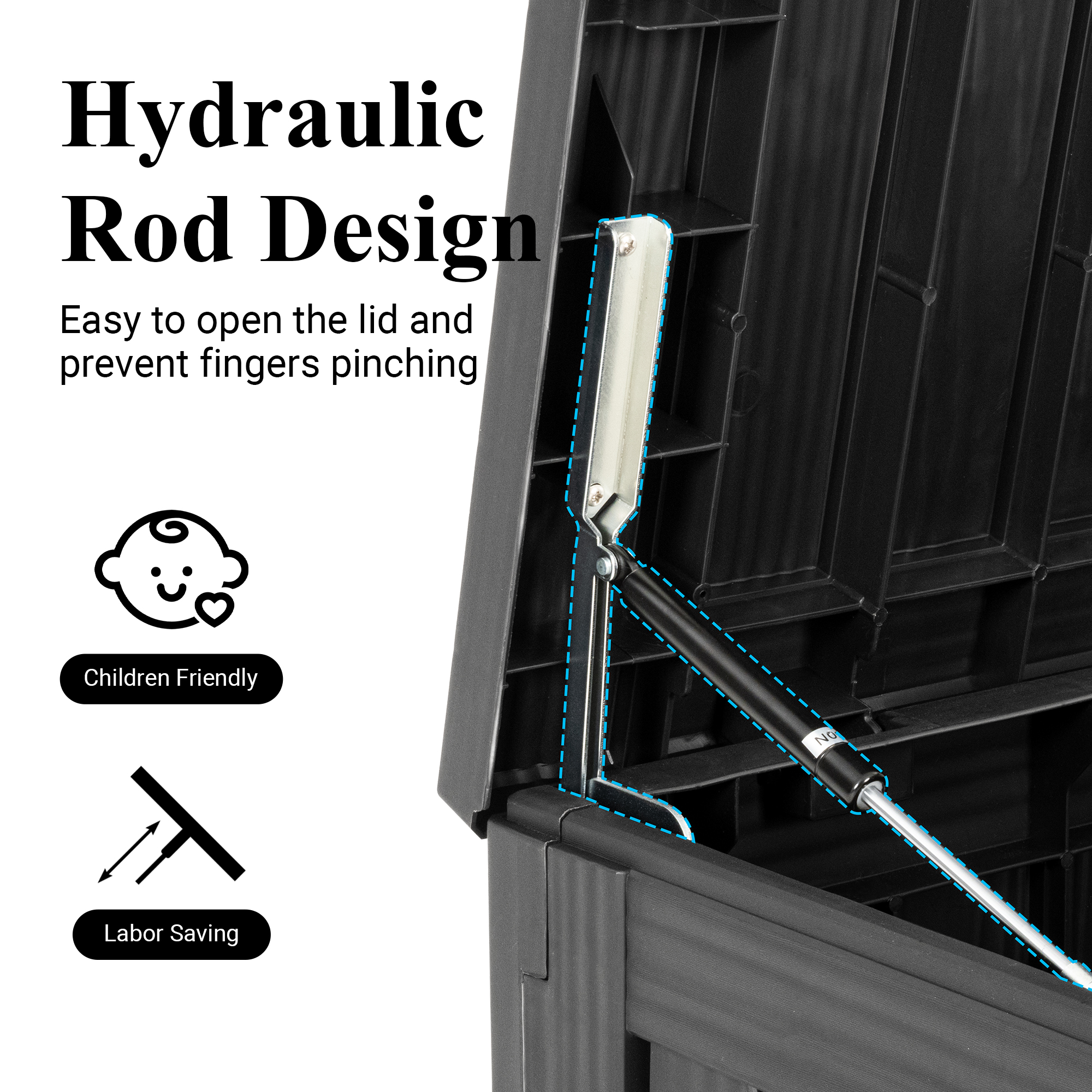 【Spacious Capacity】With a generous 81-gallon capacity, this deck box provides enough room to store for various outdoor supplies, such as toys, tools, and pool supplies, etc. 【Hydraulic Rod Design】The design of the hydraulic rod not only allows effortless opening and closing of the lid, but also prevents fingers pinching, making it safe for children to use. 【Use as Table & Seat】This deck box is multi-functional, serving as cozy lounge seating, a chic patio table, and can support up to 330lbs of weight. 【Effortless Assembly】 No screws or tools are required, you just follow the included instructions to assemble the panels in the correct order, just like building blocks.