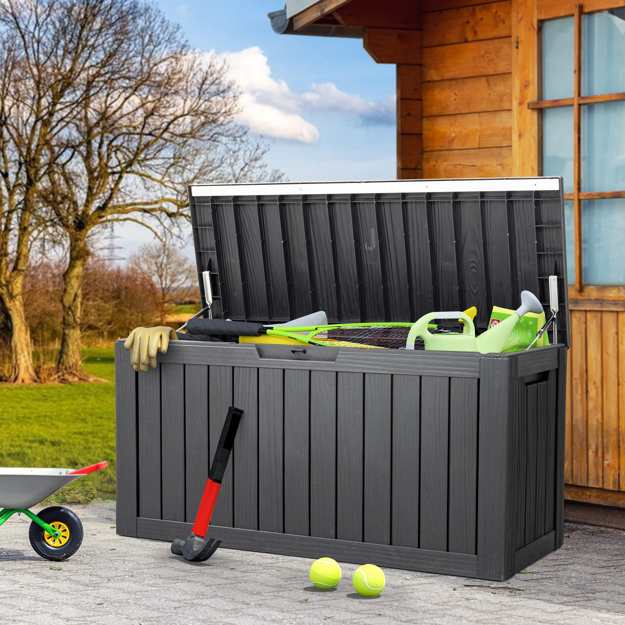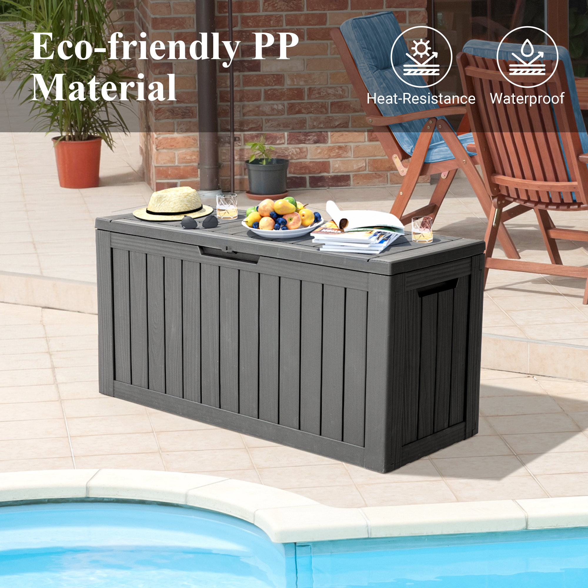 The outdoor deck box is an excellent choice for your outdoor storage, not only meeting your various storage needs, but also adding modern and stylish decorative elements to your outdoor space. The storage box is made of eco-friendly PP material, which has excellent heat resistance and water resistance, and is easy to clean. At the same time, the storage box with an elegant wood-look design will perfectly fit into your garden.