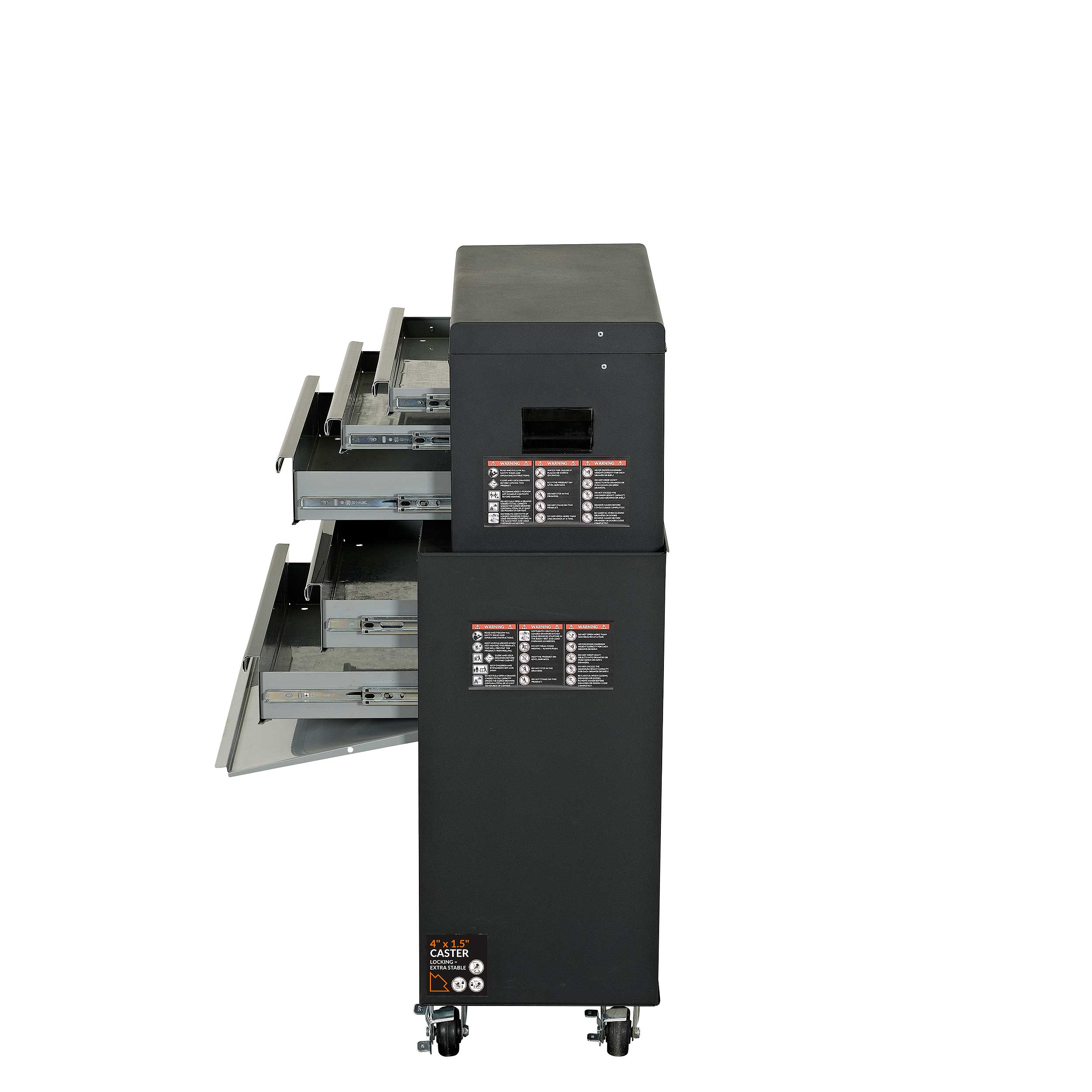 Keep your work area organized and free of clutter by using the rugged SHOPMAX 27 in. 5 Drawer and 1 Panel Door Tool Chest and Rolling Cabinet Combo. This 2-piece storage solution is designed for heavy usage: Both chest and cabinet feature all-welded steel construction. The ball-bearing drawer slides will keep your tools in place when opening and closing. This tool cabinet supports up to 600 lb. of your tools and equipment, but is maneuvered easily on four heavy-duty casters. An industrial strength powder-coat finish helps protect the tool chest from wear and tear.