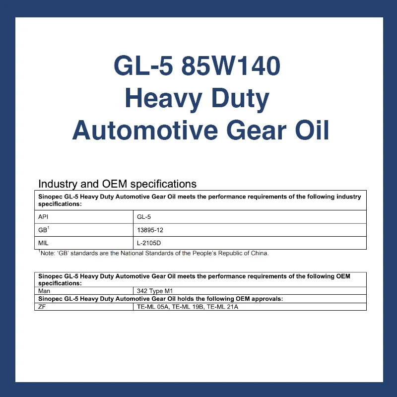 Sinopec GL-5 85W140 Heavy Duty Automotive Gear Oil is formulated with high-quality base oils and an advanced multifunctional additive system to meet the requirements of API GL-5. Designed for the lubrication of hypoid gear sets in passenger vehicles and commercial vehicles, where they offer excellent extreme pressure (EP) and anti-wear properties.
