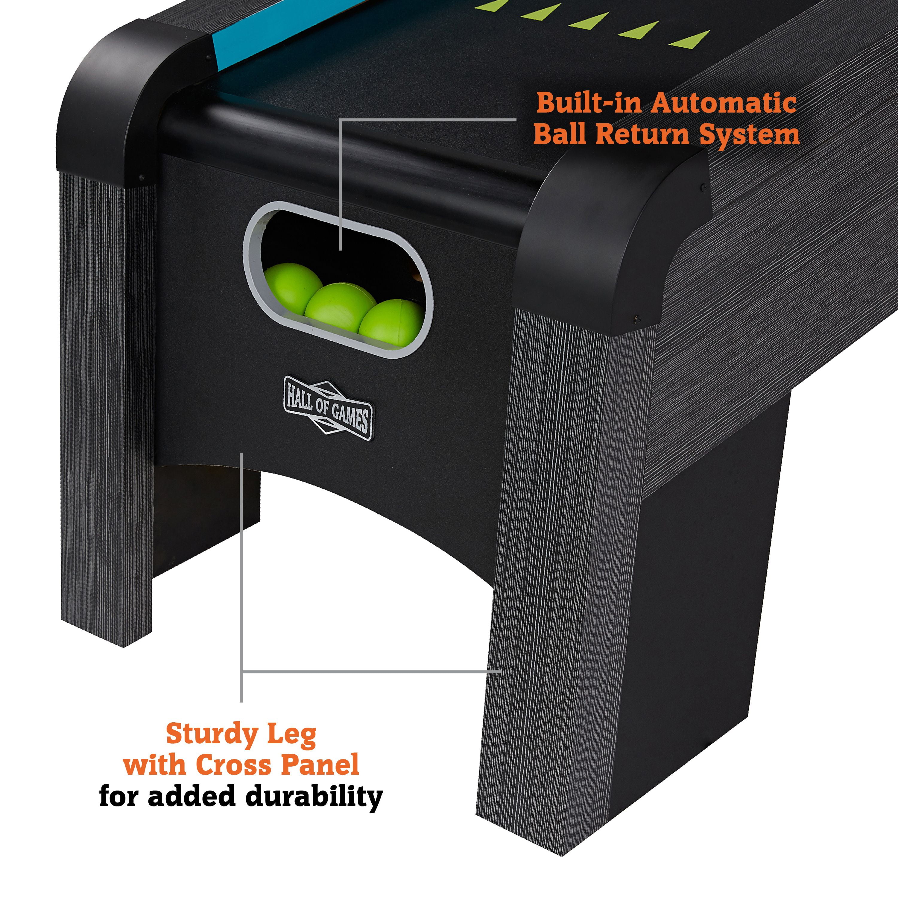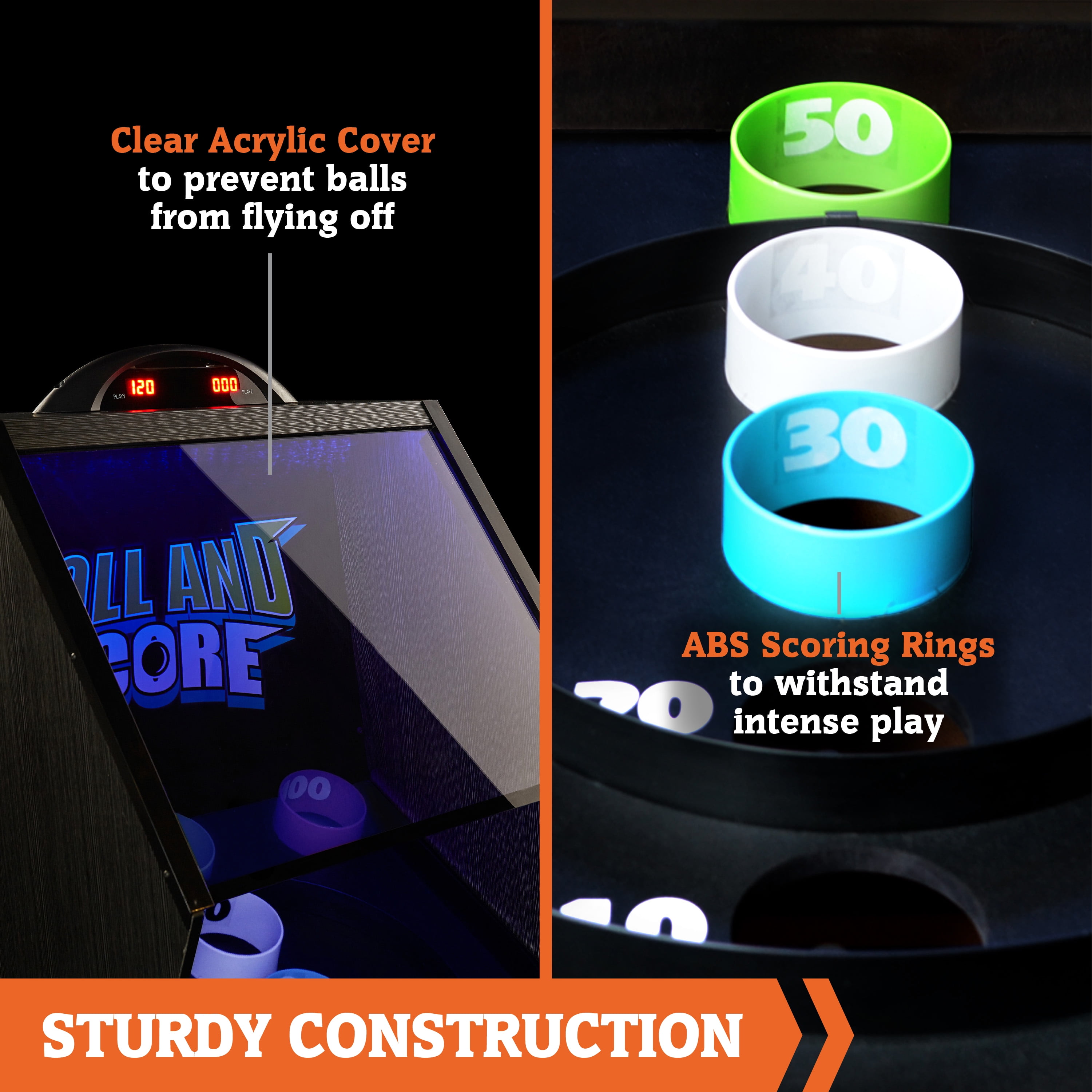 Hall of Games 9’ Roll and Score Classic Arcade Game, Electronic Scoring and Ball Return System, Perfect for Family Game Rooms CLASSIC FAMILY GAME: Keep your family amused for hours. It has an electronic scorer, built-in LED lights, and fun arcade sounds. The automatic ball return system ensures non-stop rolling and scoring excitement, making it the perfect addition to your home. PLAYING SURFACE & BALL ROLL: The game table has a 12mm thick one-piece playing surface made of engineered wood for a smooth ball roll. At 9’ long, 24.5” wide, and about 5’ tall, it brings fun and competition to your family game room. CRAFTMANSHIP: The table consists of wood grain laminate and engineered wood. The game has a sleek black design with blue trim to elevate your game room. After each roll, the automatic ball return sends the balls to the goal box for another throw. ARCADE-STYLE GAME: The electronic scorer tracks points as balls enter the ABS scoring rings. A plug-in adapter powers it, and a transparent acrylic cover keeps balls in play. Enjoy single or two-player modes with or without sound for immersive gaming fun. STURDY LEG DESIGN & ROOM SIZE: Durable cross-panel supports reinforce the engineered wood table legs during intense gameplay. To ensure ample space for free movement around the game table, we recommend a room size of 12’5” x 5’5”. FUN FAMILY GAME ROOM TABLE: The game includes four 63mm plastic game balls for Roll and Score games and a 90-day warranty. Whether playing solo or competing with friends, the electronic scorer keeps track of the highest score, adding to the excitement.