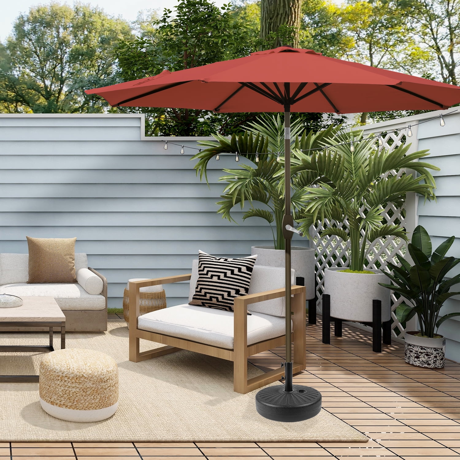 Set Includes: One (1) Half Umbrella and One (1) Round Plastic Base Polyester Canopy Crank Lift Mechanism Solution for small spaces like balconies, small terraces, patios, decks, or awnings Weather and UV Resistant