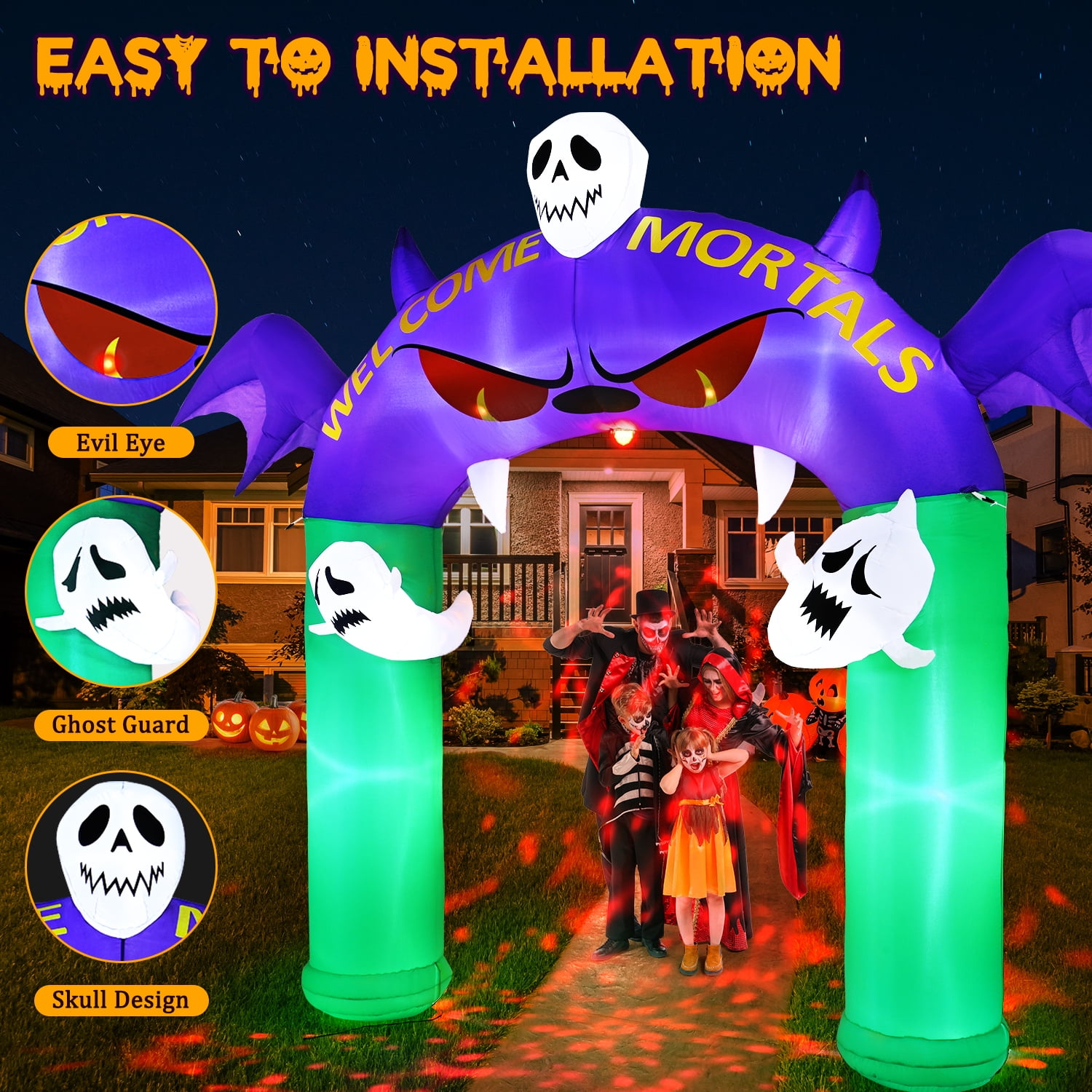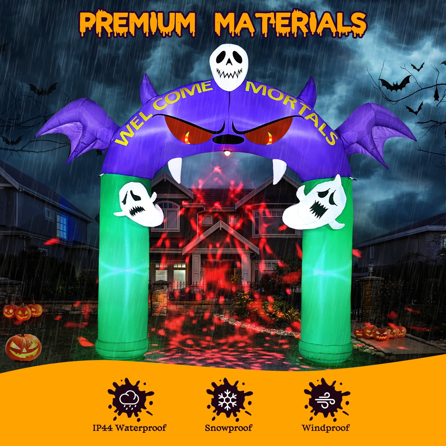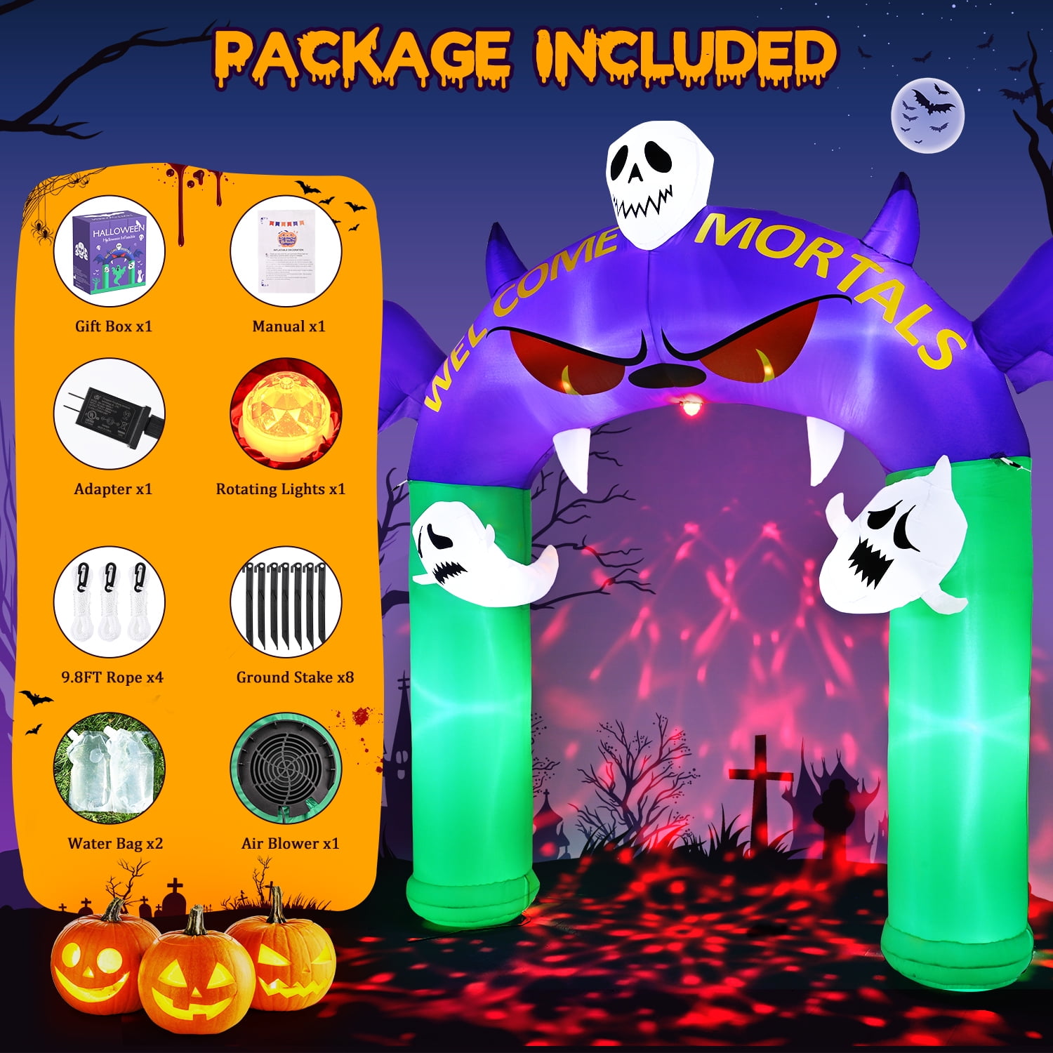 【Weather-Resistant and Built-In LED】; Made of thickened 210T Polyester, it withstands wind and light rain. The material is tear-resistant and fade-resistant, ensuring lasting durability. 【Easy Use & Setup】 This Halloween decorations outdoor fully inflates in under a minute with just two zipper pulls and a power outlet. After the season, it deflates easily for compact storage, making it ready for use again next year. 【Spacious Archway for Easy Passage】The Demon Archway halloween decorations is designed with ample space for a comfortable and convenient passage. Measuring 100 inches in width and 30 inches in thickness, this halloween inflatable arch is wide enough for a 6 ft tall adult to walk through with ease. It ensures a smooth and accessible entrance, allowing your guests to experience the thrill of passing under the spooky arch. 【Stable Use】Our skeleton and pumpkin Halloween inflatables have a wide base for extra stability. With 7 ground stakes, 4 ten-foot ropes, and 2 water bags. These accessories can effectively prevent the inflatable pumpkin from being blown away when placed outdoors, making the product more stable.