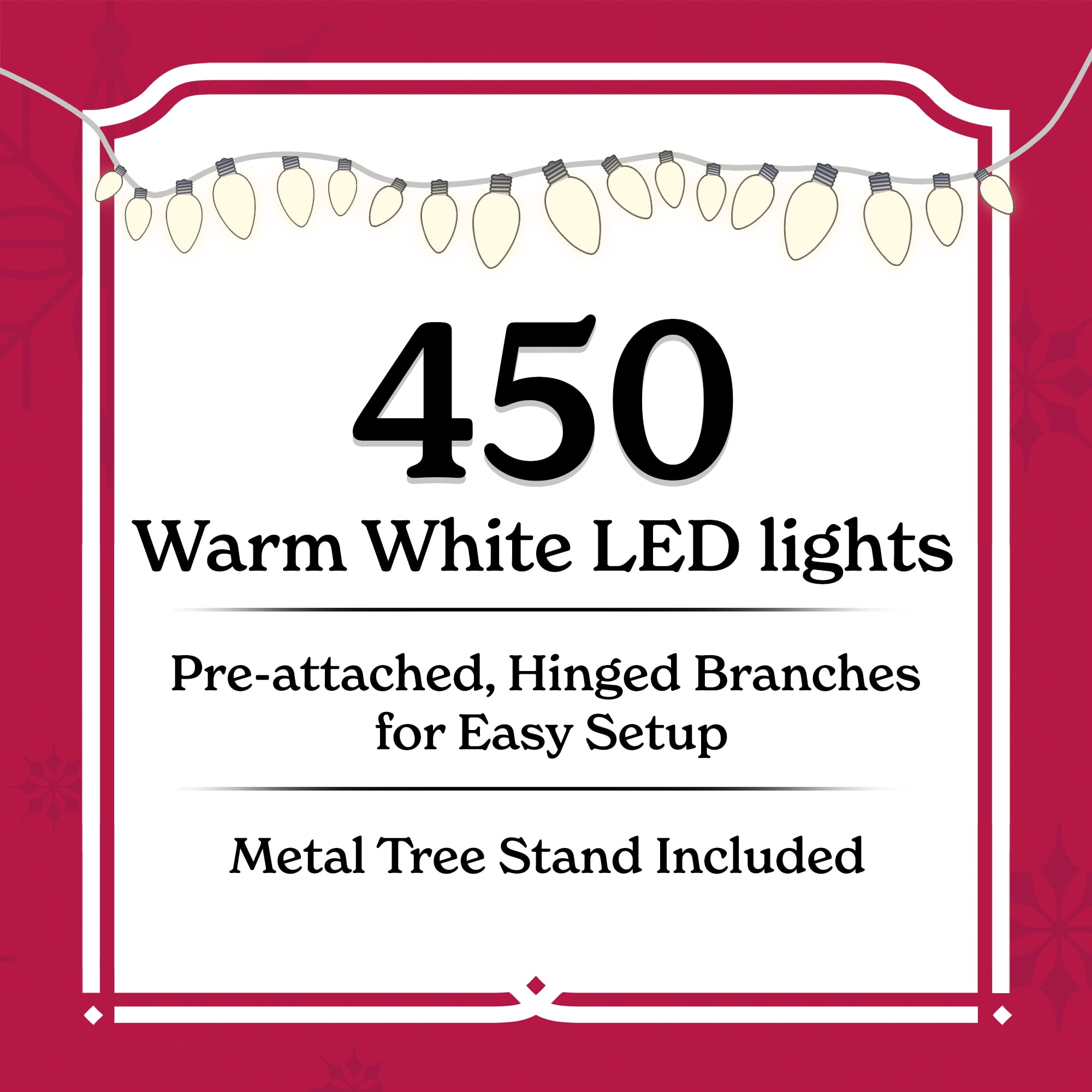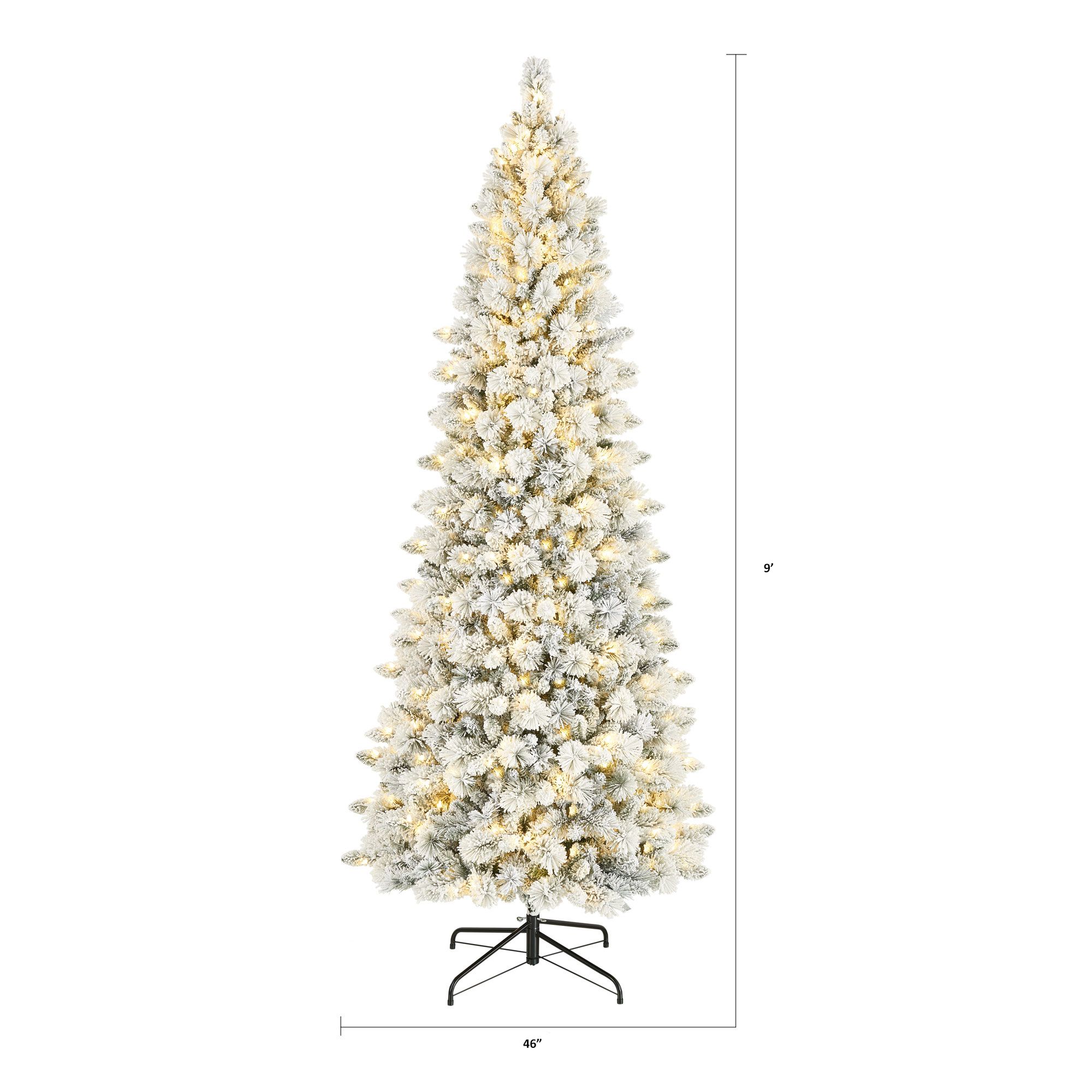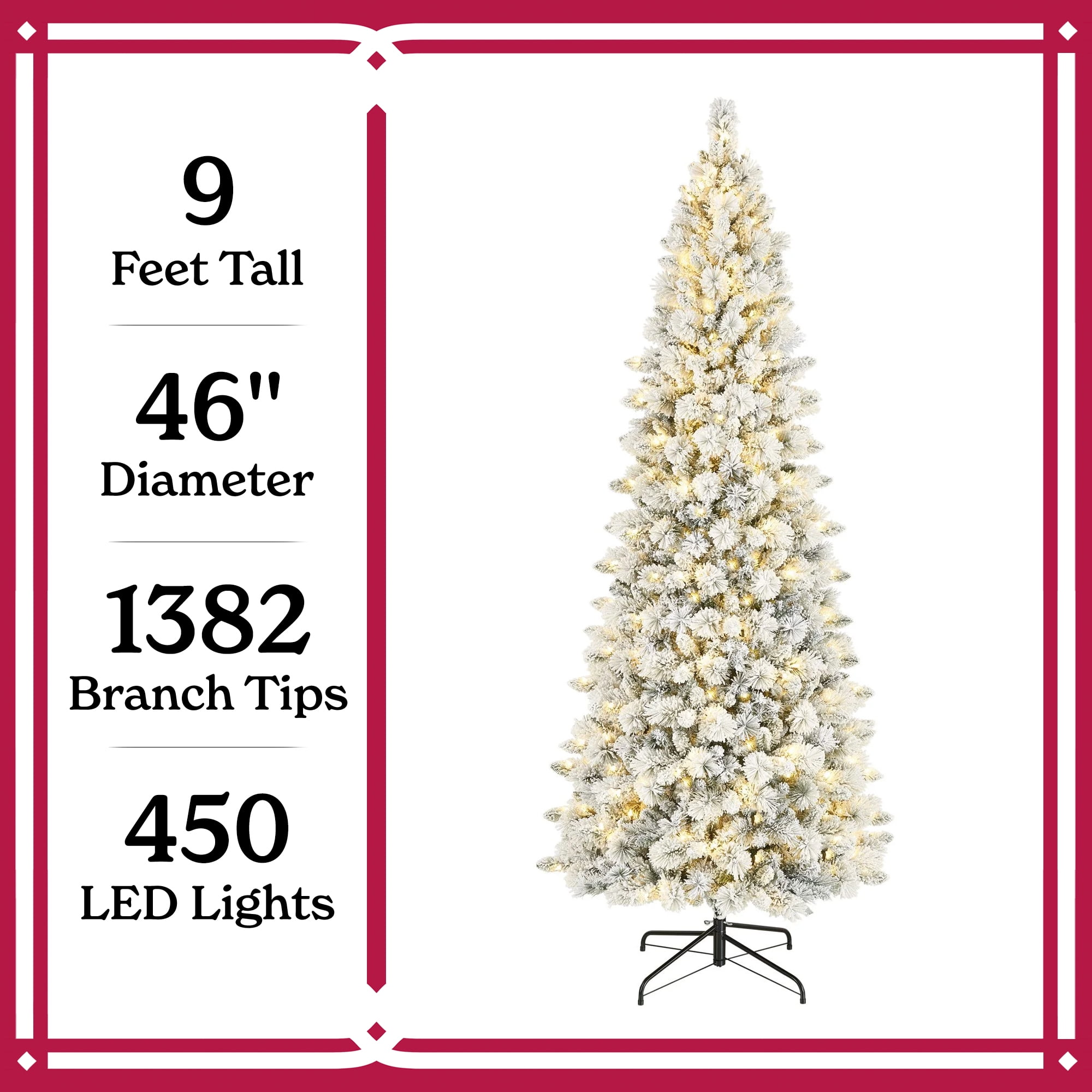 Holiday Time 9 ft Pre-Lit Flocked Tahoe Spruce Artificial Christmas Tree, Warm White LED Lights 1382 white-flocked branch tips 450 pre-strung warm white LED lights Comes with a metal tree stand Natural looking needles for an authentic look 9′ height makes it perfect for larger living rooms, dens, and a variety of other placements Pre-attached hinged branches make set up easy Color: Green with white flocking Assembled product weighs 34.5 lbs. Assembled product dimensions: 46″ D x 9′ H Extra sturdy top branch provides a reliable support base for your favorite tree topper Easily assembled with the included instructions For indoor use only Package dimensions: 52X15X15″ Package weight: 40.7 lbs
