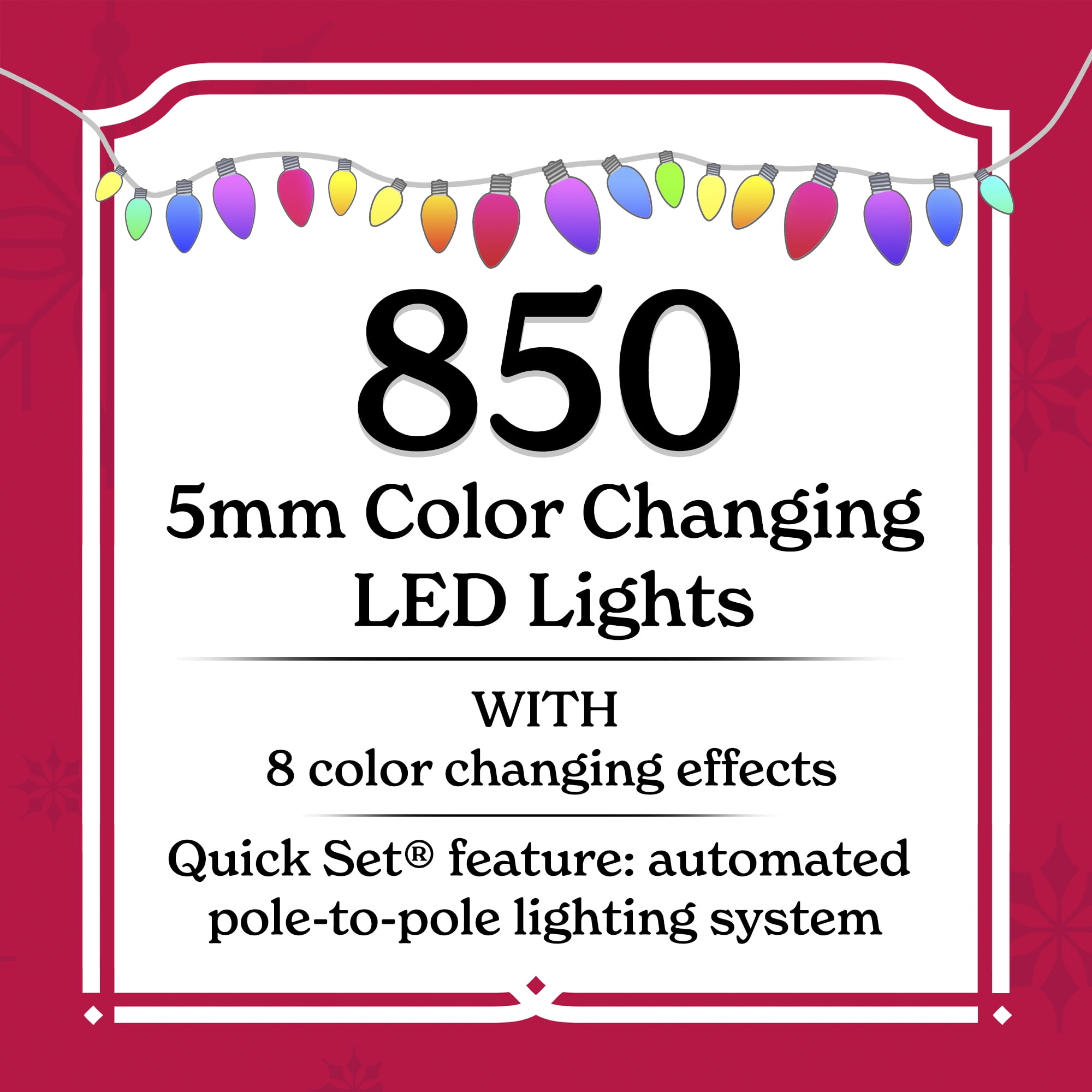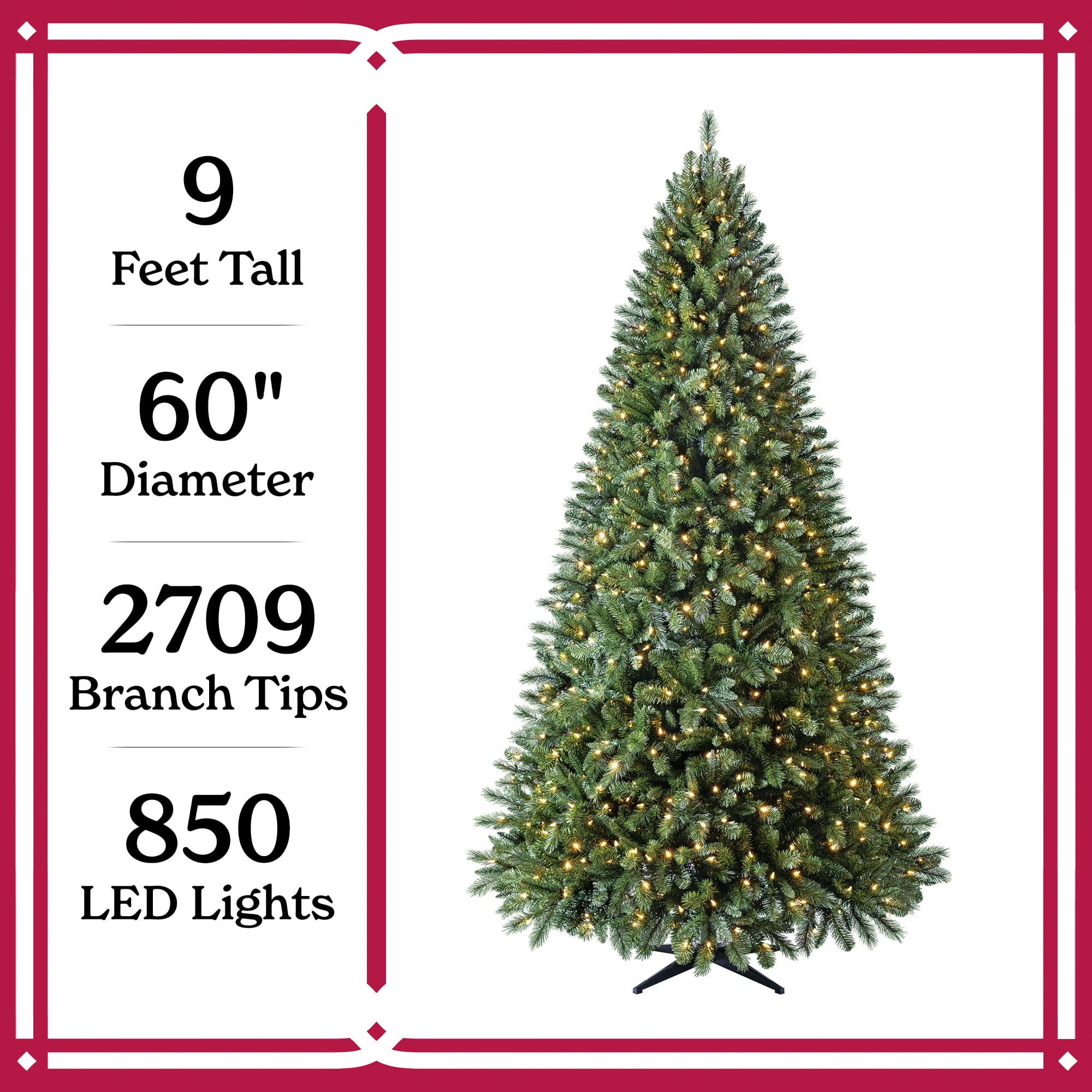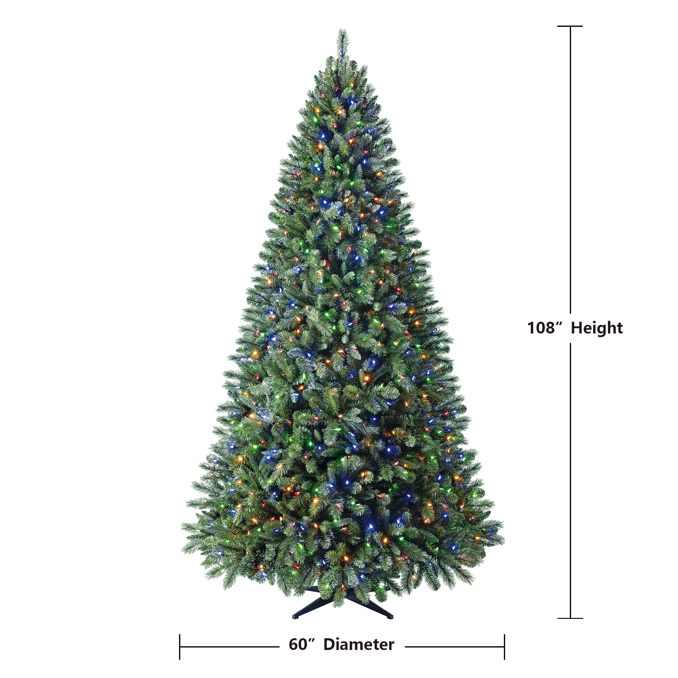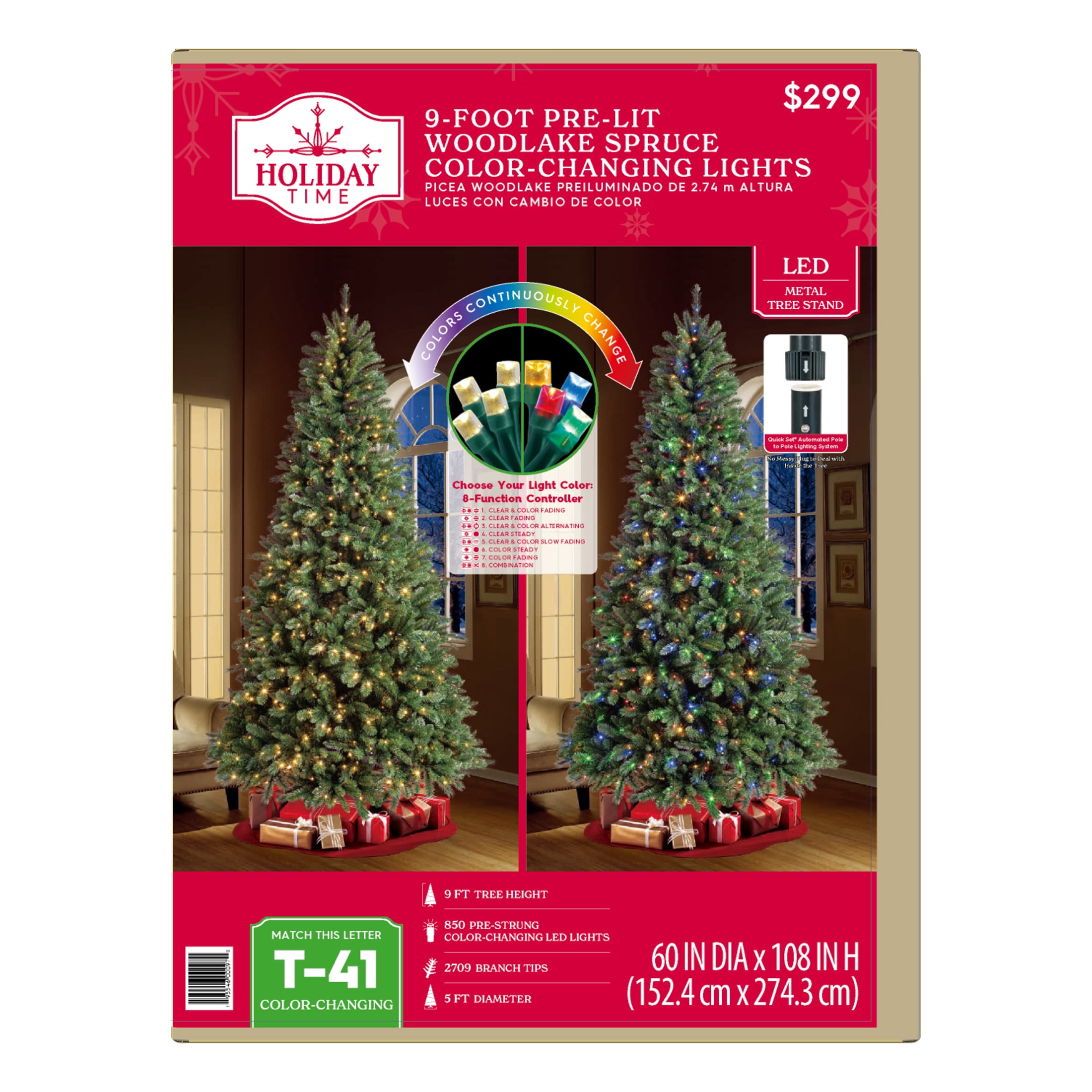 Holiday Time 9 ft Pre-Lit Woodlake Spruce Artificial Christmas Tree with 850 Color-Changing LED Lights and Stand 2,709 branch tips 850 pre-strung color-changing LED lights Quick Set feature: automated pole-to-pole lighting system 8-function light controller Metal tree stand included Easy setup – slide the tree sections together for quick display Pre-attached hinged branches Extra sturdy top branch for your tree topper For indoor use only Flame-retardant Color: Green 5 ft diameter Product Dimensions: 60″ DIA x 108″ H Model #: TG90M5489D02