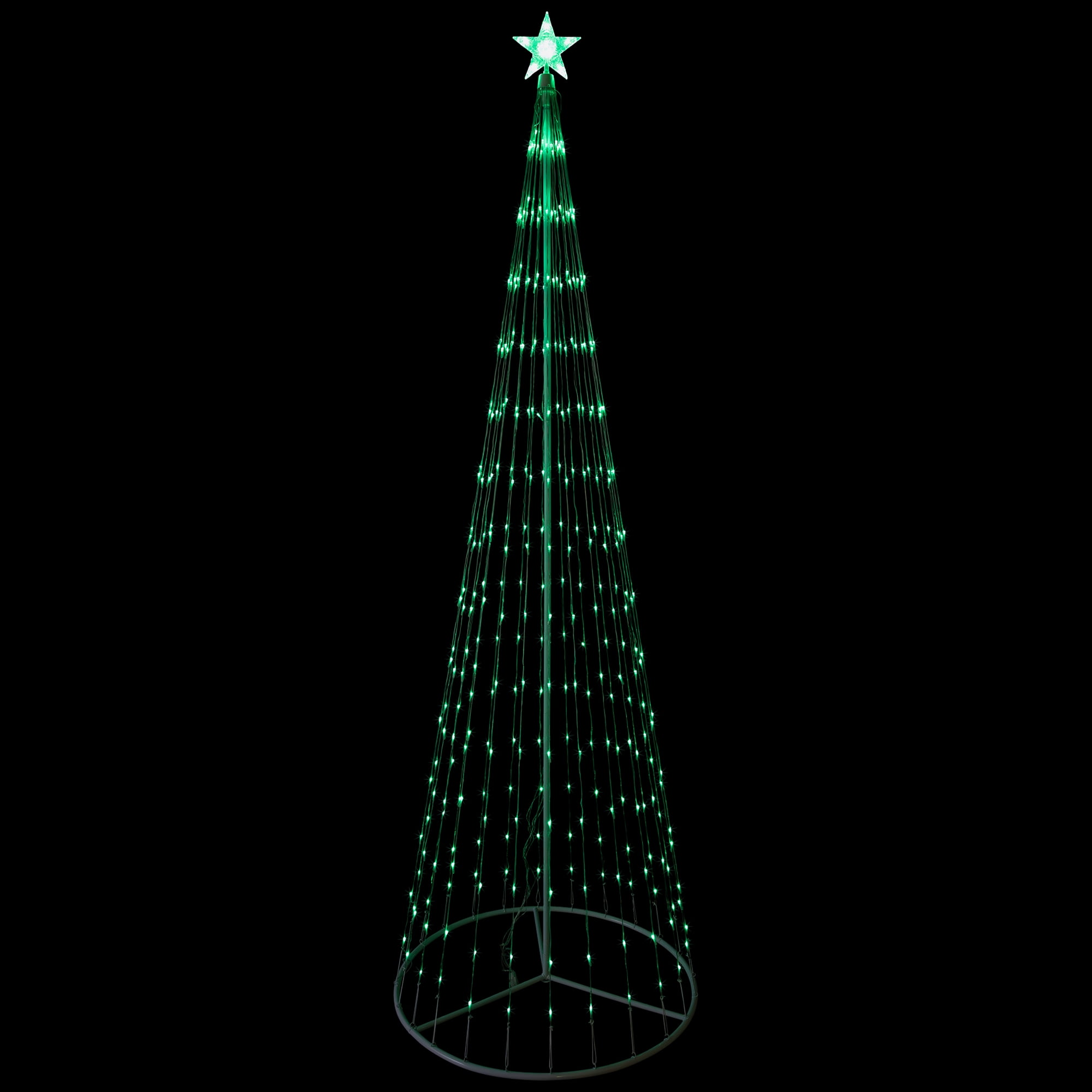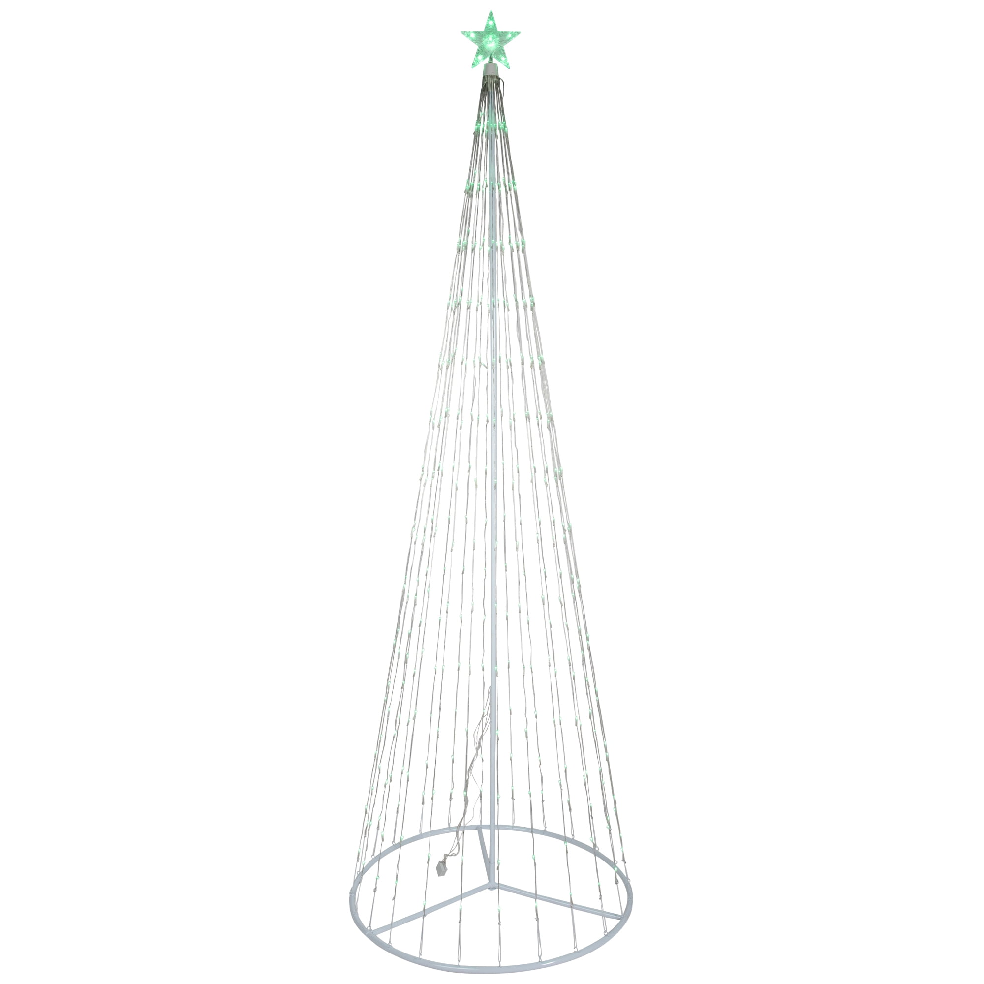 Create a magical wonderland with this LED lighted show cone Christmas tree! It adds glitz to your yard or patio. This grand decor accessory helps you prep up for an extraordinary festive bash. Product Features: Pre-lit with 344 green mini LED lights Bulb size: wide-angle (concave bulb) Bulb color: green 4-piece easy assembly (including stand) Crystalline glowing star tree topper 9-foot black lead cord Wire gauge: 22 Cycles 9 different dazzling light show effects ranging from slow fade, random twinkle, fast spiral just to name a few Additional product features: LED lights use 90% less energy Super bright bulbs Bulbs last up to 100,000 hours Durable non-glass replaceable bulbs Cool to the touch White metal frame and stand UL listed for indoor or outdoor use 120 volts, 60 hertz, .13 amps, 21.61 watts Transformer and ground stakes included Tree needs to be plugged into its own outlet as it will not connect to other lighted items Dimensions: 9′ high x 35″ base diameter (at widest point) Material(s): metal/wire/plastic