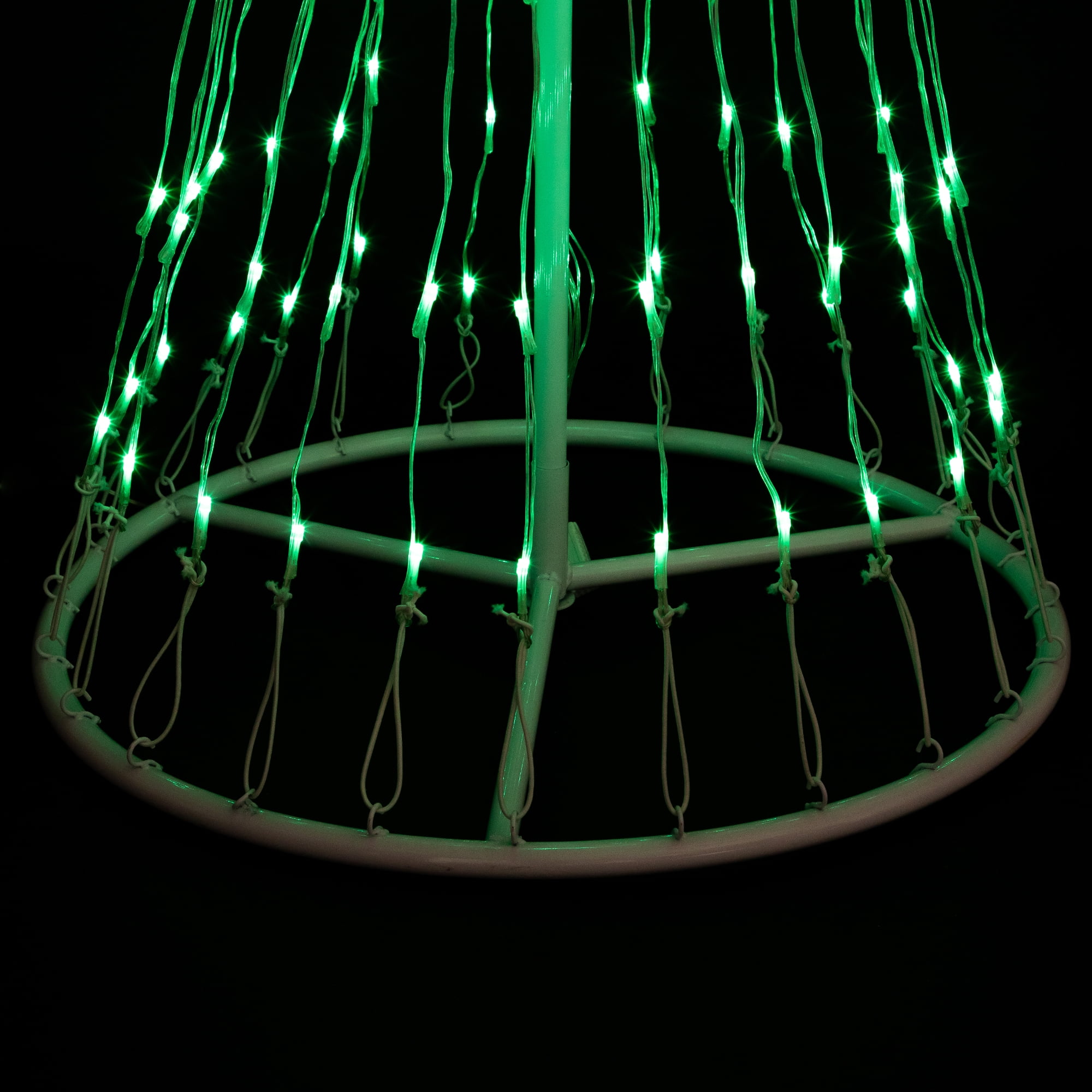 Green led lighted Christmas tree show cone decor Cycles through 9 dazzling lighting effects; 4 pieces easy assembly 9 foot black lead cord; white metal frame and stand