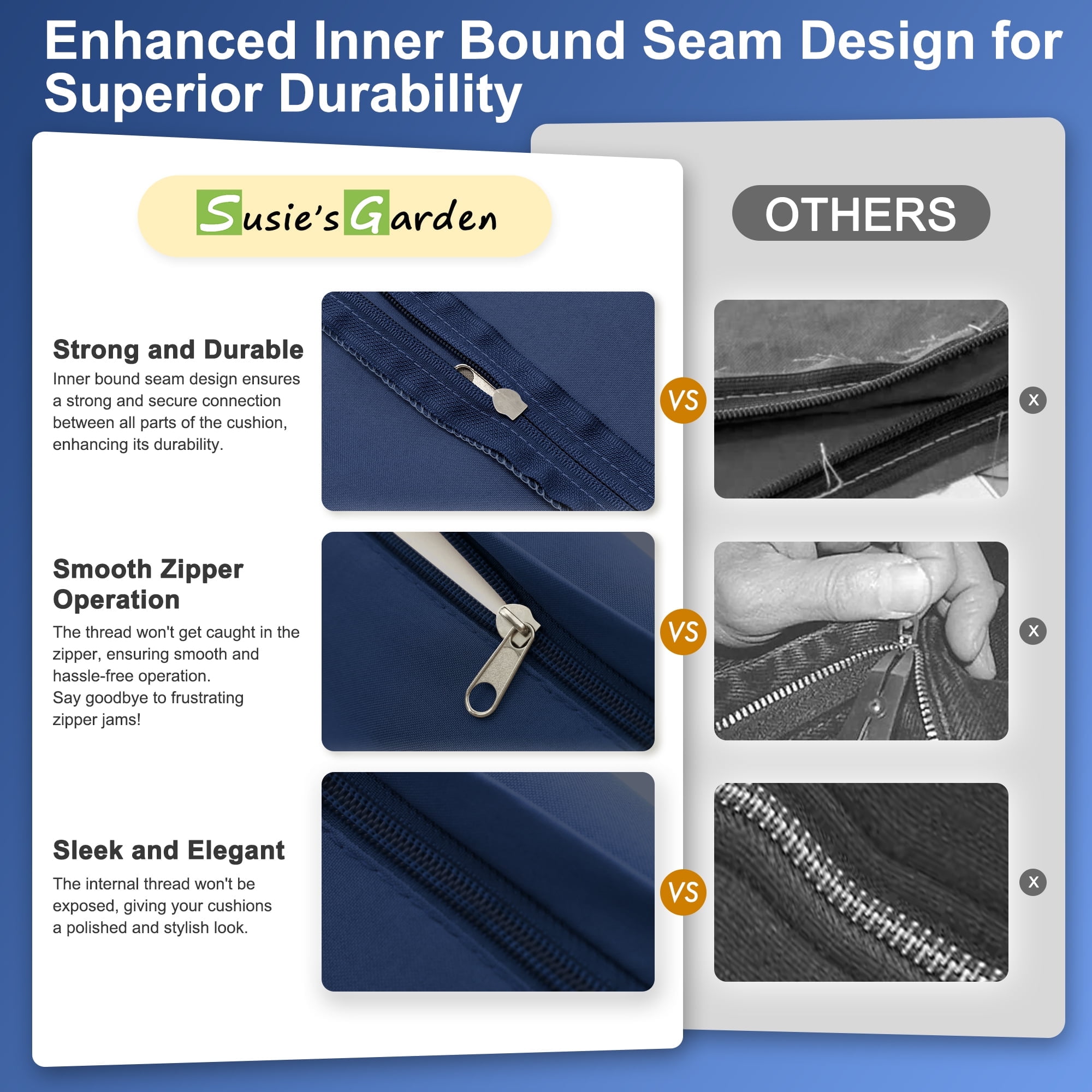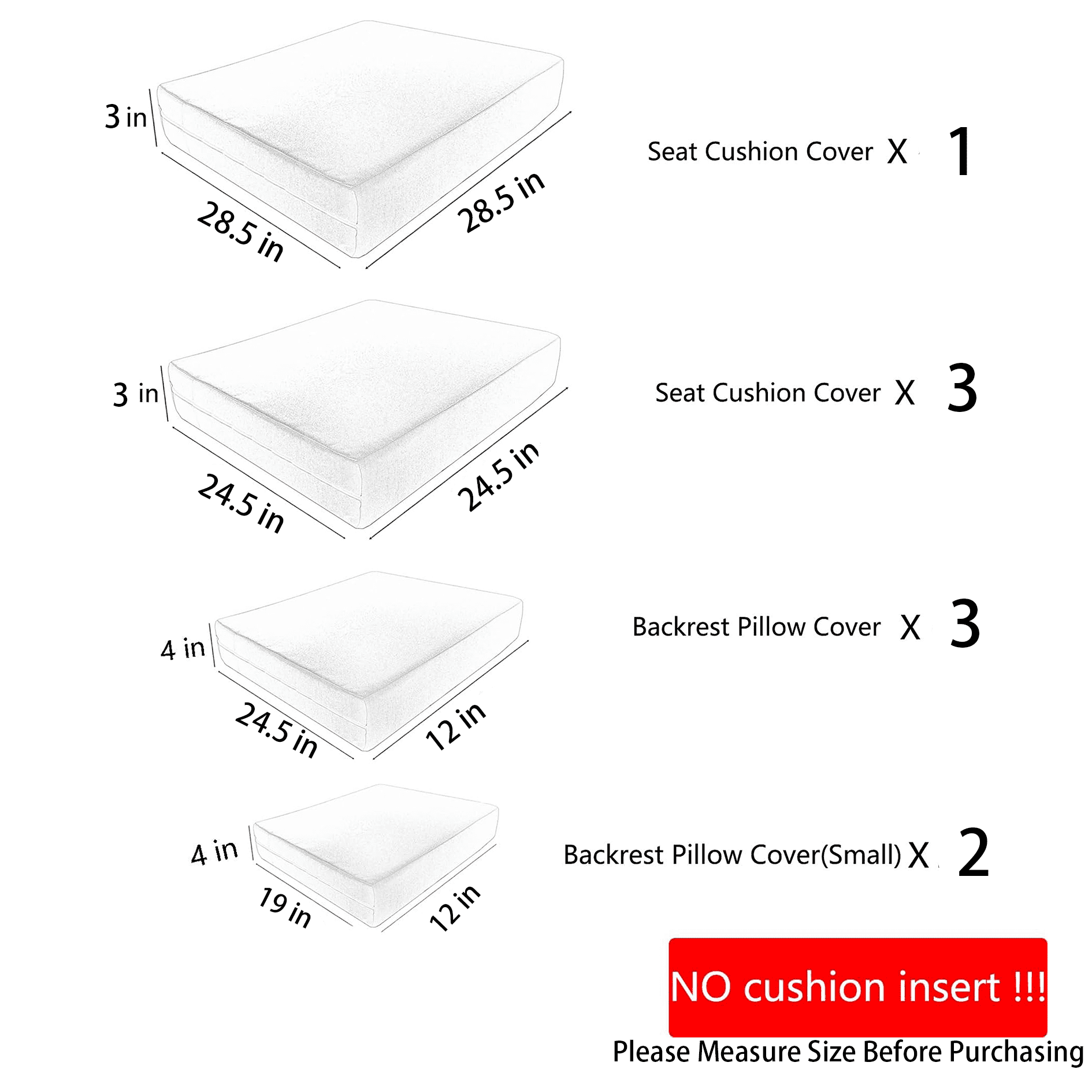 You can make various combinations of outdoor furniture according to your needs. The non-printed minimalist fabric cover can better match your furniture style. Outdoor cushion covers are made of thicker high quality yarn dyed polyester fabric woven for durability, comfort and softness. Durable in the sun, fade resistant (every yarn has been treated with UV resistance), soft and comfortable. Water resistant, not completely 100% waterproof, the built-in TPU compartment prevents water from seeping in. We designed stacked stitching to improve the fastness of the zipper and equipped with heavy duty aluminum zippers, the zipper has been opened and closed thousands of times to ensure smoothness in use and easier to install. If you encounter any problems, please feel free to ask us, we will provide you with service within 24 hours. You can choose the right size patio cushion replacement cover according to your cushion size”. Set includes: 3Pack-Seat cushion covers 3Pack-Back cushion covers 2Pack-Armrest cushion covers 1Pack-Ottoman cushion covers Attention: Covers Only Dimensions: Seat cushion covers: 24.5L*24.5W*3H Inch Back cushion coversr: 24.5L*12W*4H Inch Armrest cushion covers:19L*12W*4H Inch Ottoman cushion covers:28.5L*28.5W*3H Inch