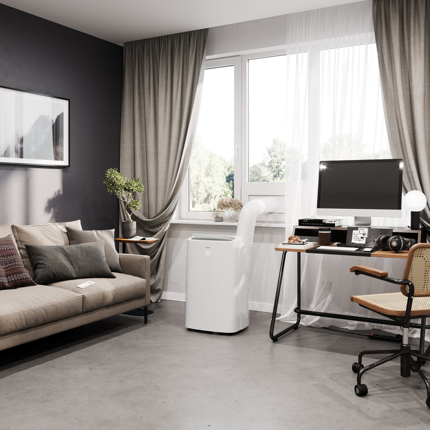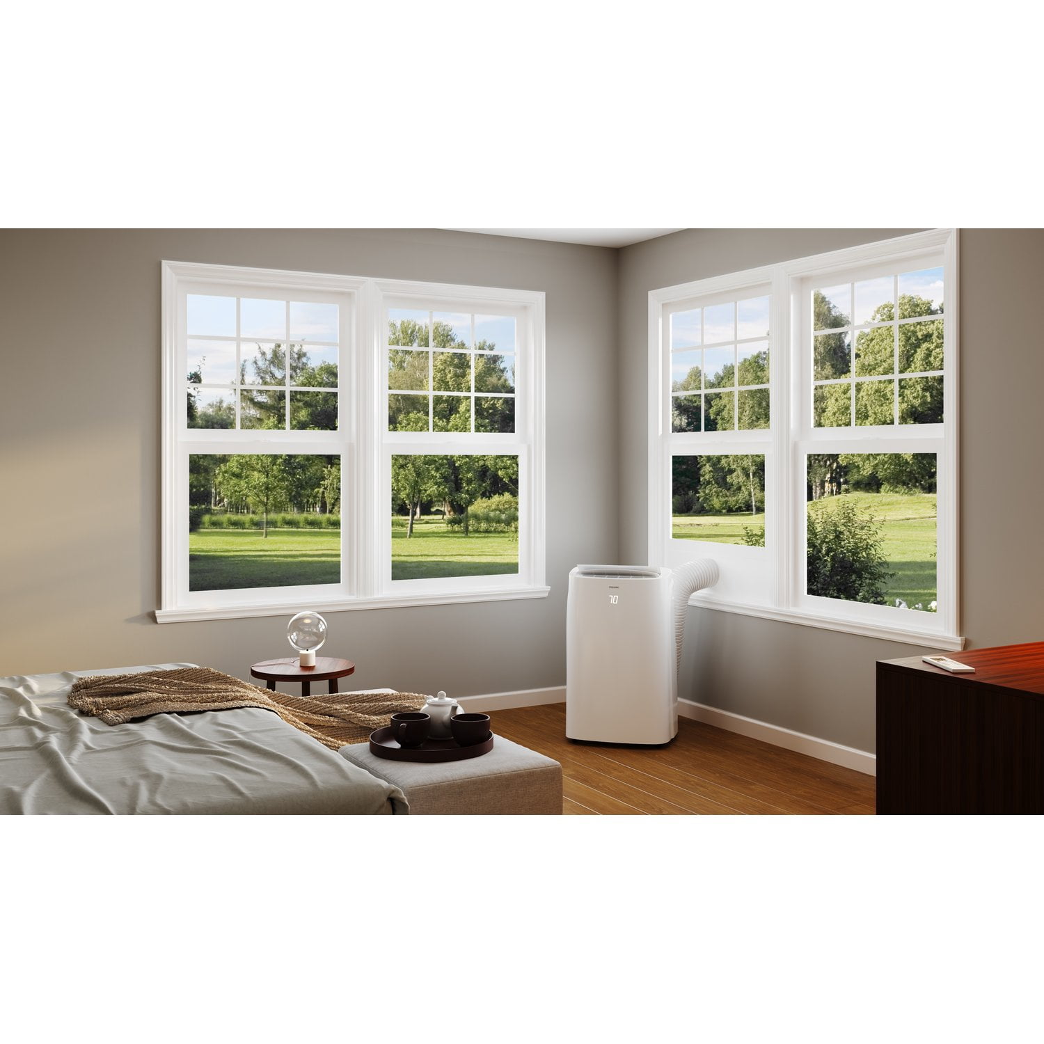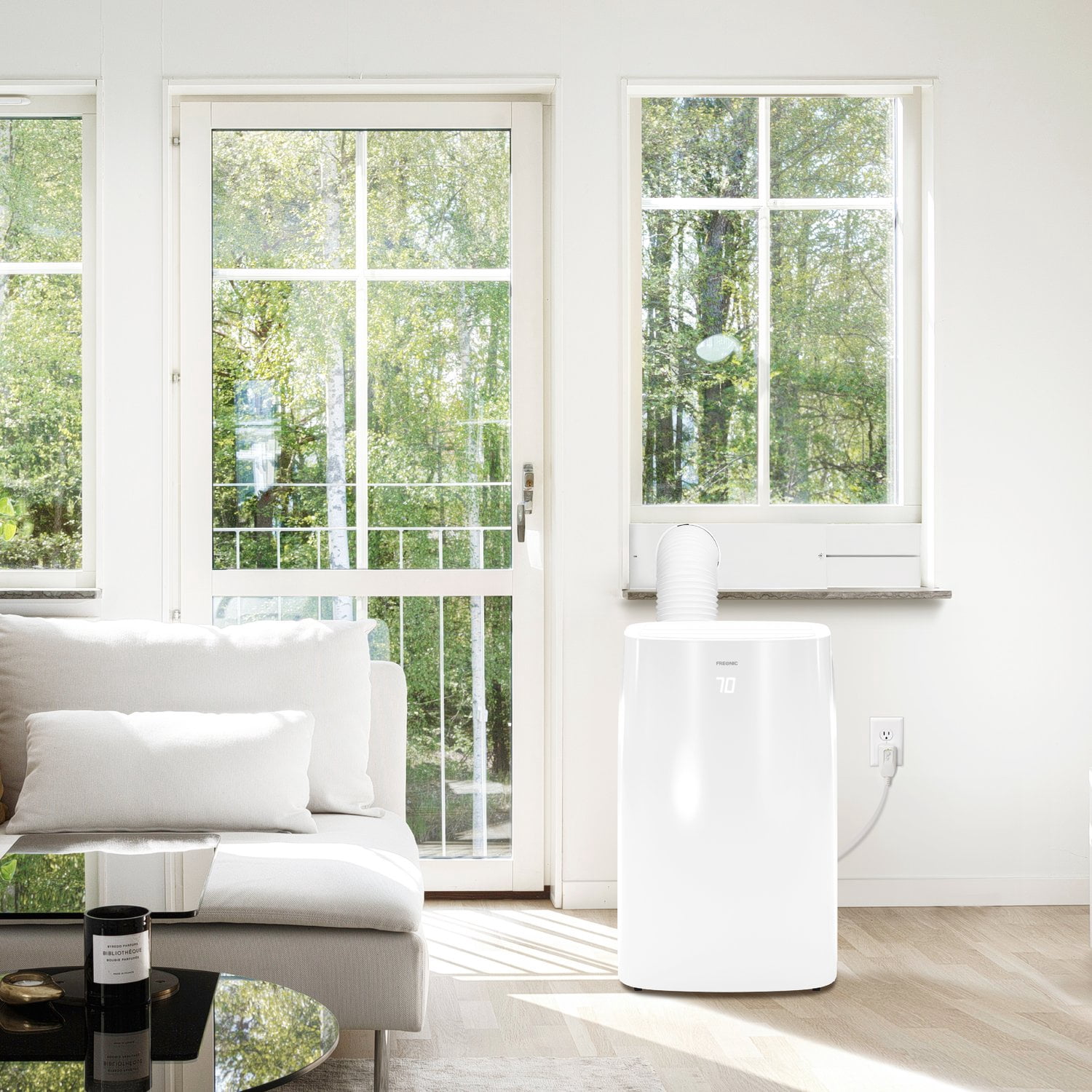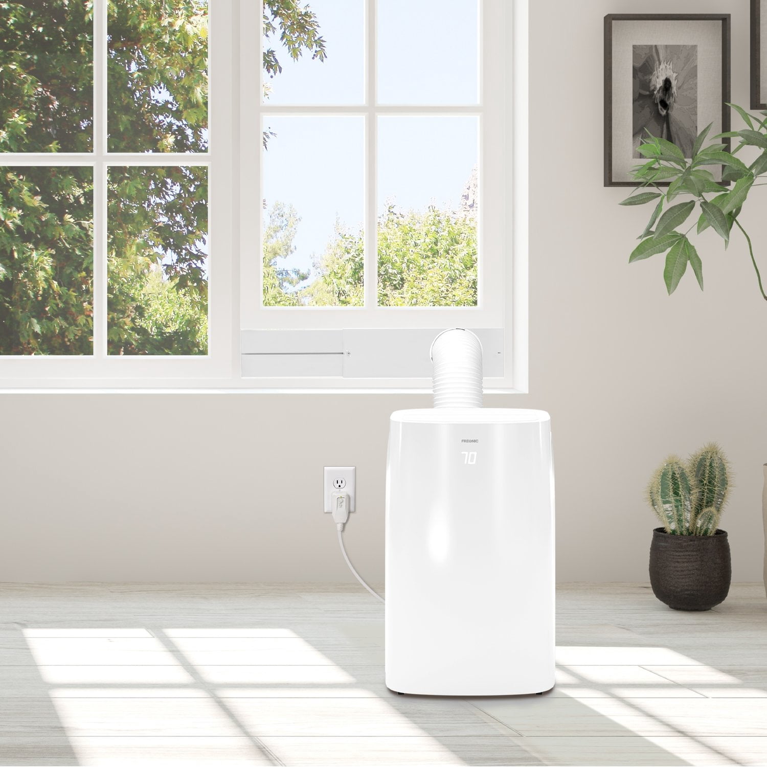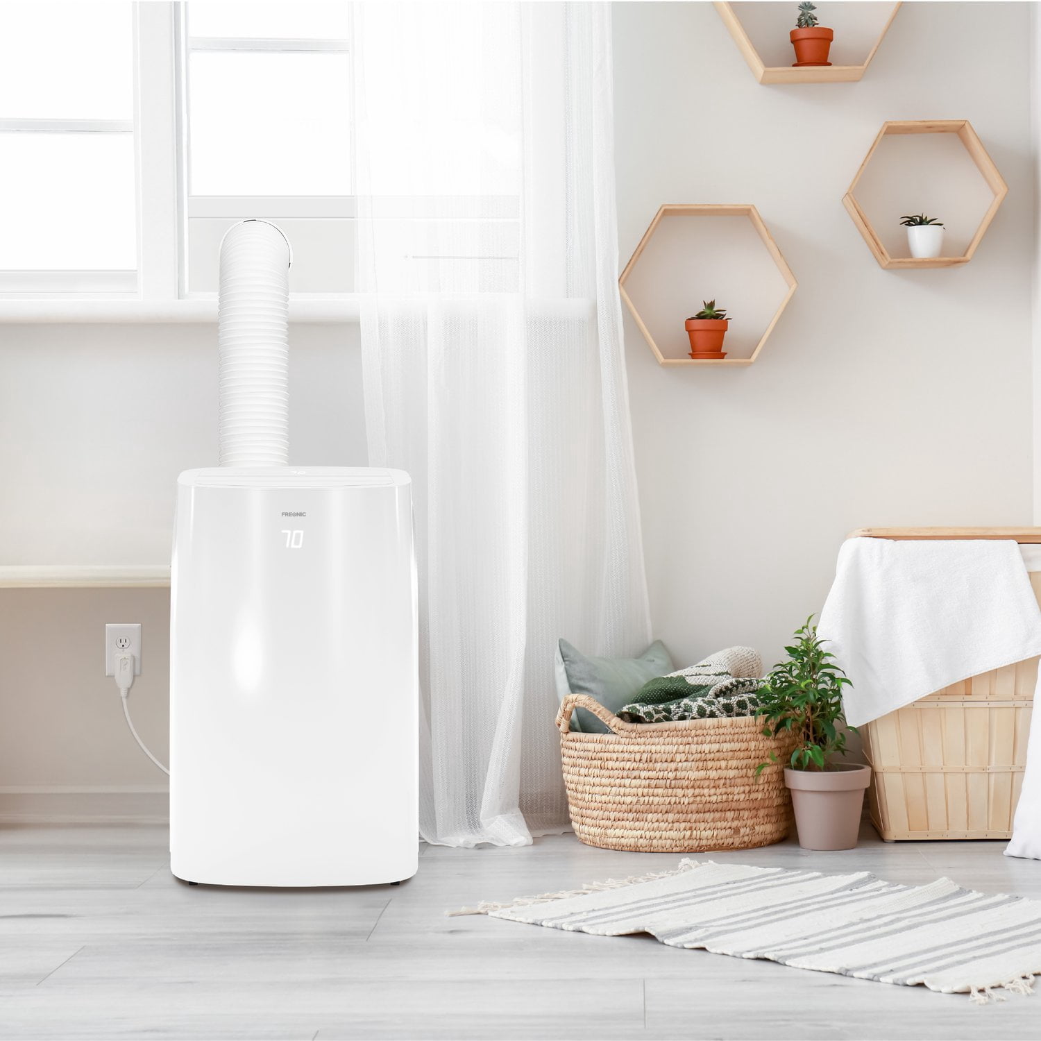 Air Conditioner Portable for Room: This 6350 BTU Portable Air Conditioner (9,000 BTU previous ASHRAE) packs a powerful cooling punch for small to medium rooms up to 300 square feet 3 Functions, 1 Portable AC: With 3 operating modes, cool, fan, and dry, this portable air conditioning unit can handle any indoor needs that you have when it’s hot and humid outdoors Modern Design: Bright white LEDs display the temperature through the front plastic; Use either the on-board controls or the included remote control to adjust temperature, fan speeds, and set the sleep timer Clean and Simple Air Conditioner Portable Unit: The included washable filter catches and holds pet hair, dust, and other airborne particles to keep them from clogging the internal components AC Unit Installation: The included installation kit contains all required hardware, including the exhaust hose, window bracket, and connectors; Bracket will fit vertical or horizontal windows from 20-46″ wide with a minimum opening of 5.9″