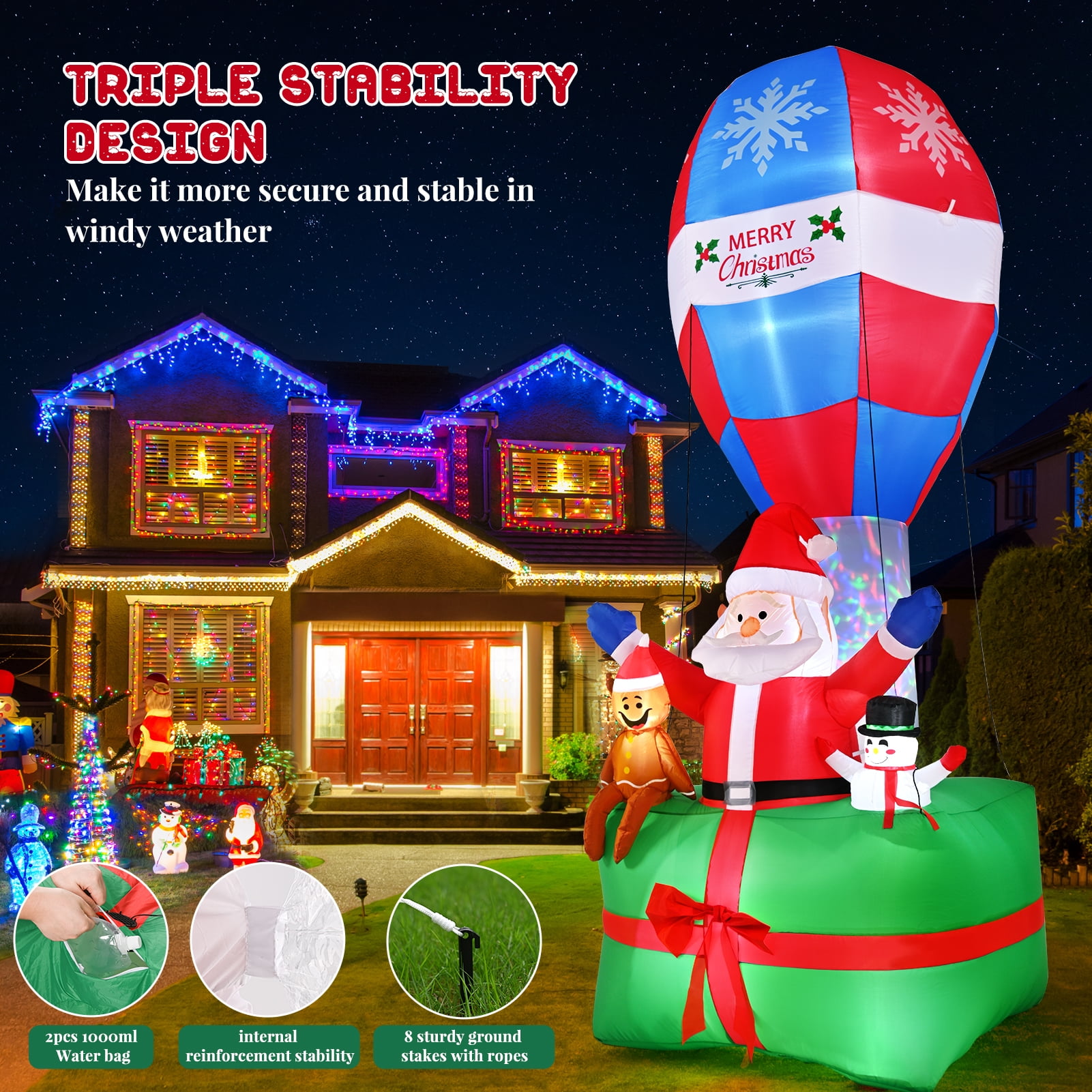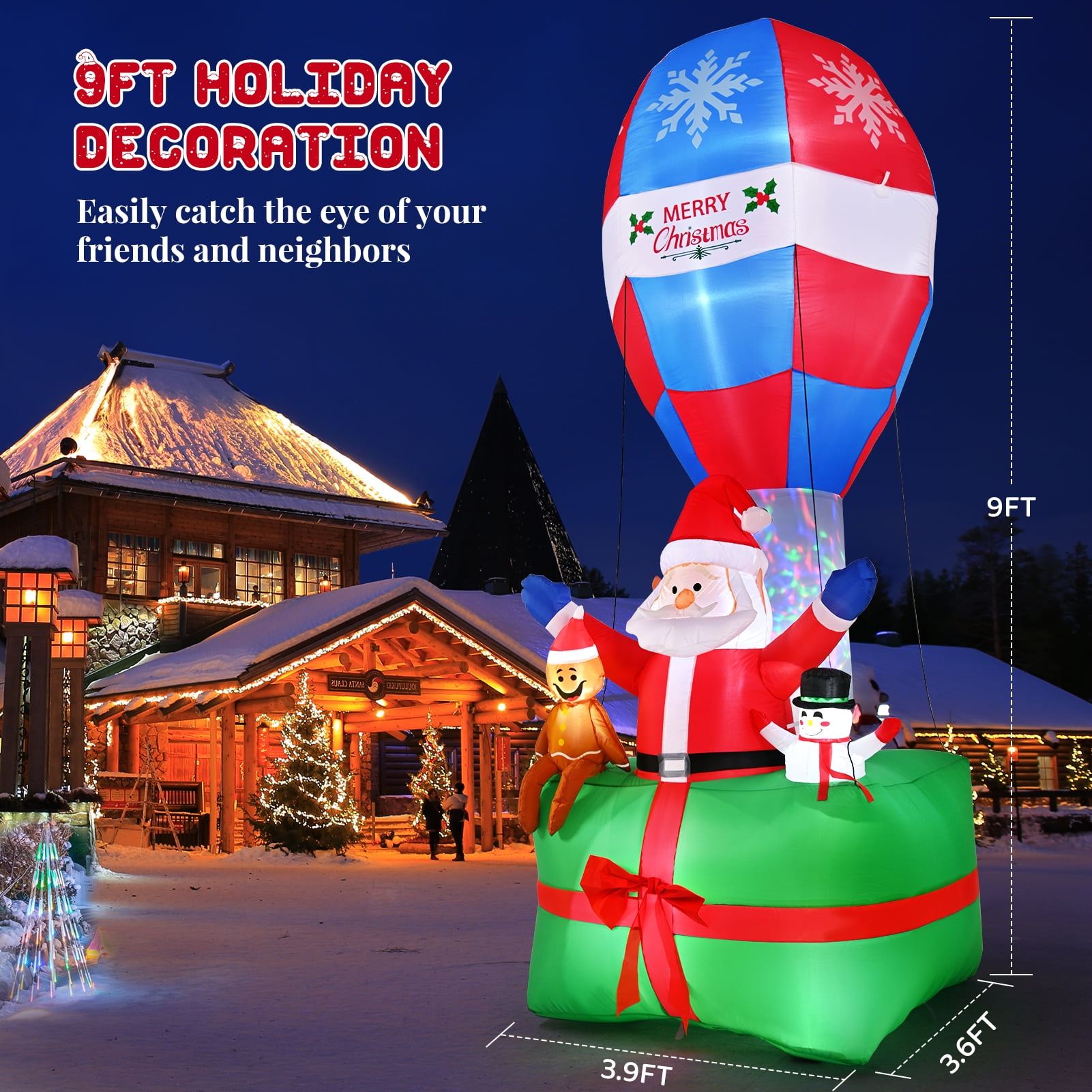 【Unique and Memorable Christmas Gift】 9FT Christmas inflatable decorations with eye-catching colors will light up yard while adding a beautiful and joyful holiday atmosphere for you and your family, Perfect for Christmas outdoor yard garden lawn decorations. With this christmas outdoor decorations, your courtyard will become a popular and fun photo spots! 【7 Sets of Extra Bright LED lights】 Build-in LED light and colorful design are the spotlight of this Christmas decorations. It will be visible even on the darkest night with these bright lights. Make your yard look attractive every night 【High Quality Durable Materials】 Our inflatable outdoor Christmas decorations are made of 210T water-proof materials, which is against rips and tears, weatherproof and fade resistant. The excellent stitching improves the durability of the Christmas yard decorations, keep in good condition for next Christmas 【Easy to Inflate with Powerful blower】 Setup is super simple. Just plug it in, everything pops up in a minute. Santa, Gingerbread Man, snowman, gift boxes and balloon will self-inflate in minutes when the internal blower works 【Stable and Steady Enough】 No need to worry that the Christmas inflatables will fly away with the wind. This outdoor holiday decorations cames with 8 stakes and 4 ropes to hold in place if necessary, and the water bags increase the bottom stability.