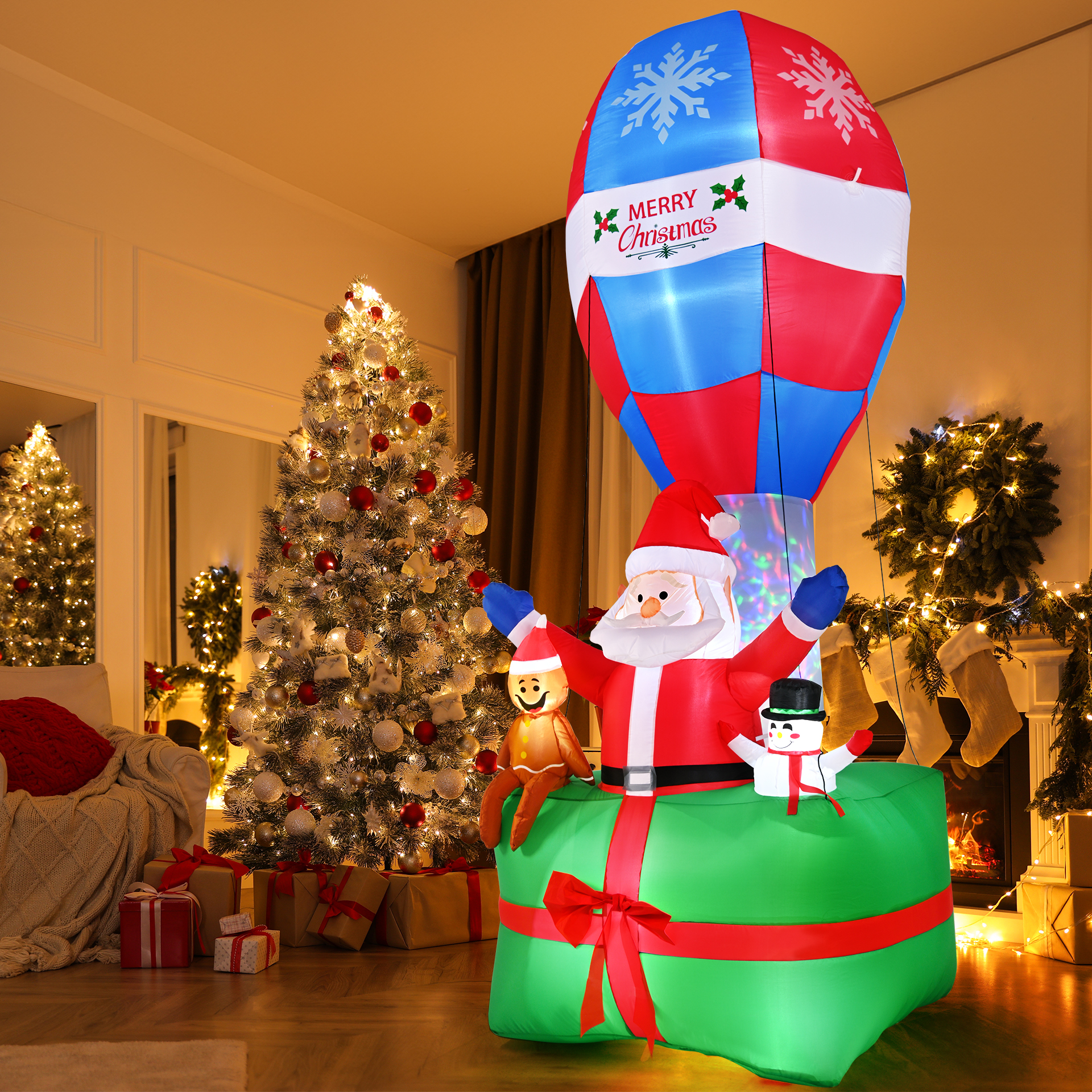 9Ft Christmas Inflatables Outdoor Decorations, LED Lighted Santa with Gingerbread Man and Snowman, Gift Box with Giant Balloon Blow Up Yard Decoration for Xmas The Christmas inflatables outdoor decorations are wonderful for yard decoration, home, lawn, holiday, Indoor Outdoor Garden Christmas Decorations. The festive atmosphere of Christmas will revolve around your family. Outdoor inflatable Santa Claus is made of durable polyester. CE and UL standard certified LED light and durable blower bring you strong Christmas atmospherewith your family. Spreading holiday cheer and inviting everyone to embrace the magic of the season. The snowmen and penguin adds a lovely touch to this decoration! Package Included: 1 x Christmas Inflatable Santa with Gingerbread Man and Snowman, Gift Box with Giant Balloon 8 x stakes, 4 x ropes, 2 x bags 1 x Plug with UL Certification 1 x Powerful Blower 1 x Gift Box Outside Christmas Decorations for Yard, Garden, Christmas Event, Shopping Mall
