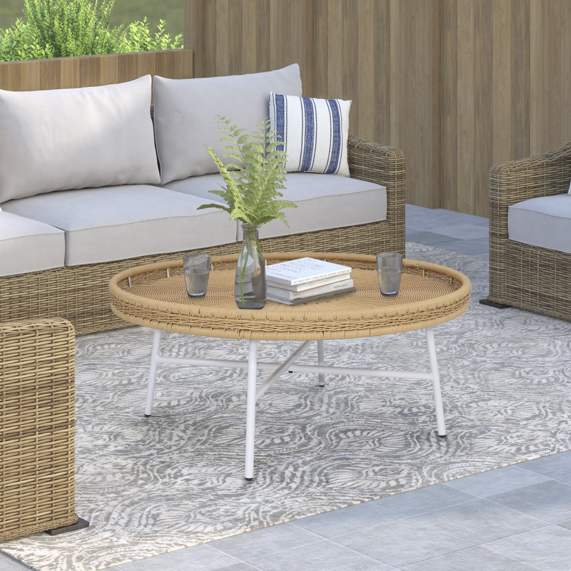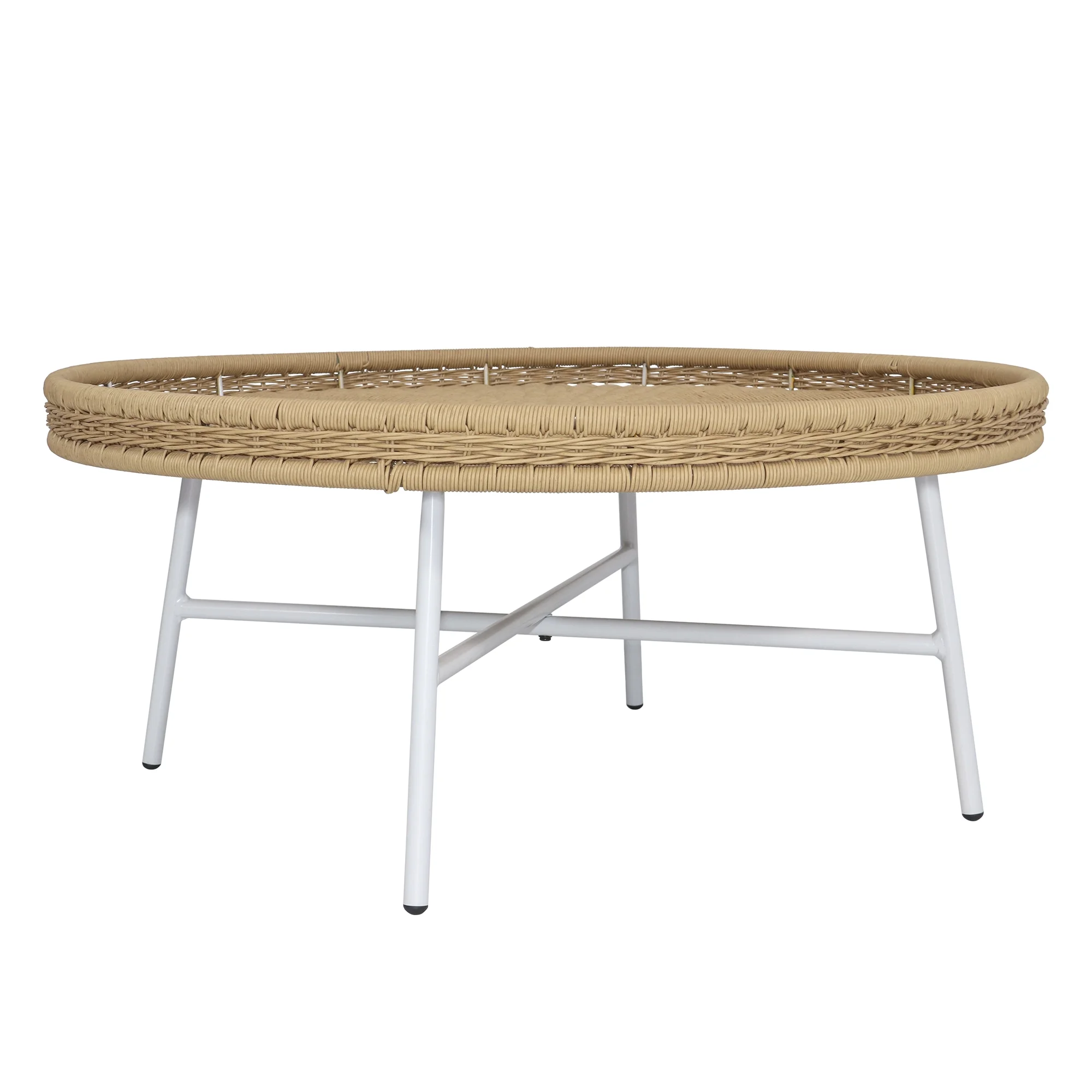 Abble Diameter 29.9 in. x H 17.7 in. Outdoor & Indoor Use Natural Color Wicker Round End Table with Matte White Metal Legs