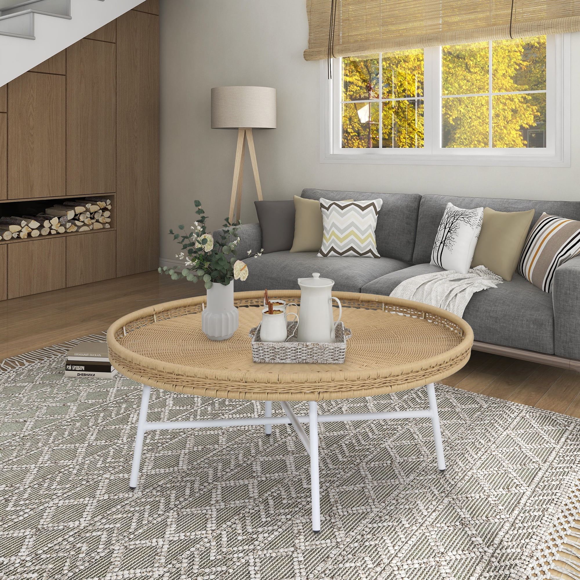 This Abble wicker coffee table and accent table is not only stylish but also offers outstanding function. Featuring a long-lasting woven wicker finish in round tray top with powder coated metal legs to support it. Elegant looks in perfect size for indoor or outdoor use, light weighted and easy to move to anywhere . There are two- color options for this round coffee table and end table :espresso color with matte black metal legs and natural color with white metal legs ,which are easy to match indoor or outdoor arrangement.