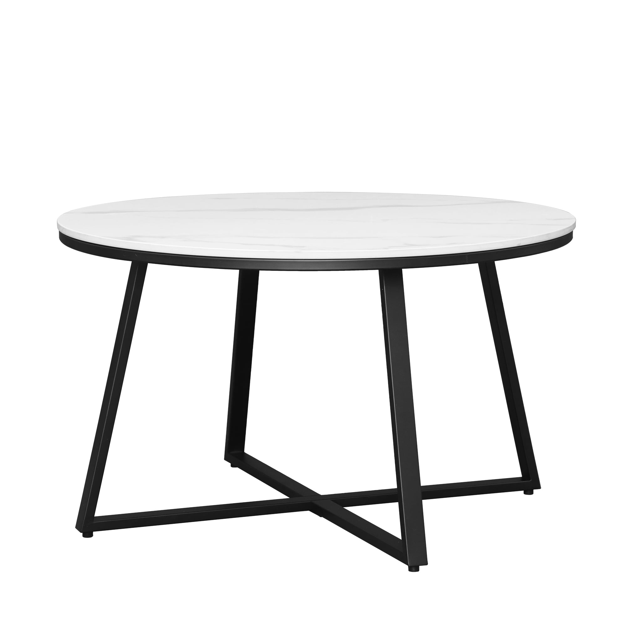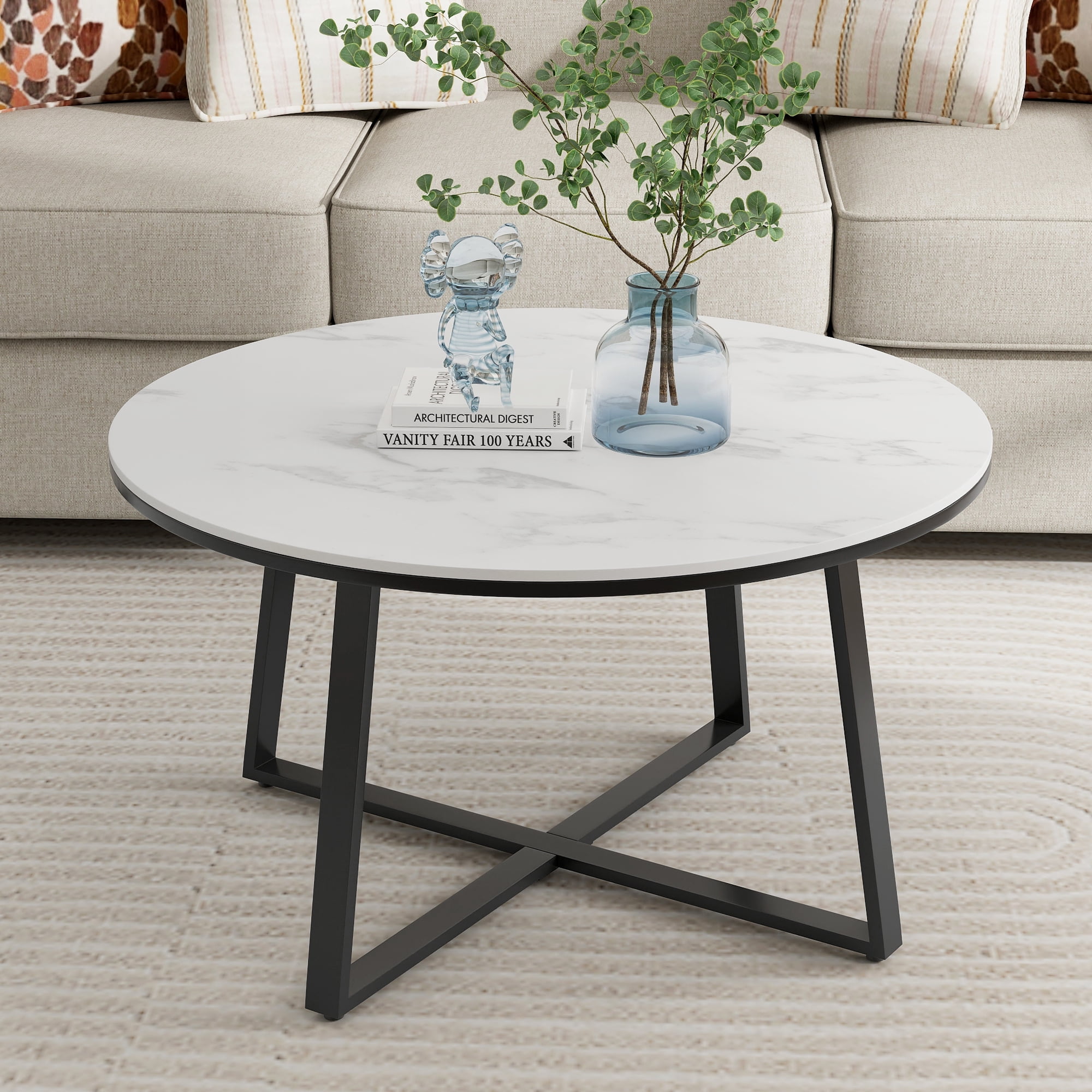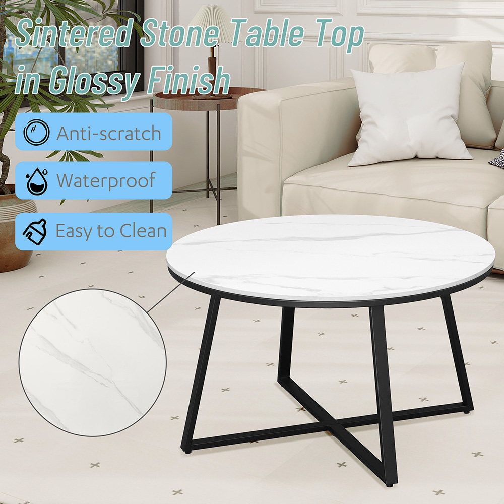 Abble 30″ Round Sintered Marble Stone Top Coffee Table, Cocktail Table with Black Cross Steel Legs
