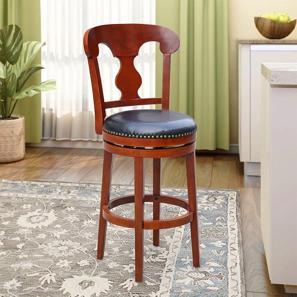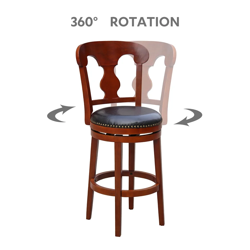 Swivel range: 360 degrees The frame of this bar stool is crafted from a blend of solid wood and engineered wood with natural wood knots. It features a full back, built-in footrest, nailhead trim, and a swivel capability. Seat Height: 30″ Upholstered with dark brown faux leather in walnut color wood finish, round seat for most comfortable seating experience. Natural wood grain color variation. Adult assembly required.